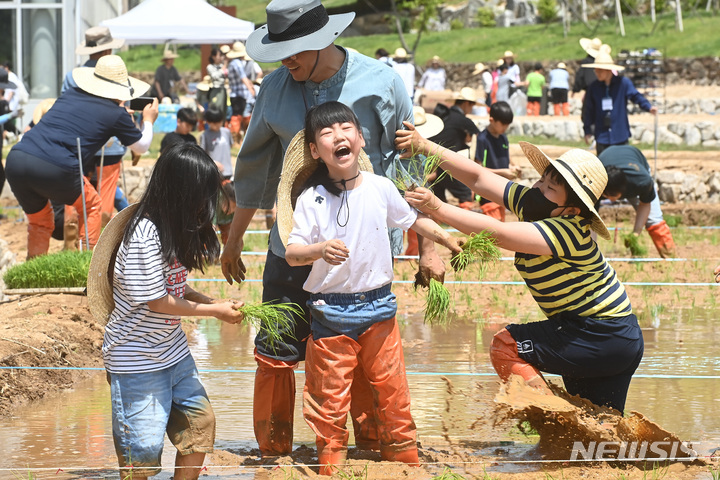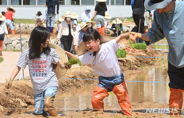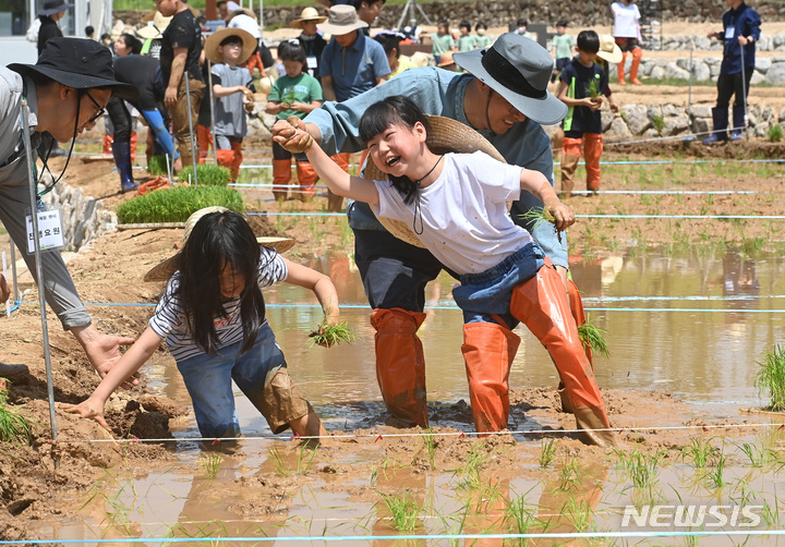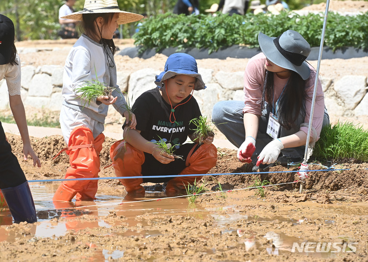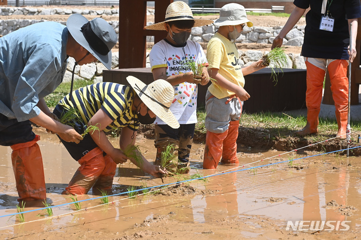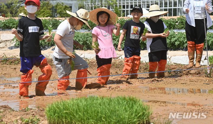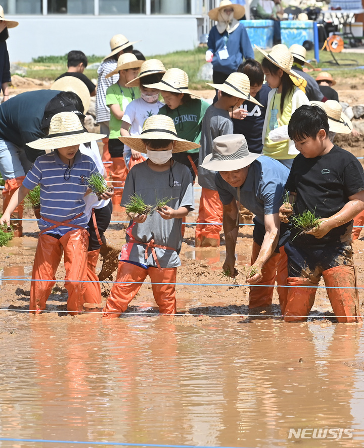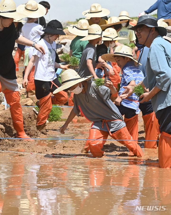 【NEWSIS】京畿道水原市の国立農業博物館と棚田で23日、九雲小学校の児童たちが「田植縄」を利用した伝統的な田植えを体験している。