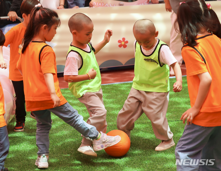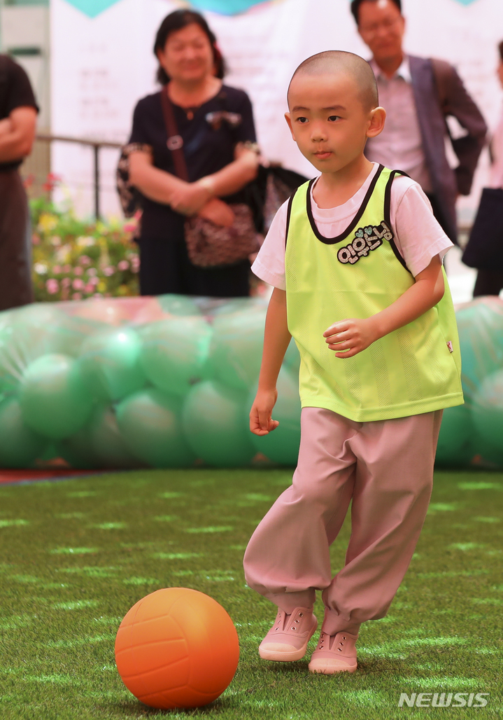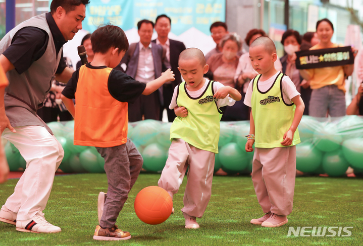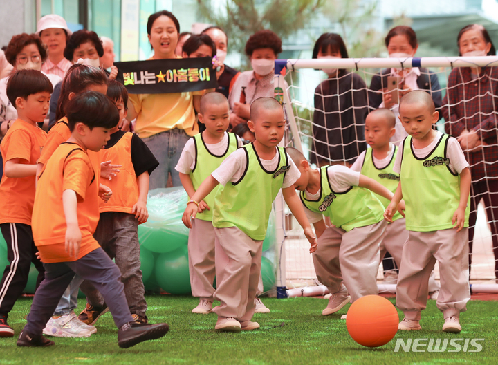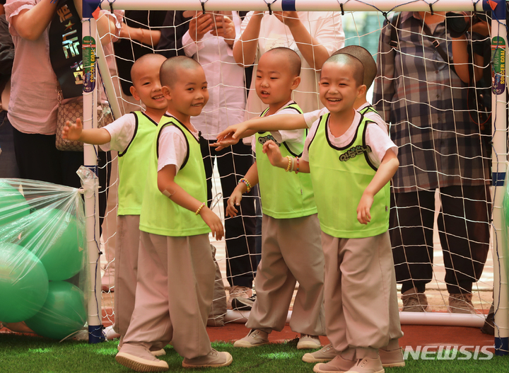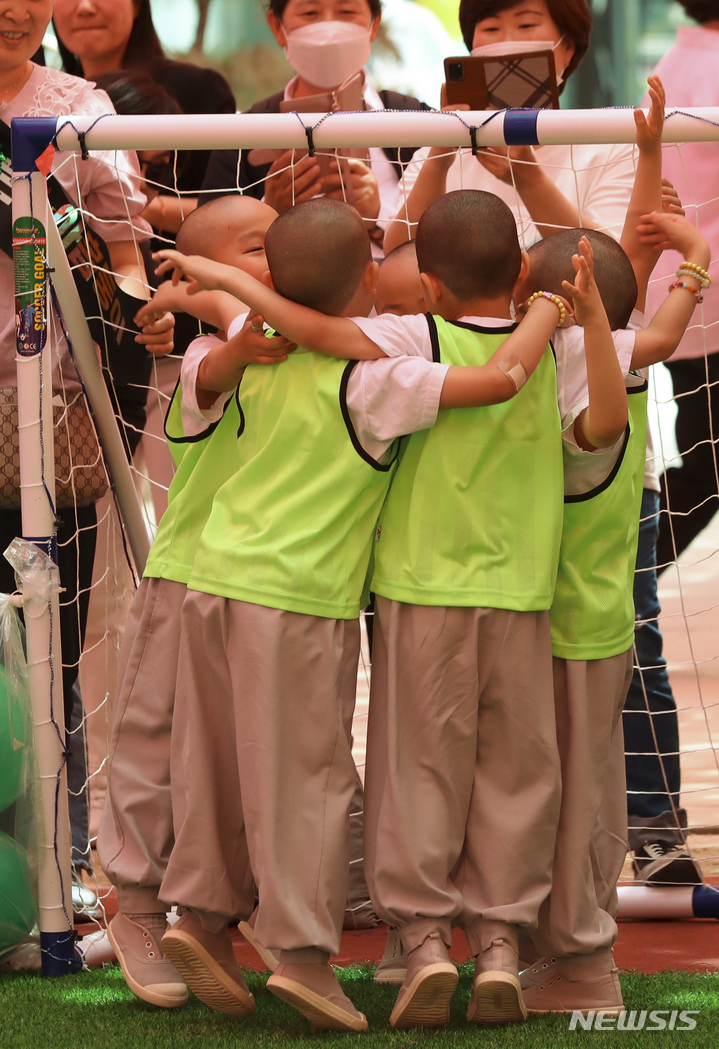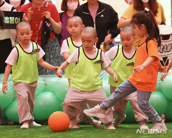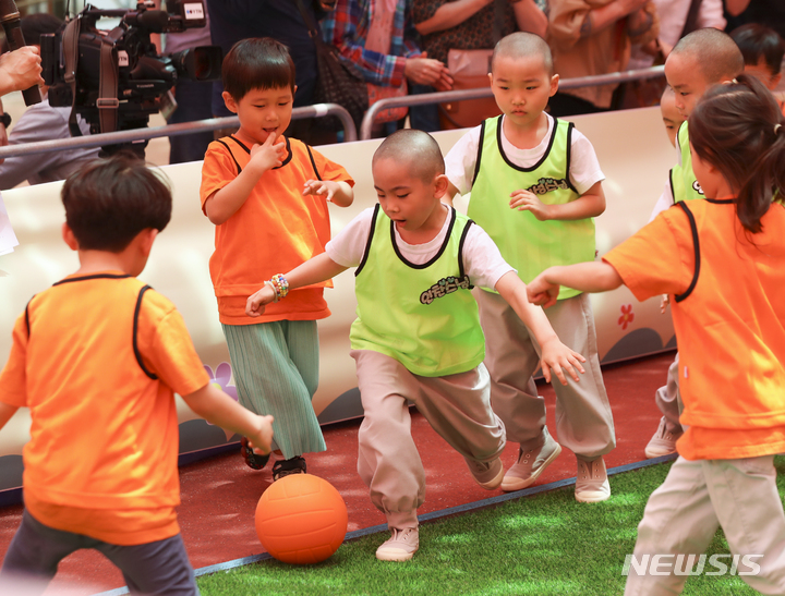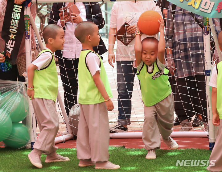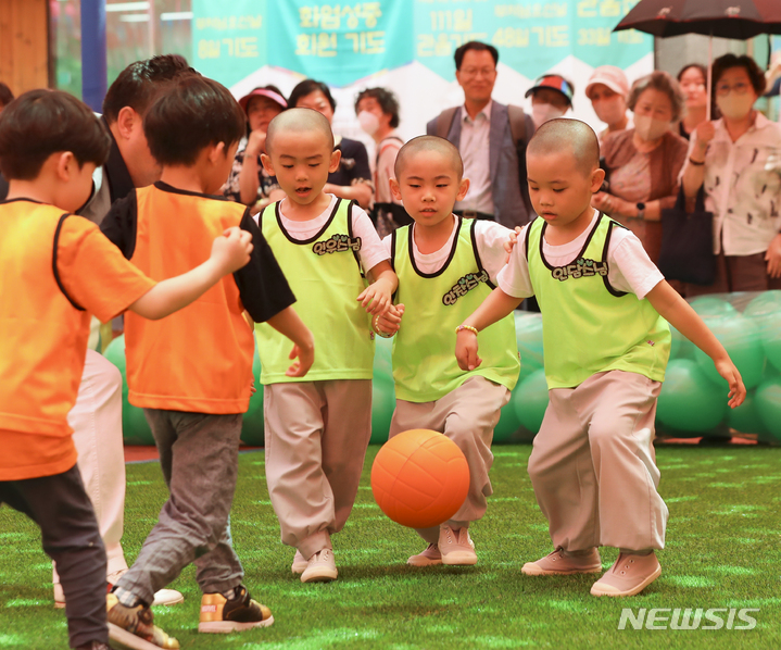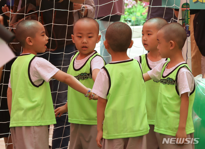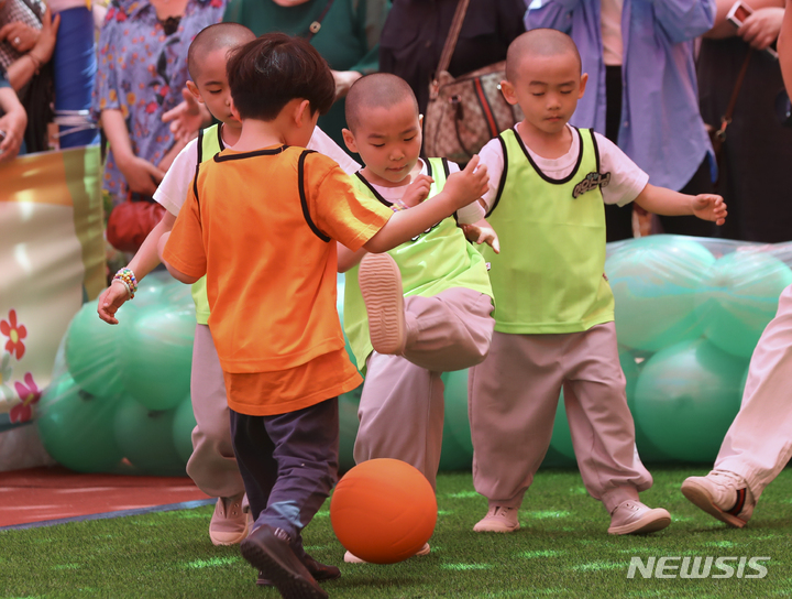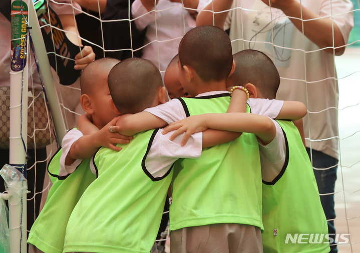 24日午後、ソウル市鍾路区の曹渓寺大雄殿前庭で開かれた「第1回曹渓寺天真仏杯子どもサッカー大会」で、童子僧らが試合をしている様子。