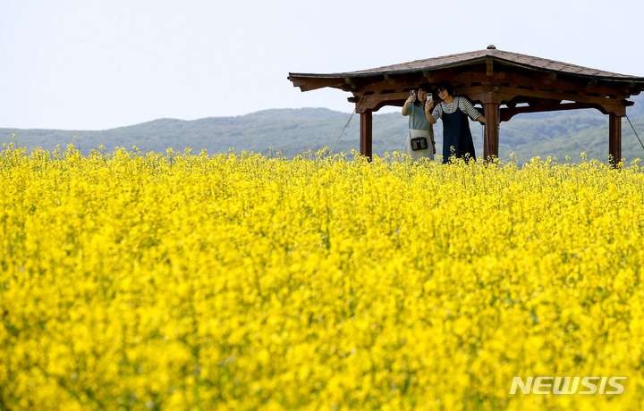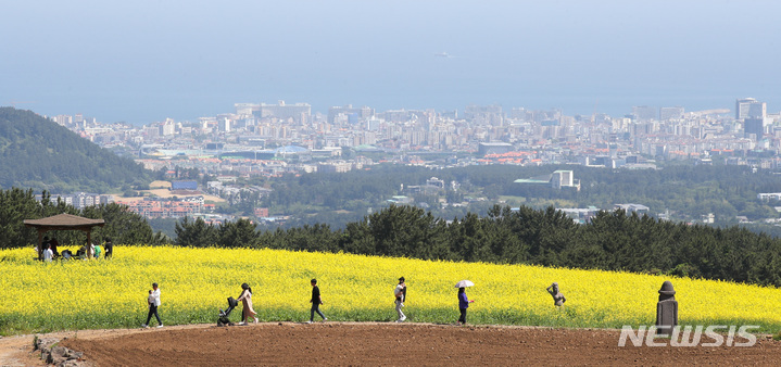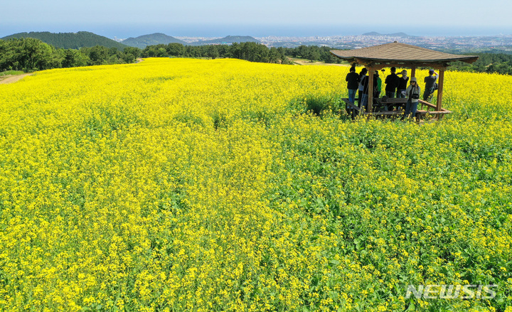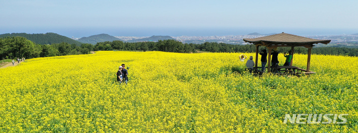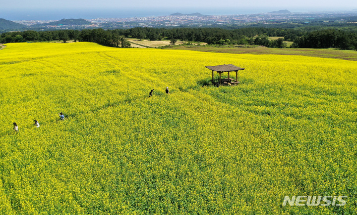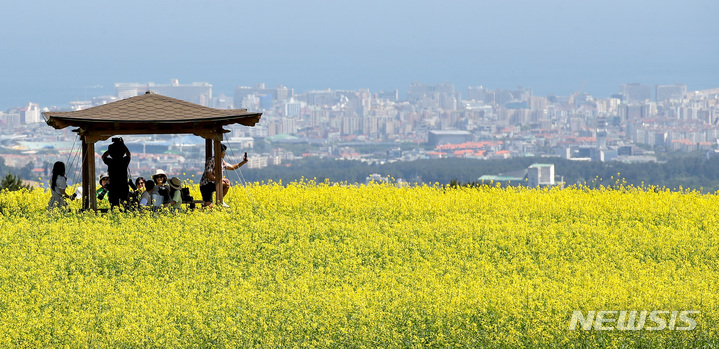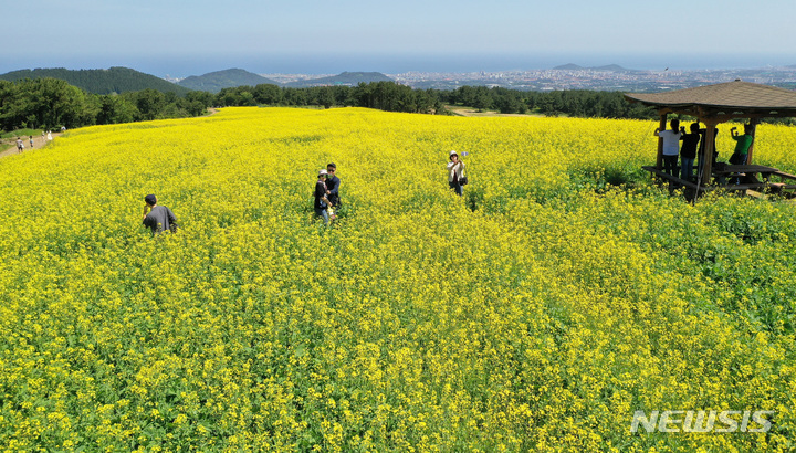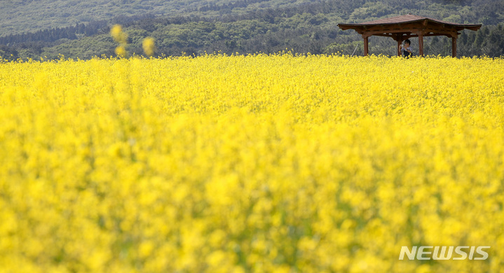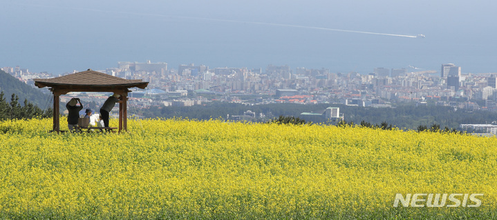 きれいな晴天となった25日午前、済州市吾羅洞の中山間地域に広がる野原では、春の花である菜の花が大きく花開き、視線を引き付けていた。