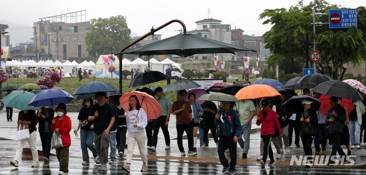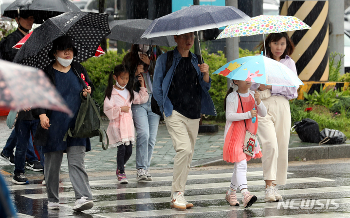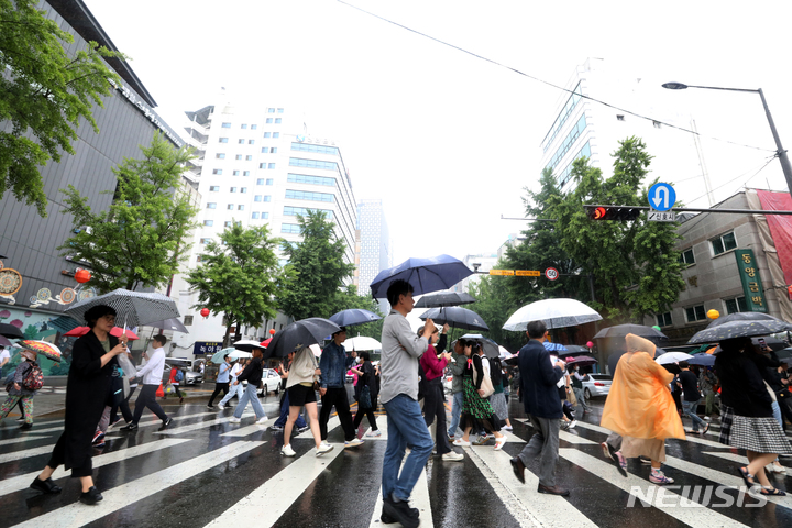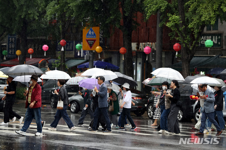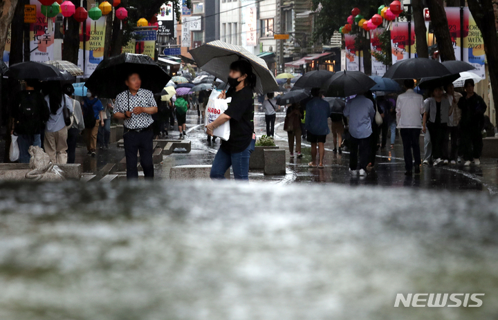 雨天となった27日午後、ソウル市鍾路区仁寺洞で、雨傘を差して足早に行き交う市民の様子。