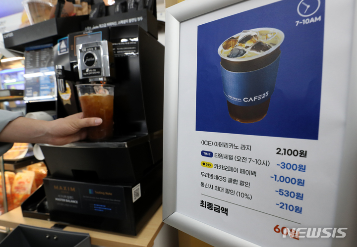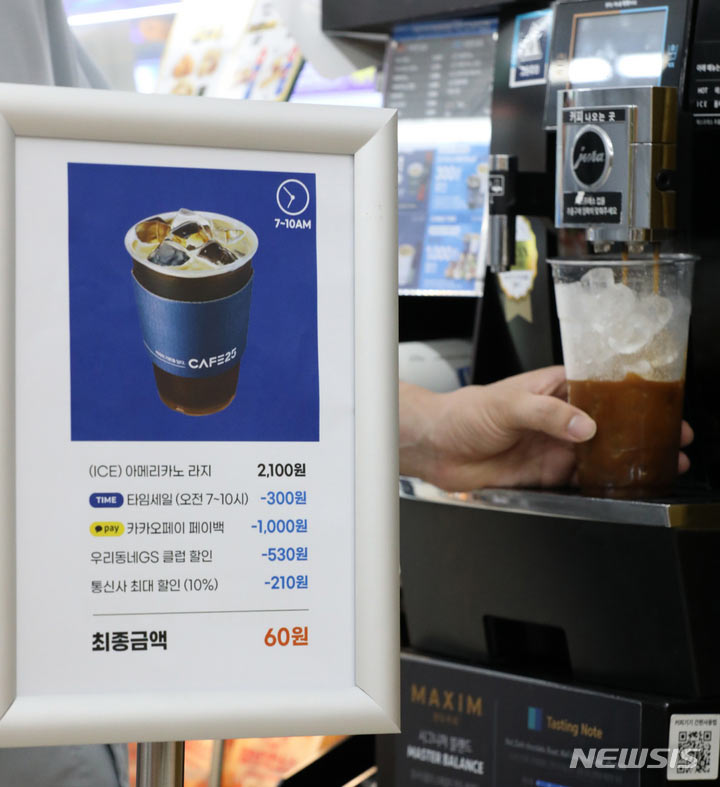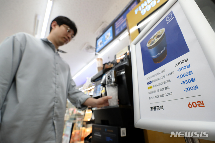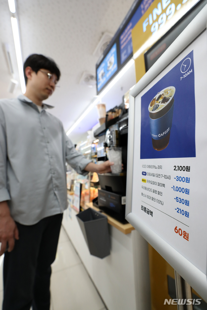 物価高の時代を迎え、コンビニエンスストア業界が「60ウォン(約6円)コーヒー」「350ウォン(約37円)弁当」など、コストパフォーマンスが高い自社ブランド(PB)商品を売り出し、価格破壊競争に乗り出している。写真は30日午前、ソウル市内のコンビニエンスストアGS25店舗で、来店客がコーヒーを購入している様子。