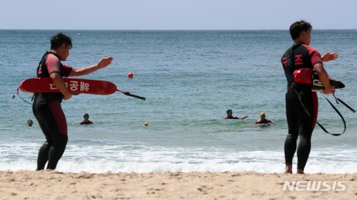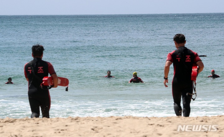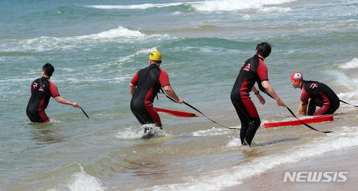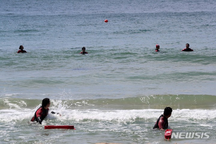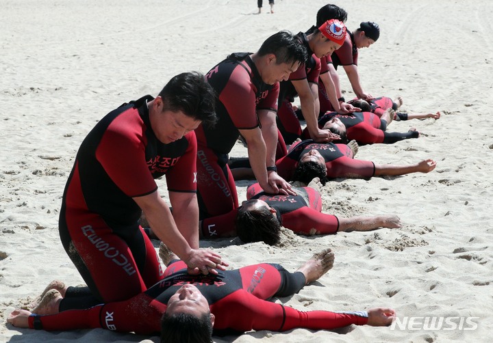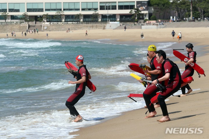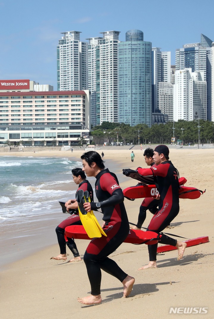 釜山市内の海雲台・松亭海水浴場の部分オープンを翌日に控えた31日、海雲台海水浴場で民間の水上救助隊員たちが最後の人命救助訓練を実施した。6月1日から部分オープンする海雲台海水浴場は観光案内所からイベント広場までの300メートルの区間、松亭海水浴場は観光案内所から複合利用ゾーンまでの150メートルの区間で海水浴を許可する。釜山の七つの海水浴場の全面オープンは7月1日だ。
