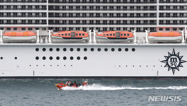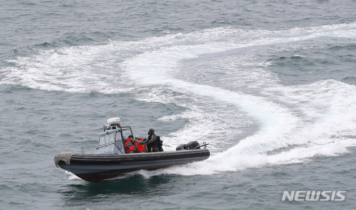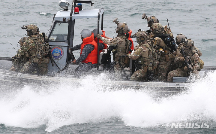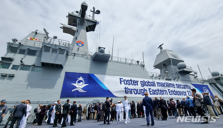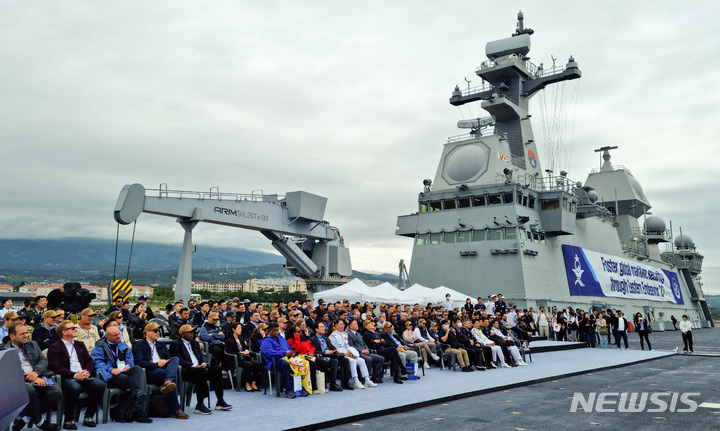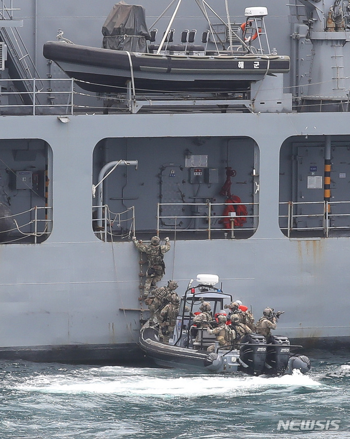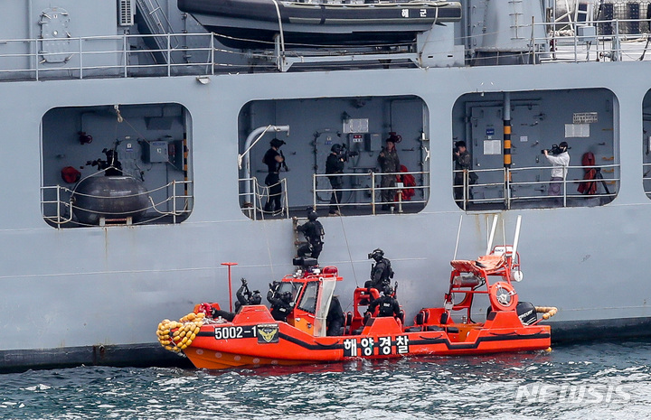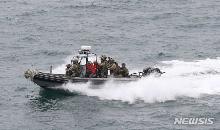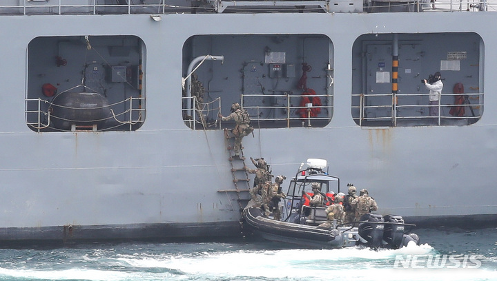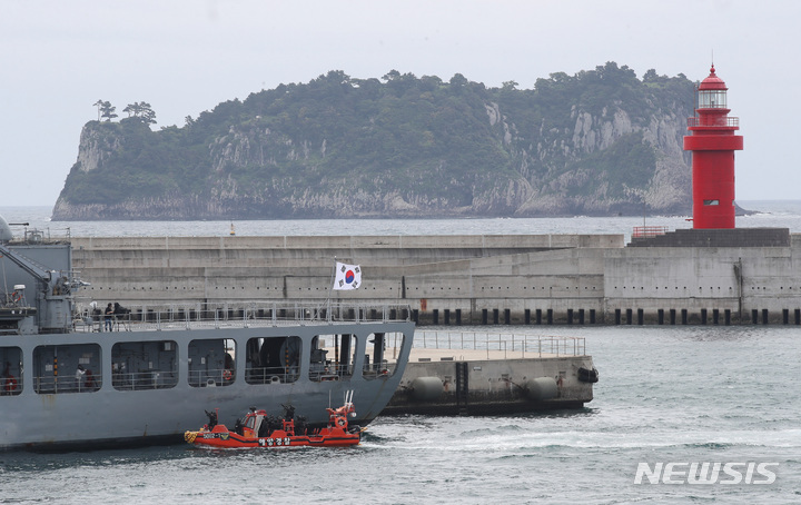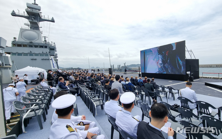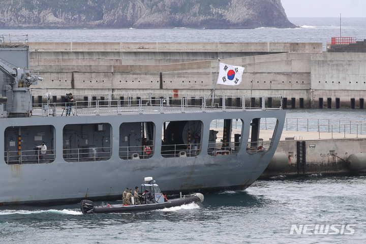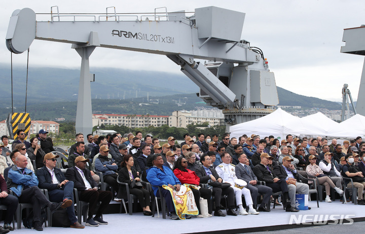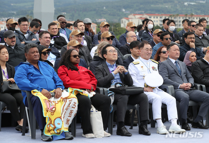 済州民軍複合港で31日午前、韓国と米国、日本、オーストラリアなどが参加するPSI(拡散防止イニシアチブ)多国籍海上略式手続き訓練が行われた。写真は、大量破壊兵器(WMD)拡散を阻止するためのPSI高官級会議出席者らが、韓国海軍の揚陸艦「馬羅島」艦上から訓練の様子を見守っている様子。