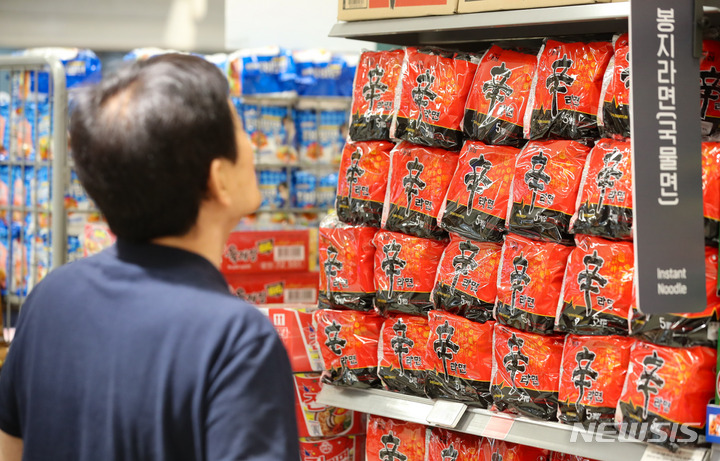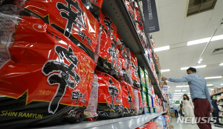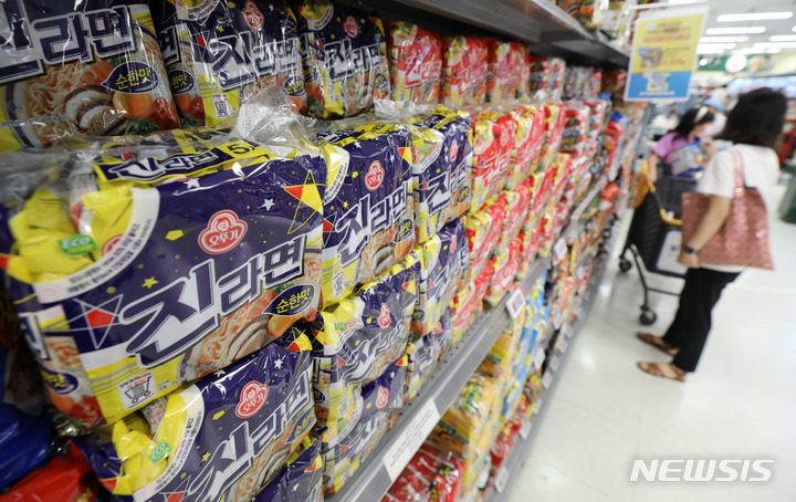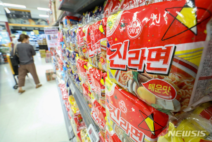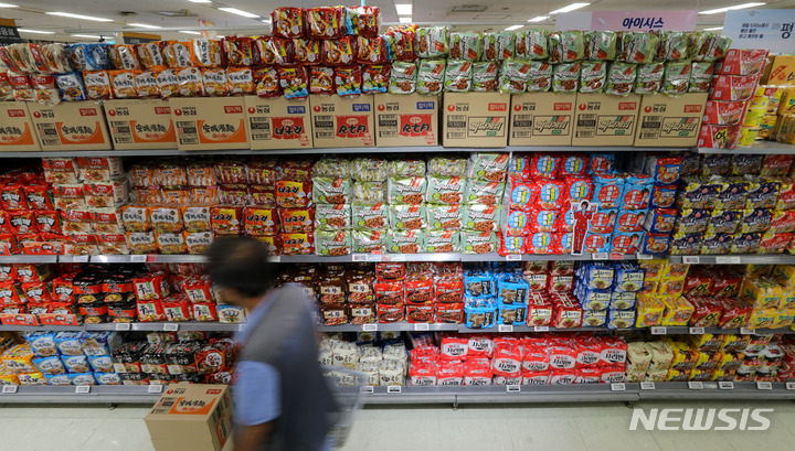 韓国統計庁が5日に発表した消費者物価動向によると、先月のラーメンの価格は昨年同月比で13.1%上昇し、世界金融危機が起きた2009年2月以来、14年3カ月ぶりの上昇幅を記録した。写真は5日、ソウル市内のある大手スーパーのラーメン売場の様子。