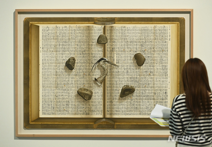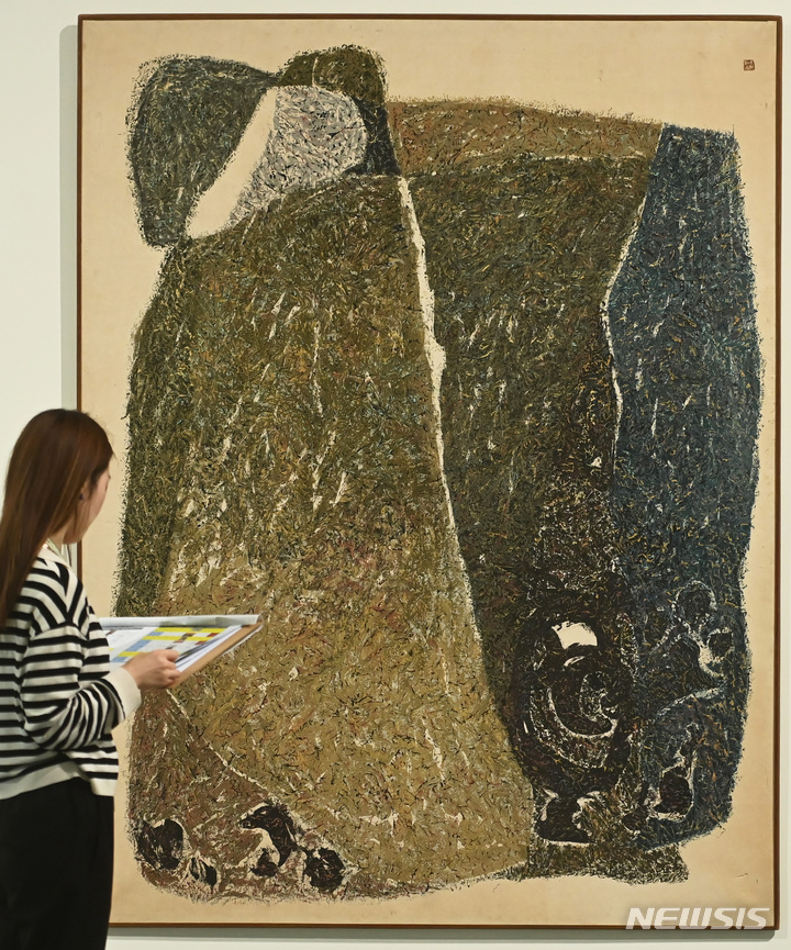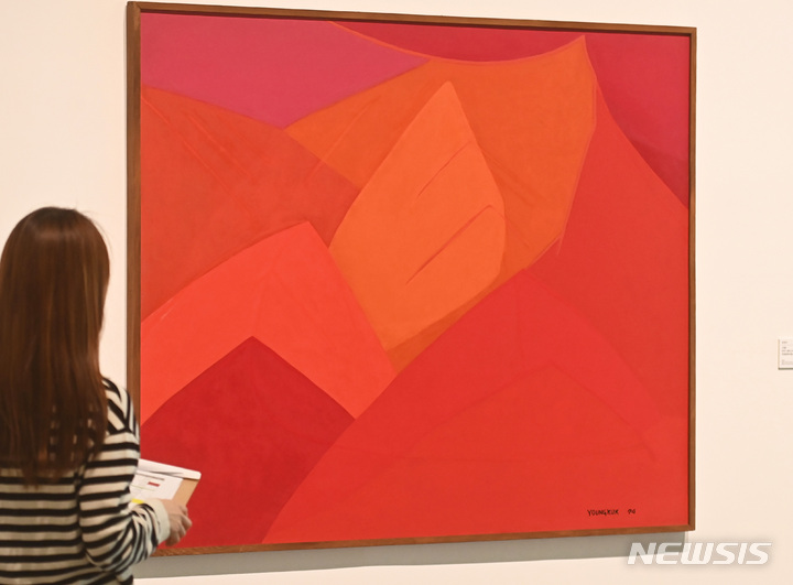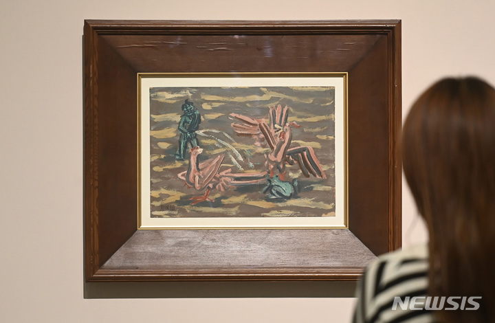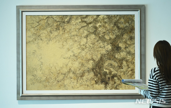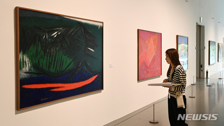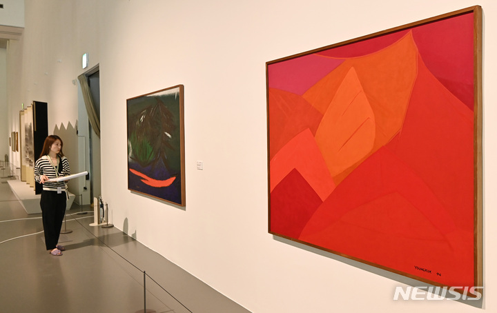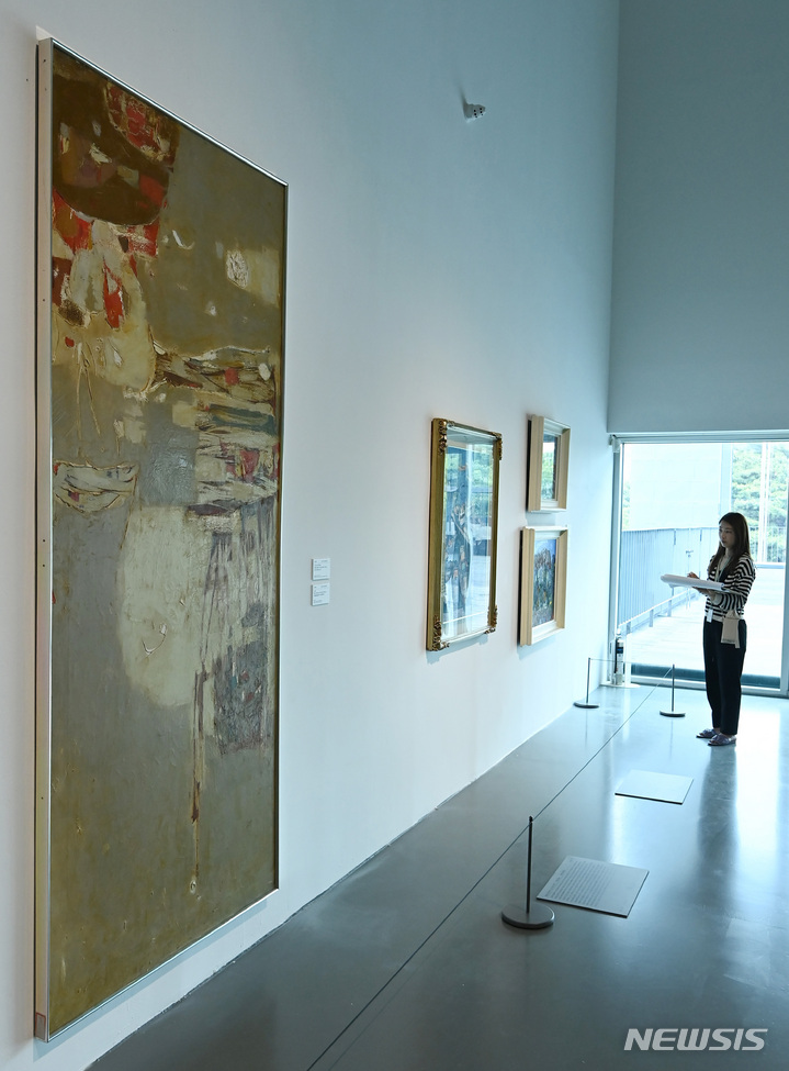 李健煕(イ・ゴンヒ)コレクション韓国近現代美術特別展「四季」の開幕をあすに控えた7日、京畿道安山市の京畿道美術館で、展示作品を見て回る関係者の様子。今回の展示では、李健煕コレクションに含まれている作家の代表作を見て回ることができるように、国立現代美術館に寄贈された李健煕コレクション46点を中心に1927年から2010年までの作品90点を展示する。展示は無料で、今月8日から8月20日まで開かれている。
