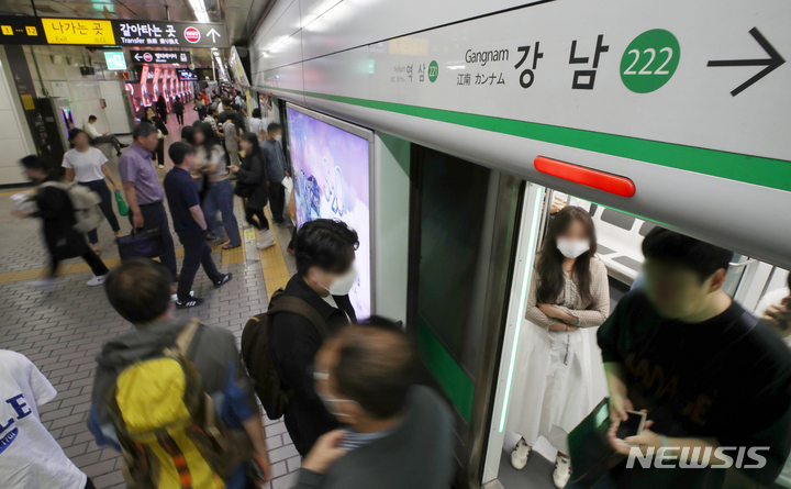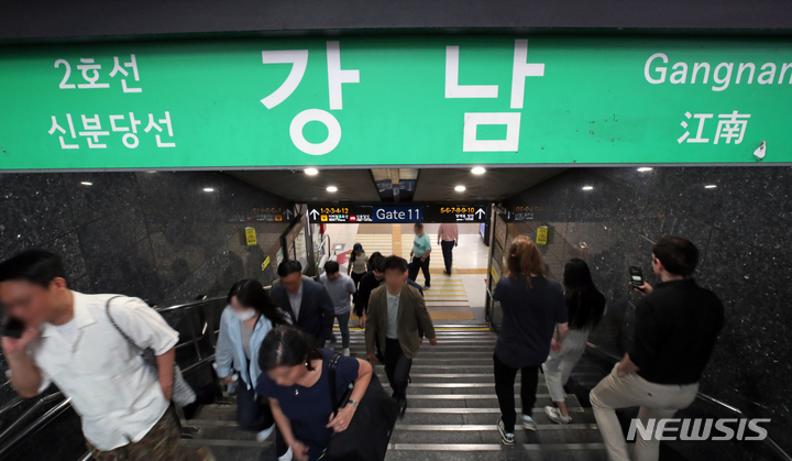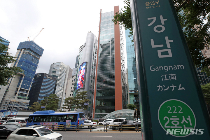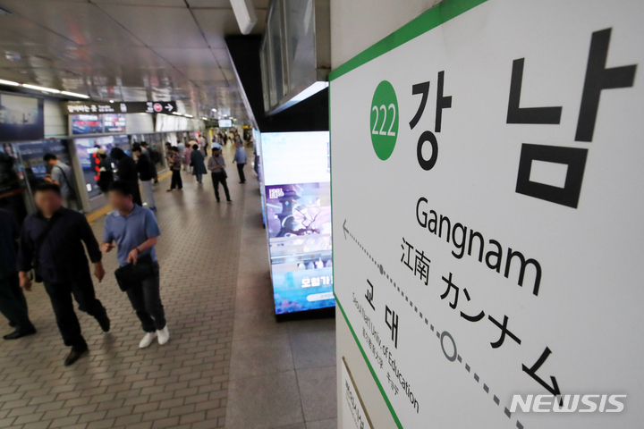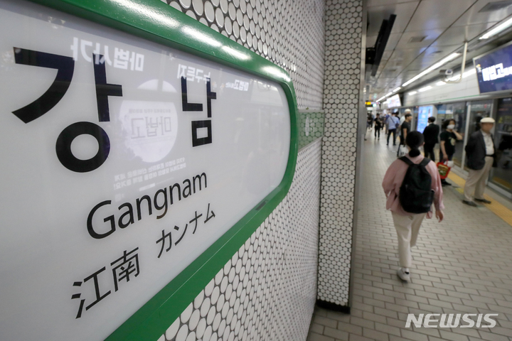 ソウル交通公社が、江南駅・聖水駅・新沙駅など30の地下鉄駅の駅名併記(ネーミングライツ)有償販売入札を行うと発表した。写真は8日午後、ソウル市江南区の地下鉄2号線出入口に設置されている駅名板の様子。