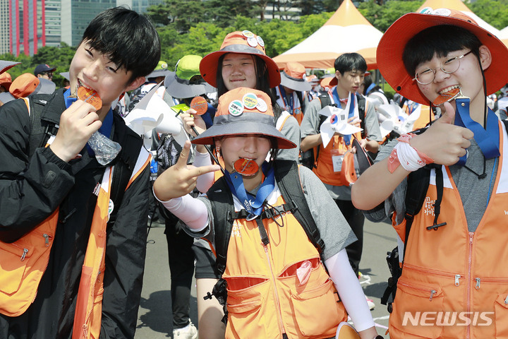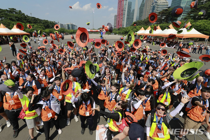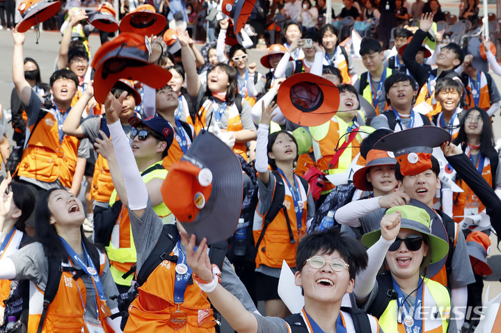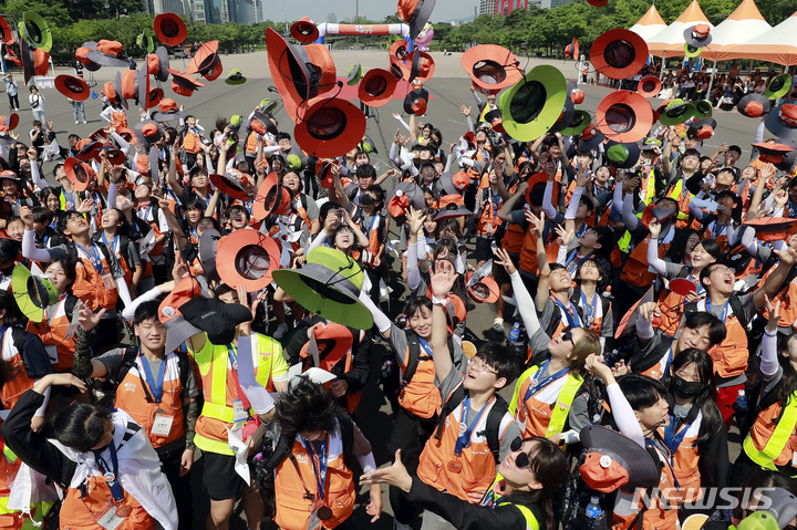 ワールドビジョン国土大長征の参加者らが9日、最後の目的地であるソウルの汝矣島公園に到着し、完走記念の帽子投げをしている様子。