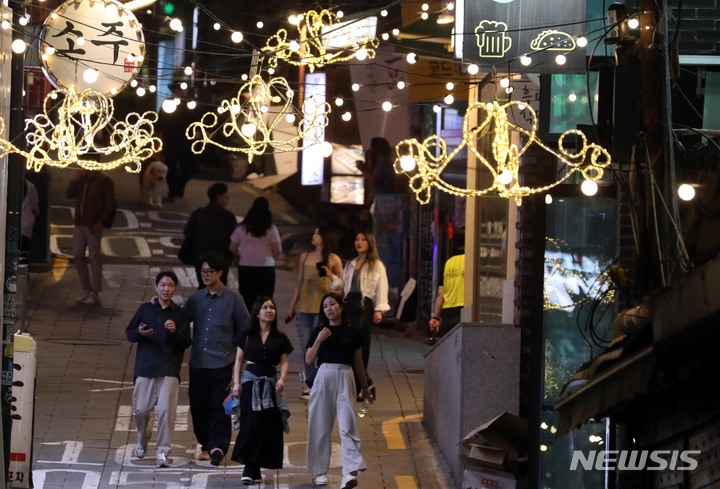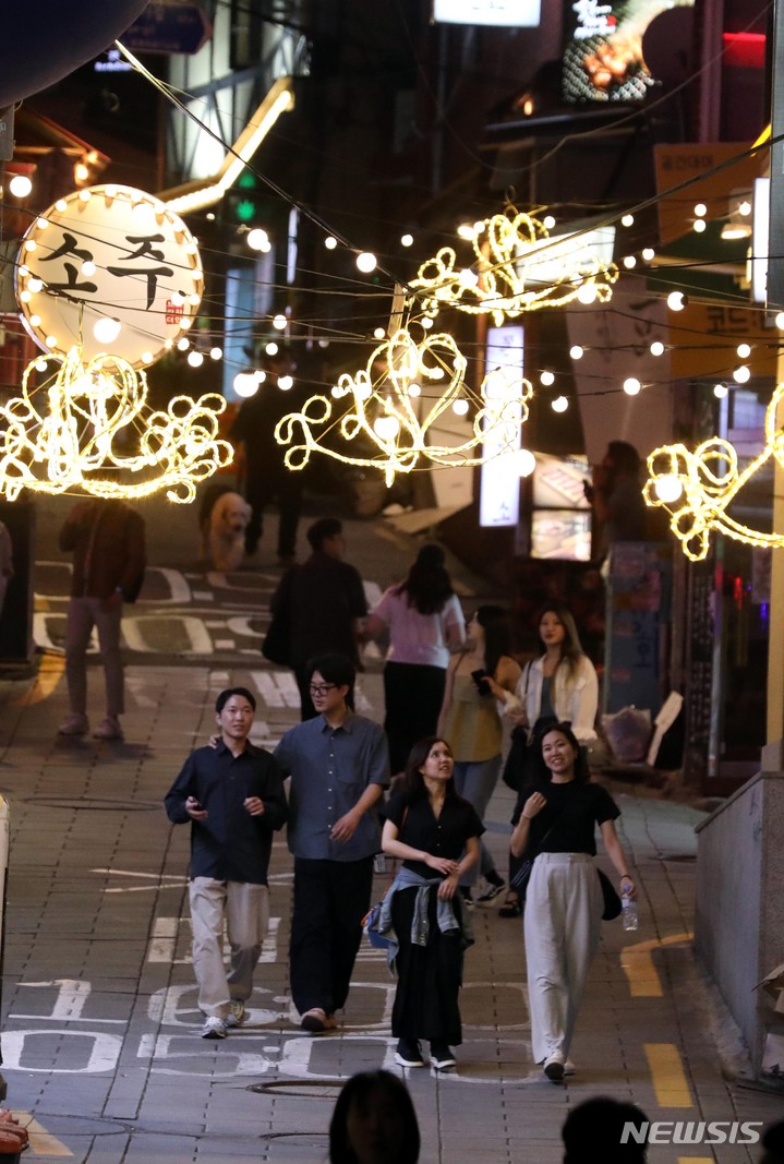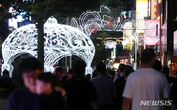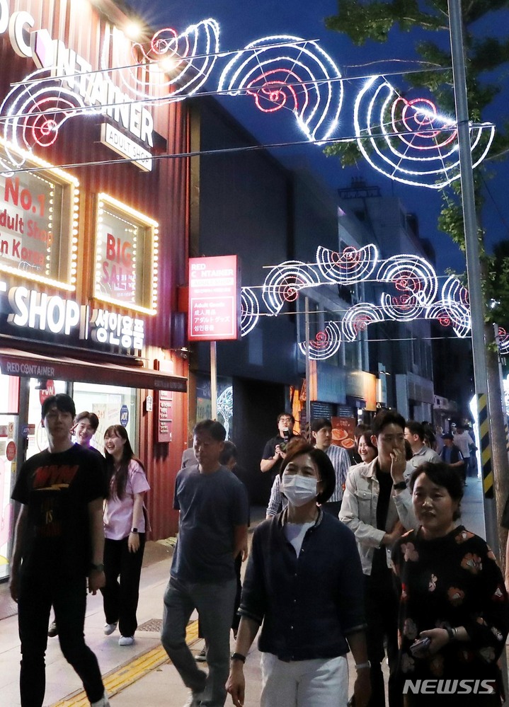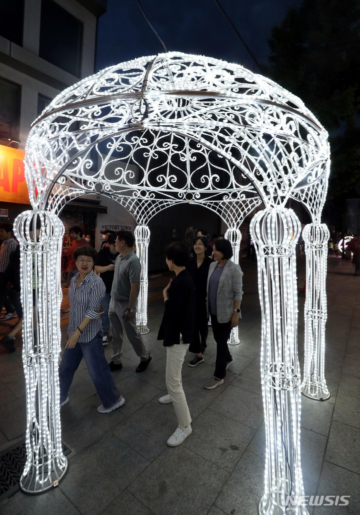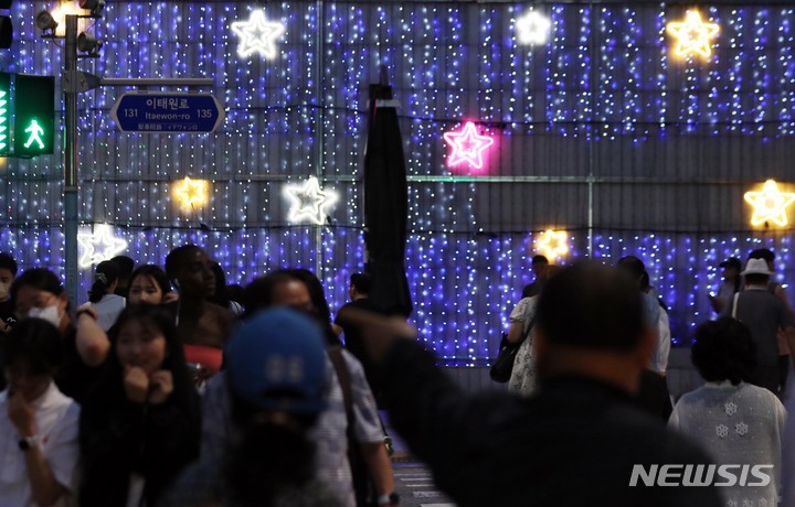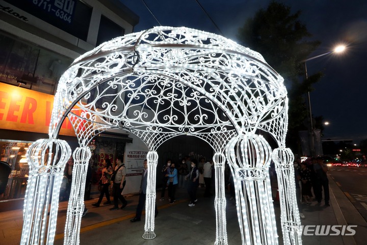 9日午後、ソウル市竜山区の緑莎坪駅広場から梨泰院駅にかけて設置された「梨泰院 光の通り」を歩いている市民の様子。