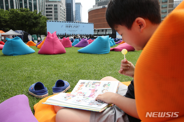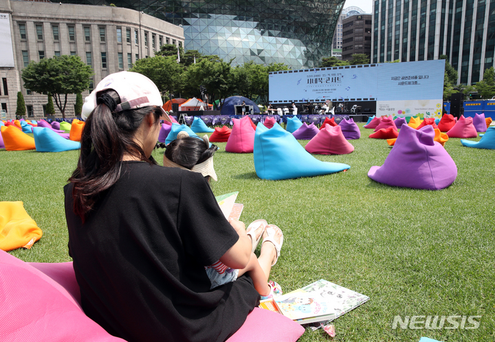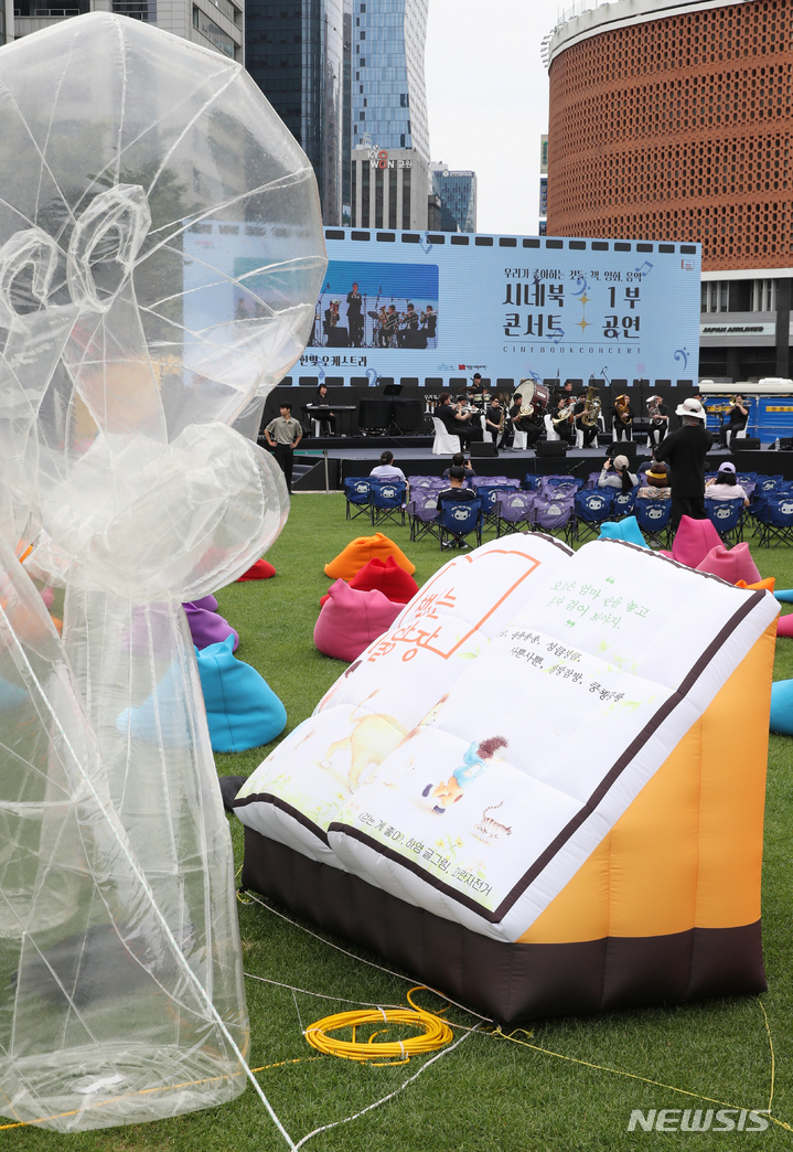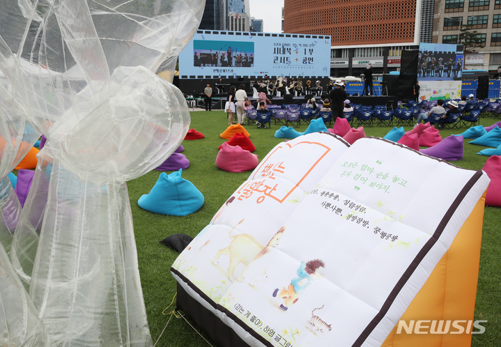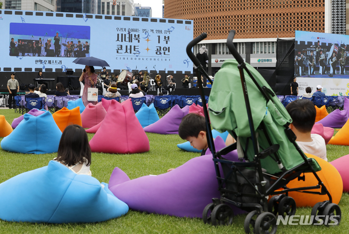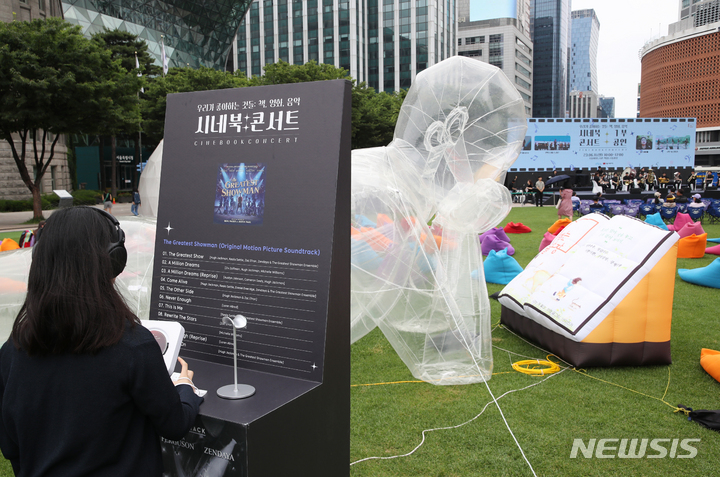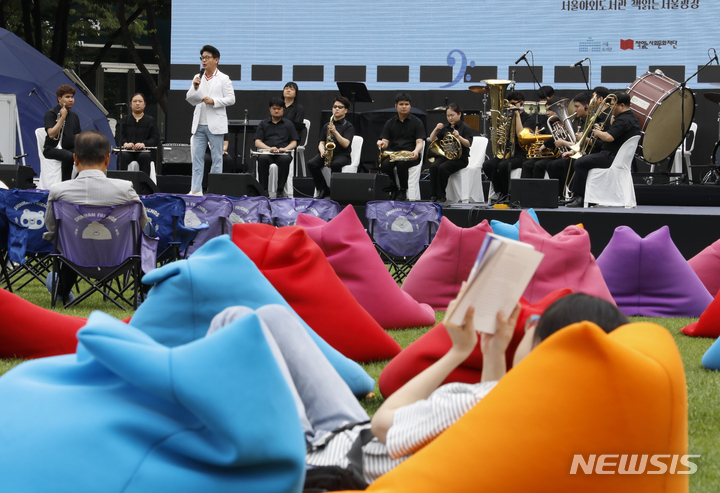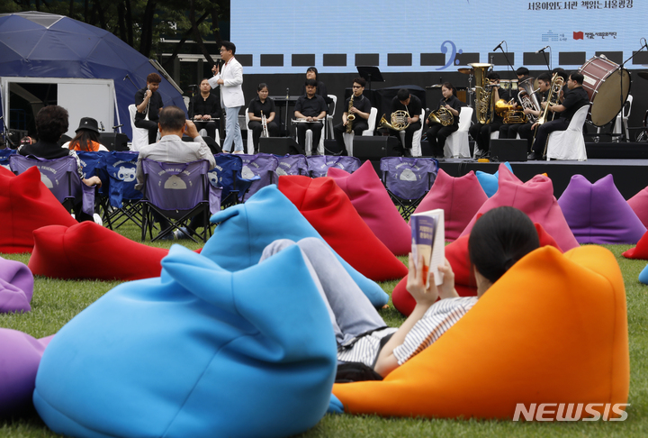 【NEWSIS】11日、「本を読むソウル広場」で開催された「シネブック・コンサート」で、コンサートと読書を楽しむ人々。