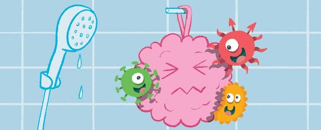 ぬれたシャワースポンジボールをお風呂場にかけっぱなしにしておくと、細菌が繁殖して皮膚疾患を起こす恐れがある。ベランダなど風通しの良いところで乾かしてから使った方がいい。