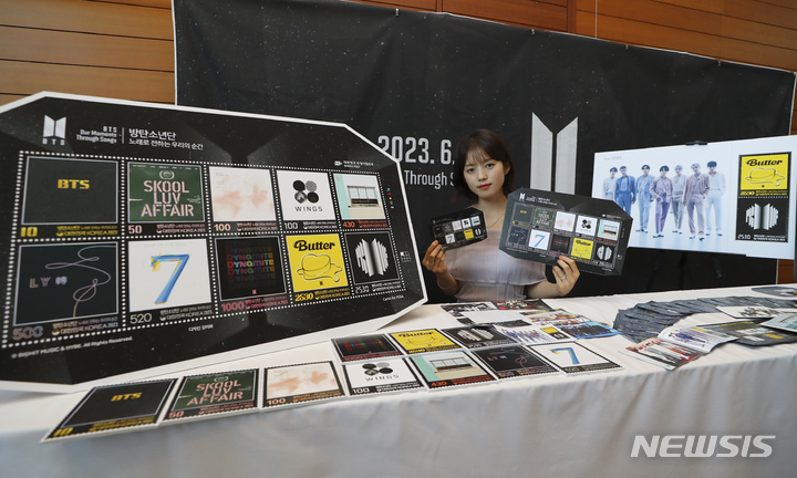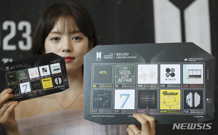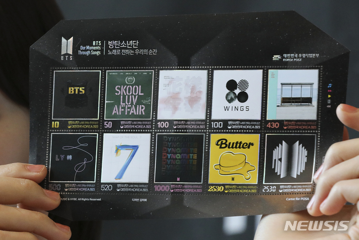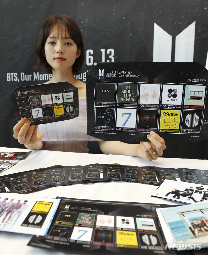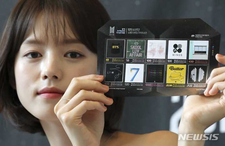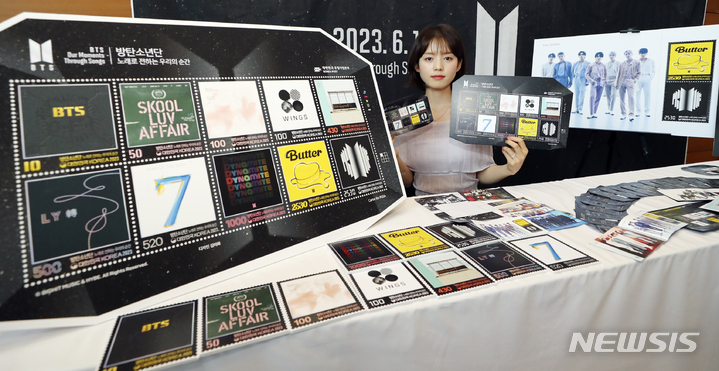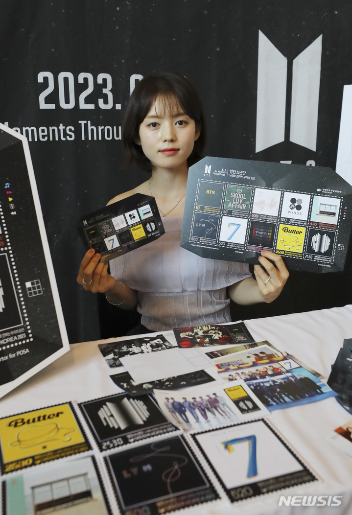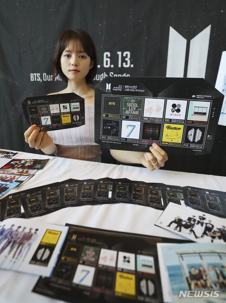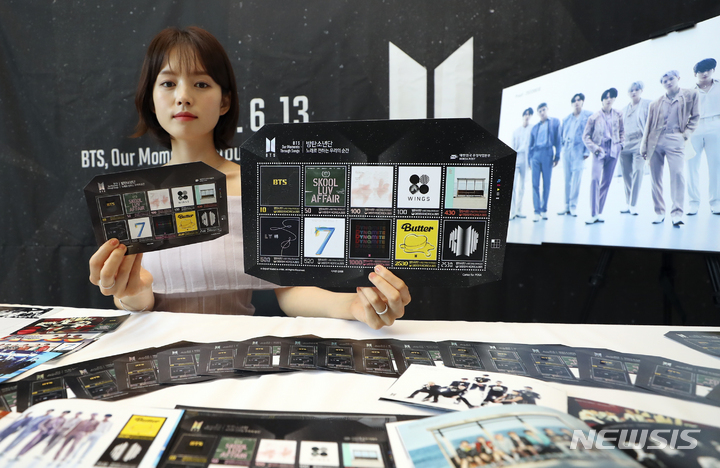 ソウル市中区のソウル中央郵便局で12日、コンパニオンらが防弾少年団(BTS)のこれまで10年の歴史を収めた記念切手を紹介した。
