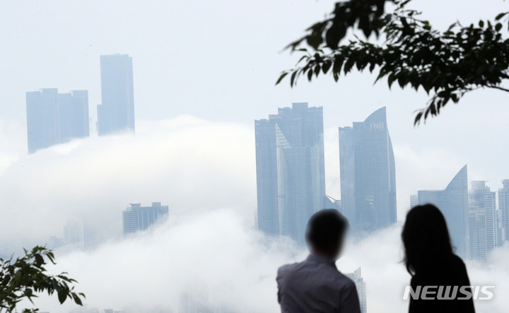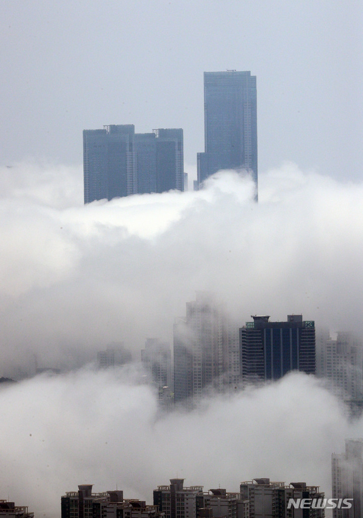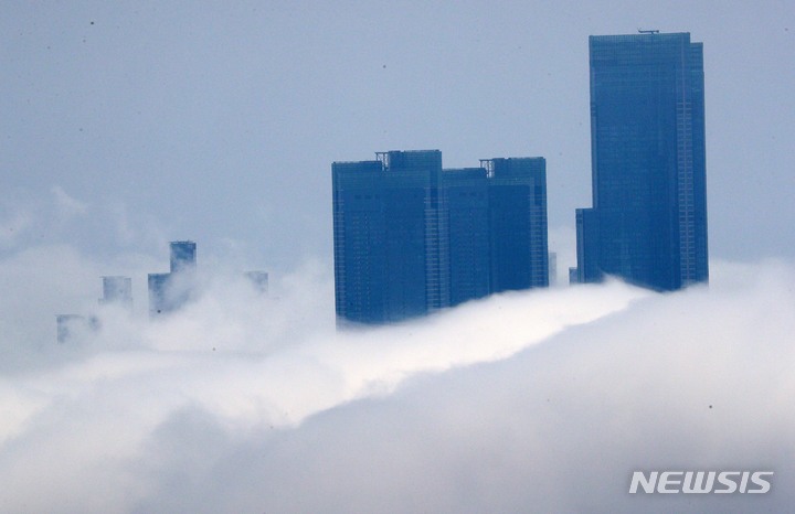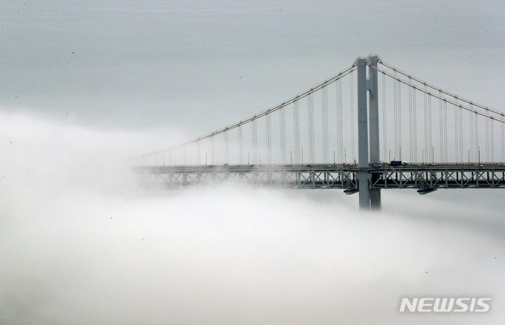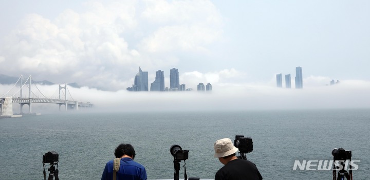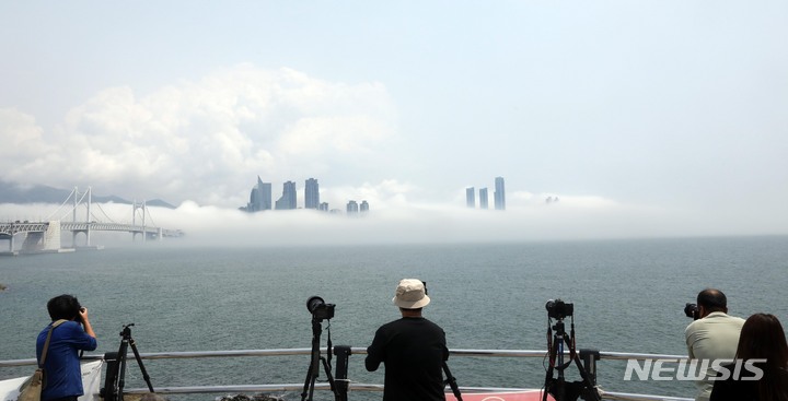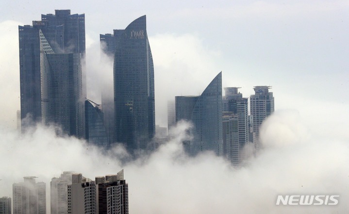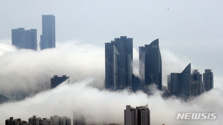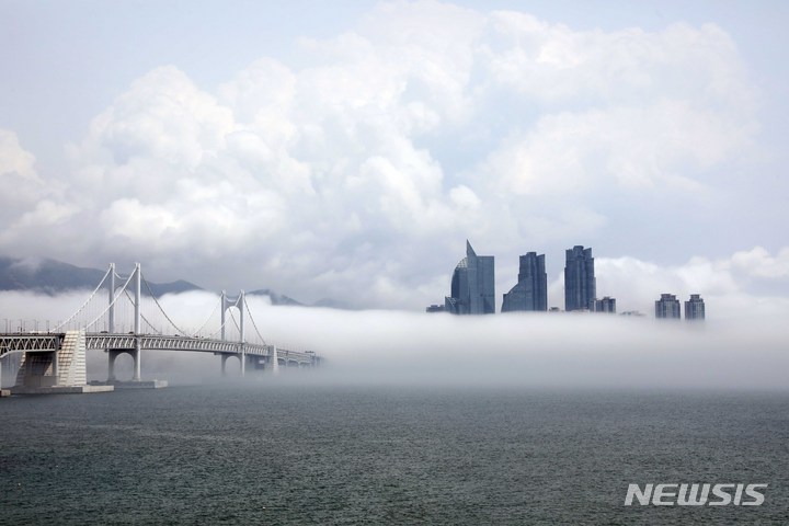 12日、釜山市海雲台区一帯が濃い海霧に覆われ、壮観を演出している。
