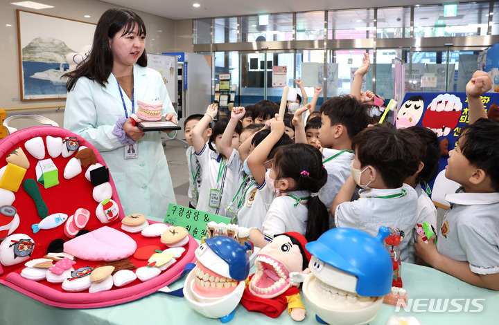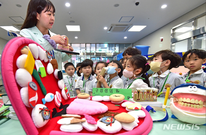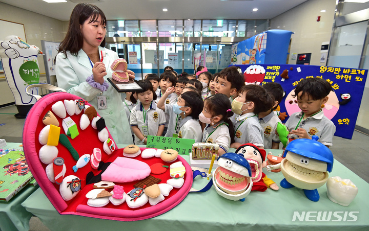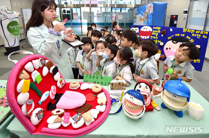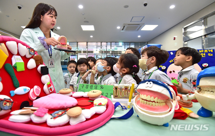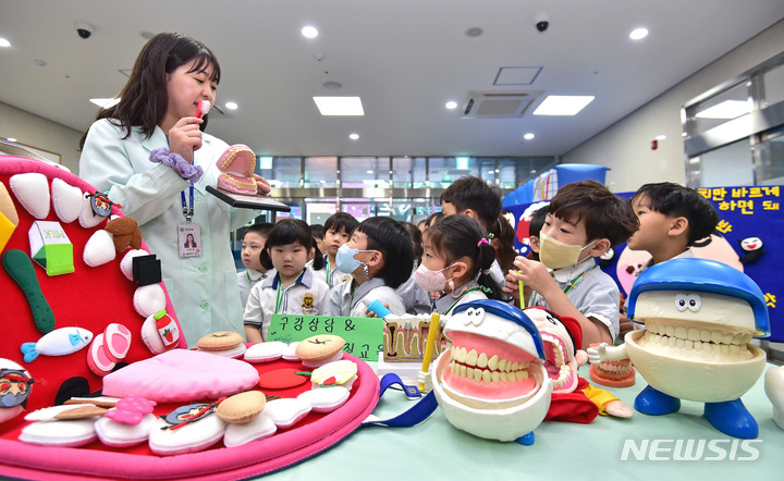 大邱市中区保健所で12日、職員が管内のオリニチプ(民間保育施設)の園児を対象に、正しい歯磨きを教育している様子。