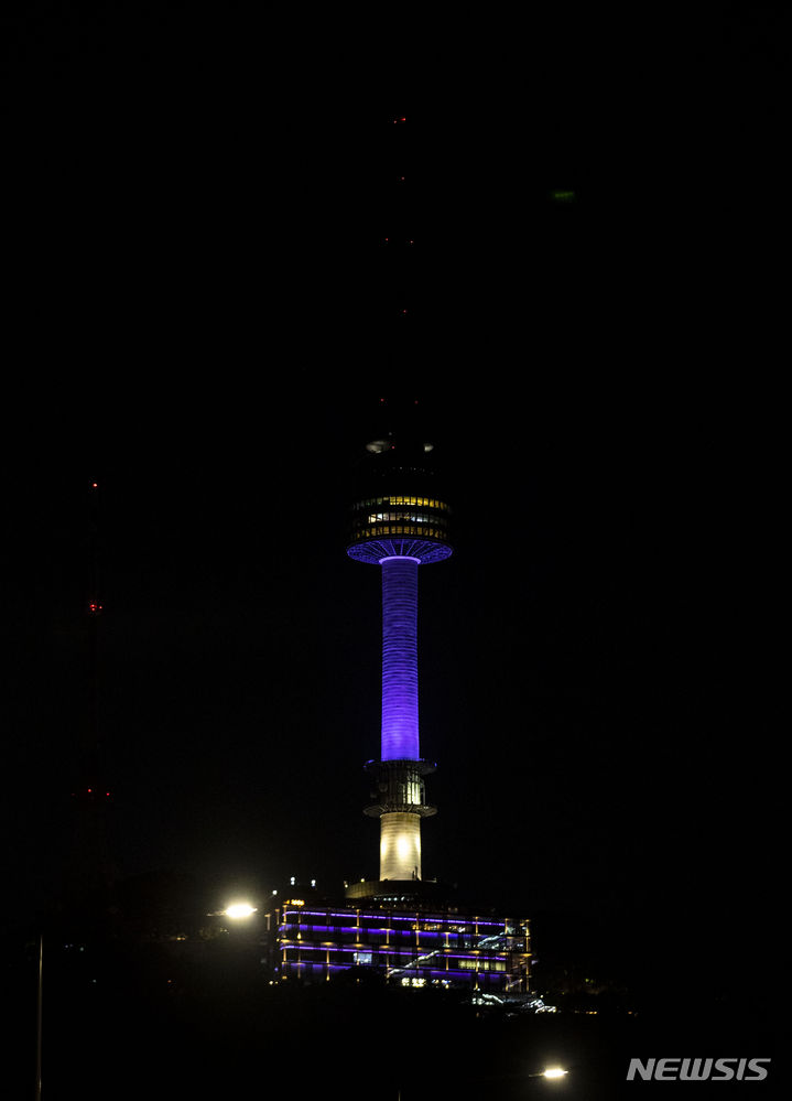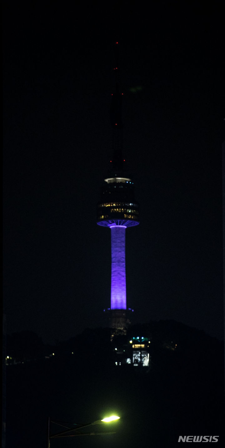 【NEWSIS】世界的な人気を誇る韓国の人気男性アイドルグループBTS(防弾少年団)がデビュー10周年を迎える前日の12日、ソウル市中区のNソウルタワー(通称:南山タワー)がBTSのシンボルカラーである紫色にライトアップされた。