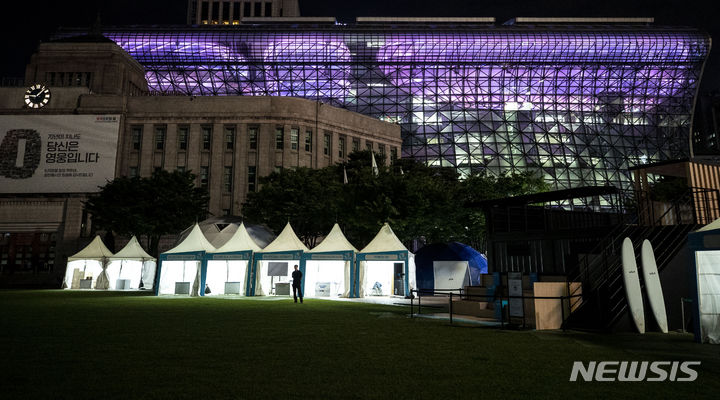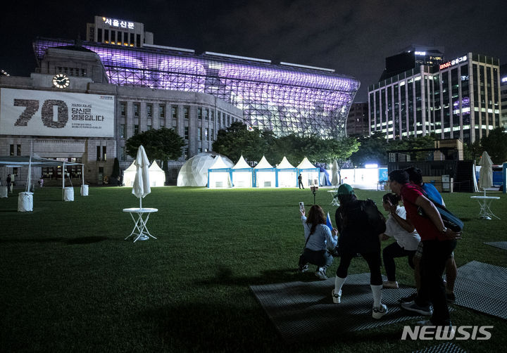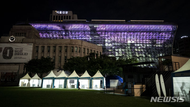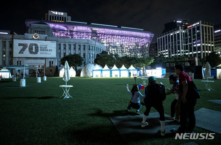 【NEWSIS】世界的な人気を誇る韓国の人気男性アイドルグループBTS(防弾少年団)がデビュー10周年を迎える前日の12日、ソウル市中区のソウル市庁庁舎がBTSのシンボルカラーである紫色にライトアップされた。