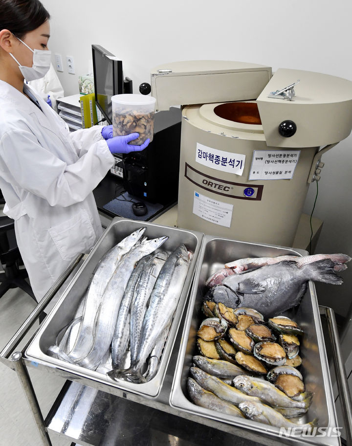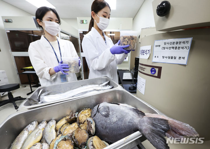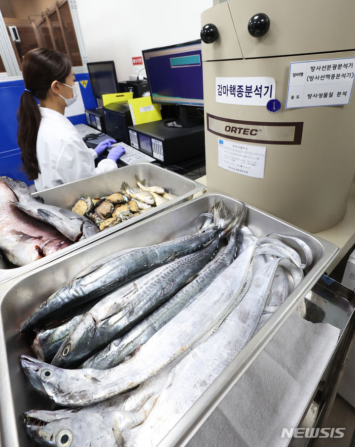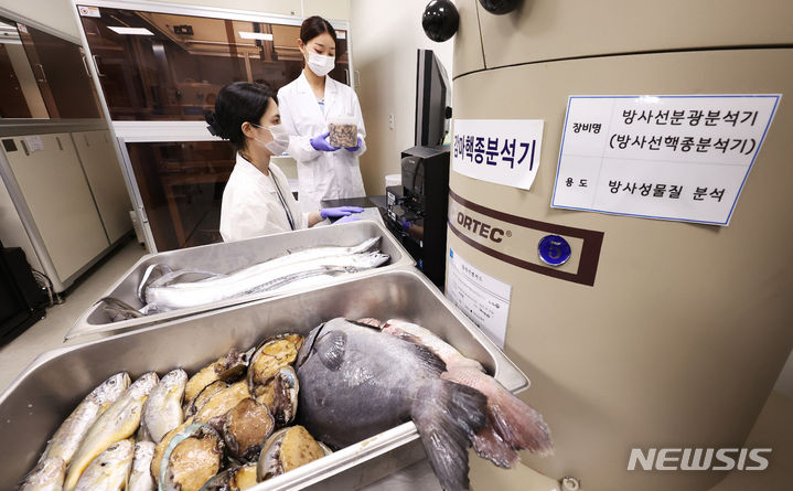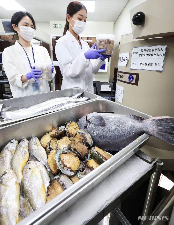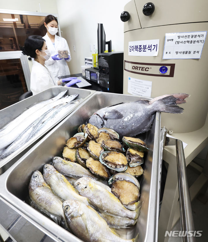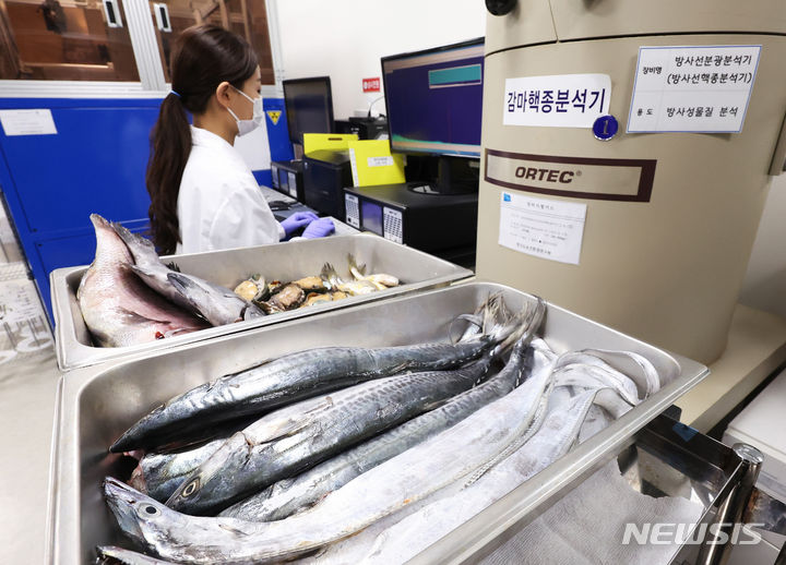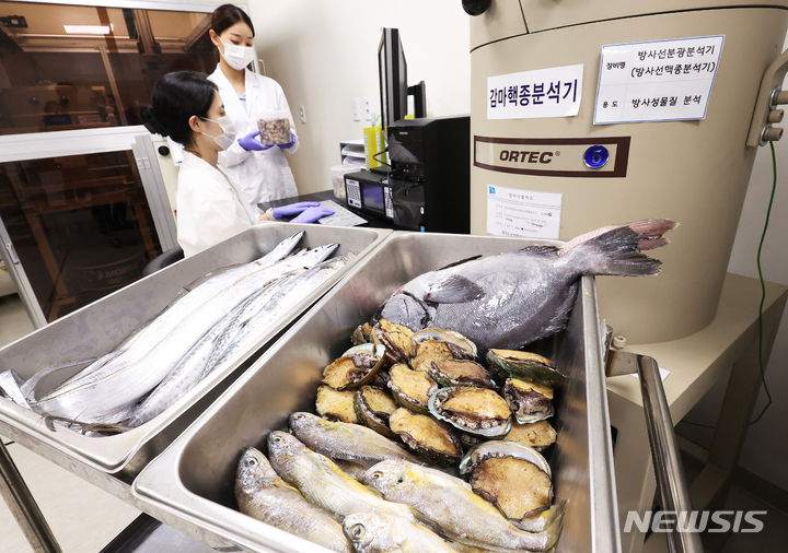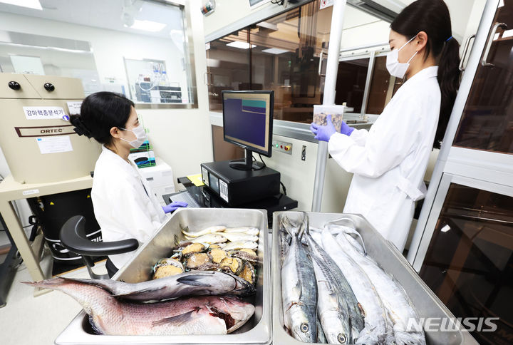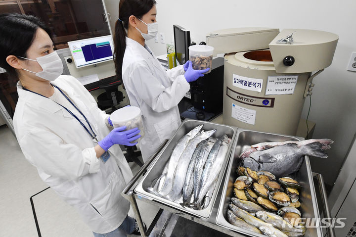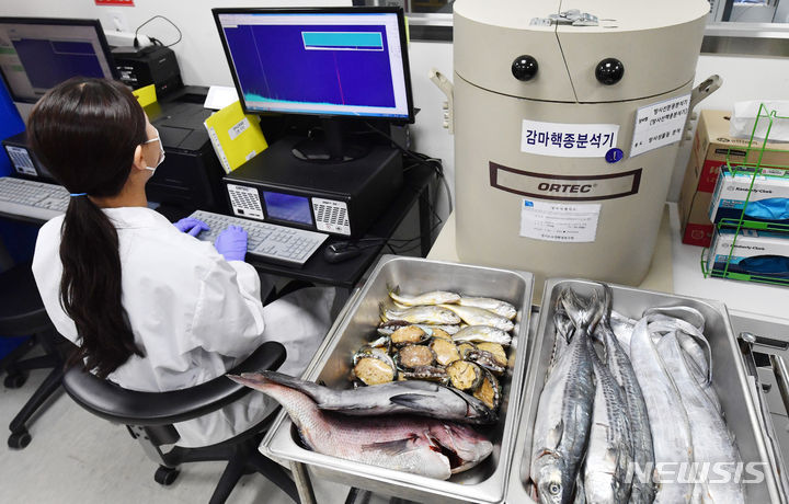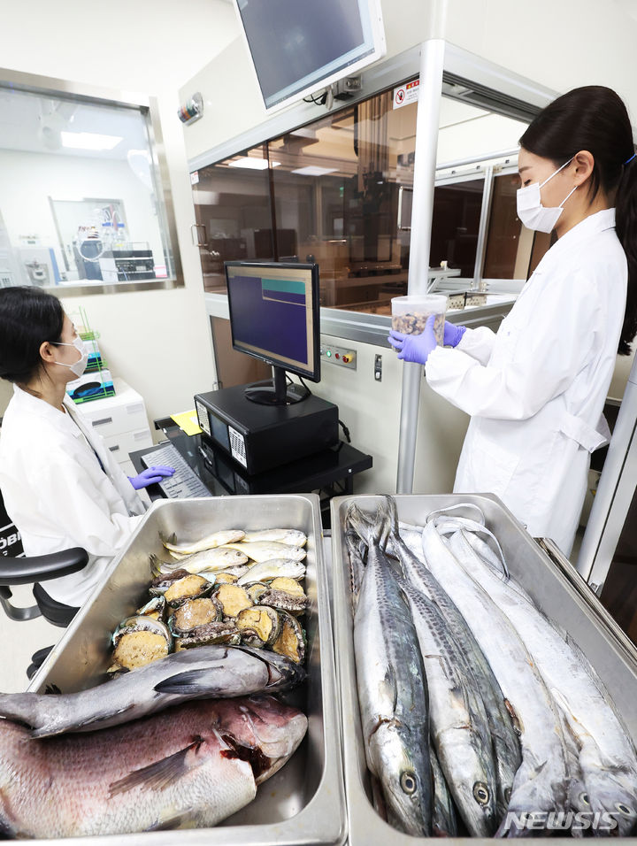 京畿道水原市勧善区の京畿道保健環境研究院で15日、研究員らが各地域から依頼を受けた水産物を対象に放射能検査を行っている。福島第一原発汚染水放流が迫る中、消費者の間で水産物汚染に対する不安感が広がっている。