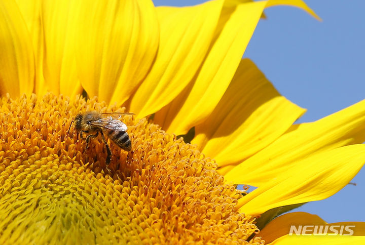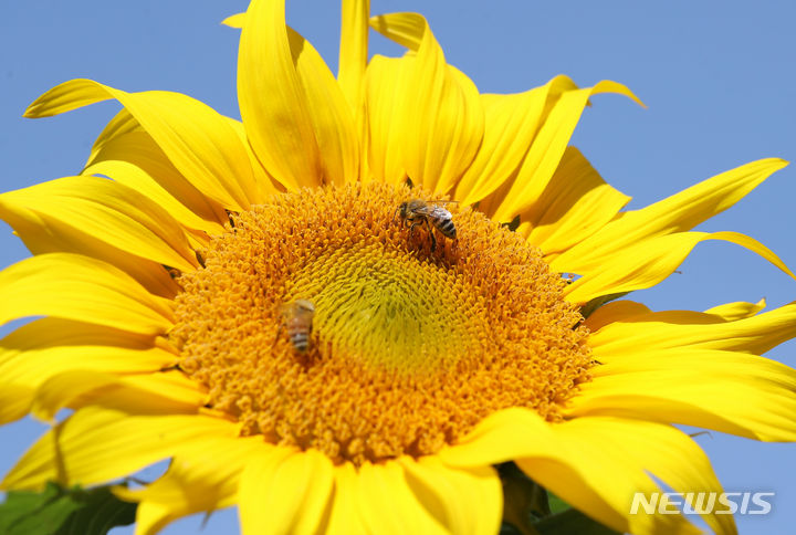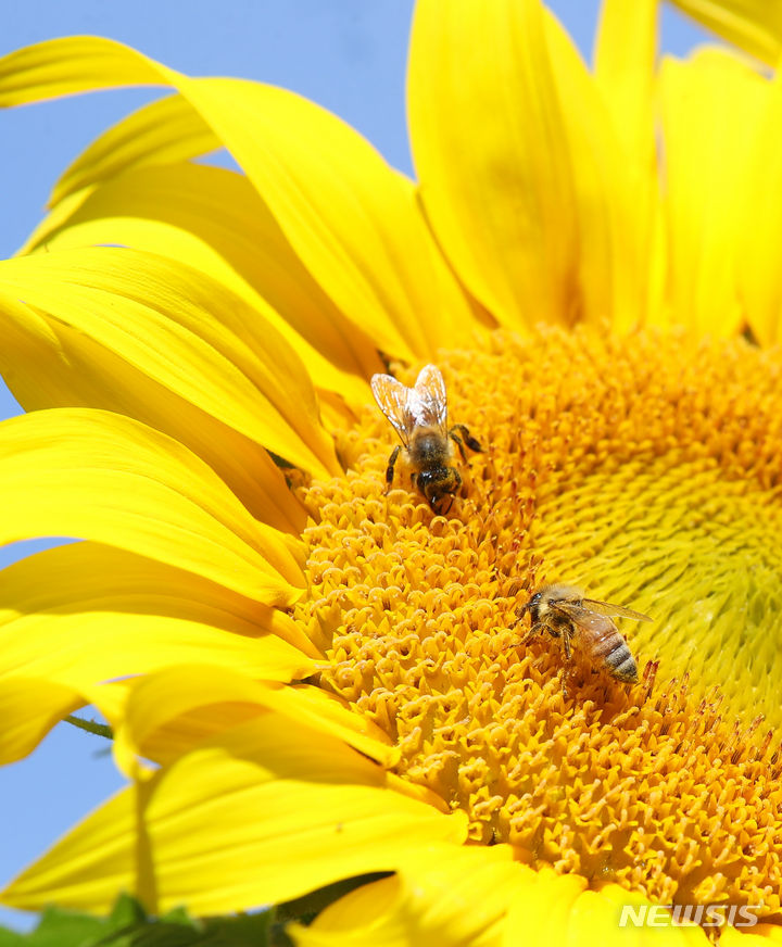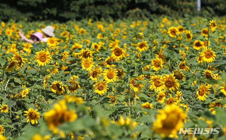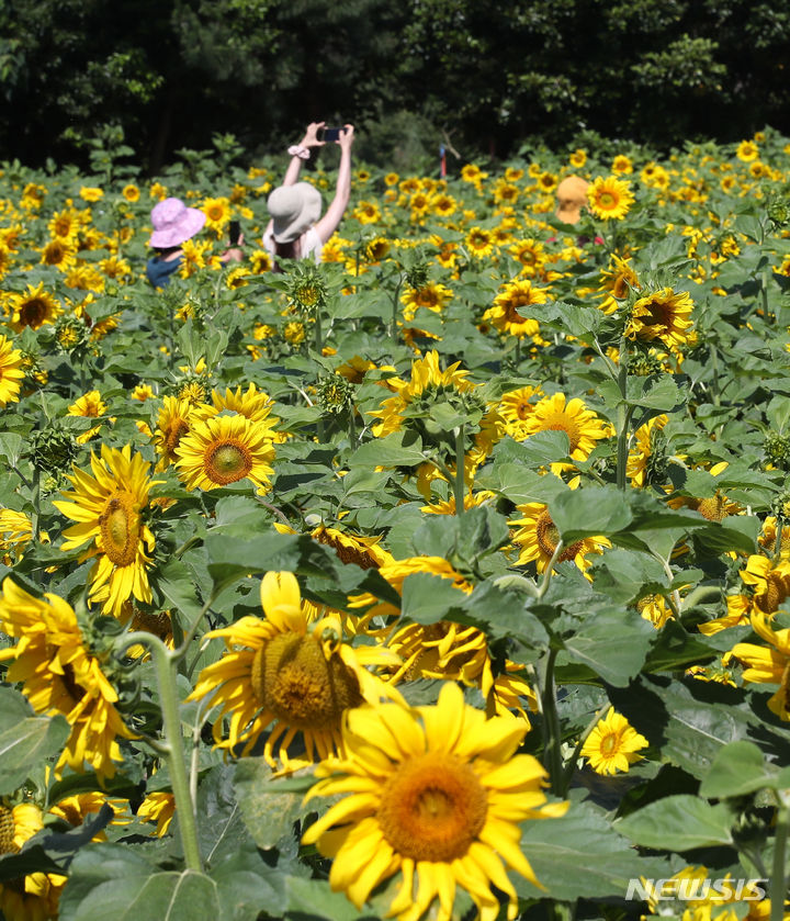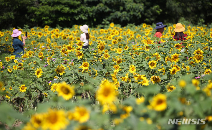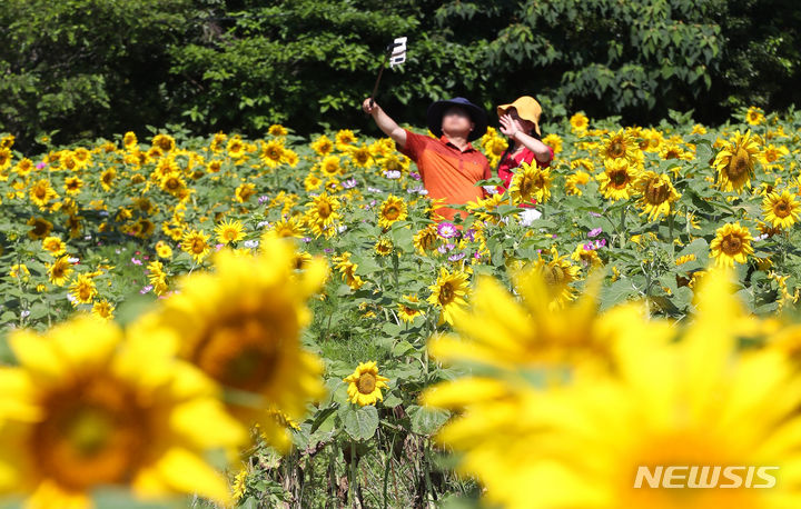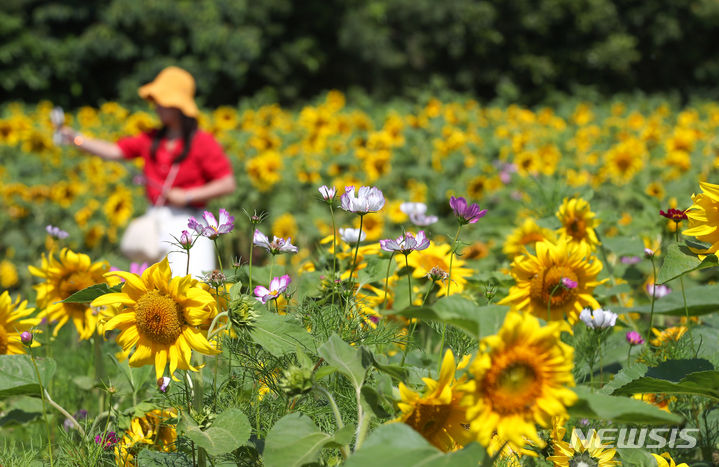 【NEWSIS】全国的に厳しい暑さとなった19日午前、済州島の国家史跡第396号「缸波頭里(ハンパドゥリ)抗蒙遺跡」近くで夏を象徴するヒマワリの花が満開となり、訪問客を喜ばせた。