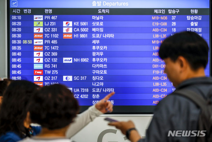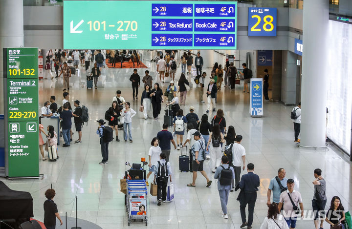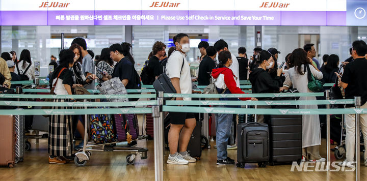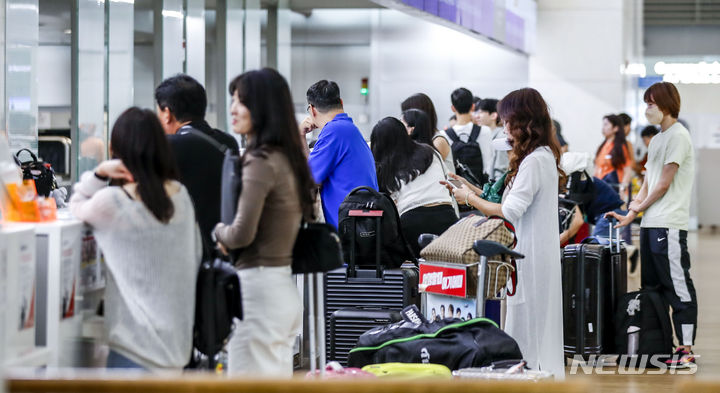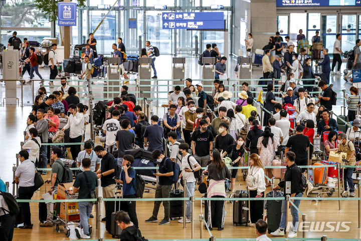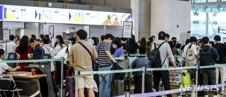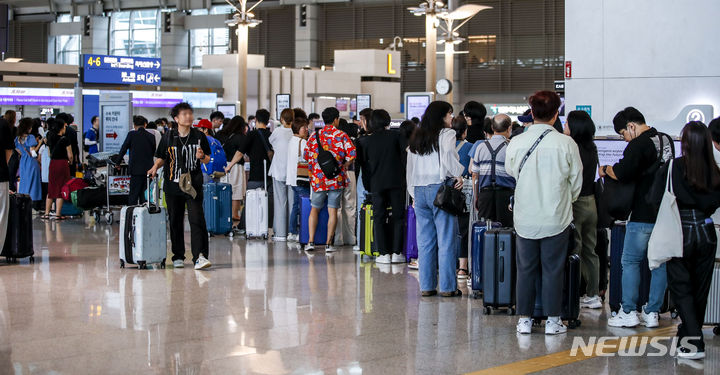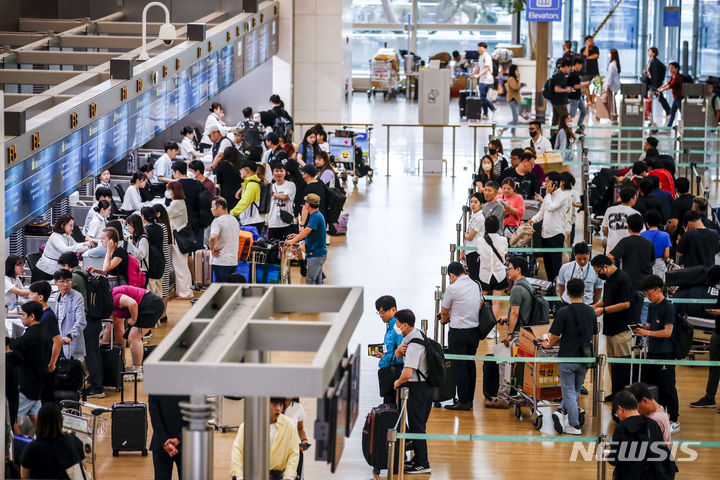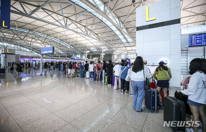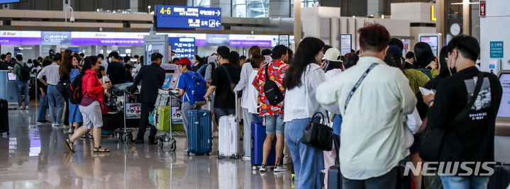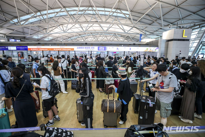 20日午前、仁川国際空港第1ターミナルの出国ロビーにやって来た旅行者らが出国手続きのために列をつくっていた。韓国の大手旅行会社によると、今夏日本へのパッケージツアーの予約が増えているという。最近の韓日関係改善および円安のほか、日本行きの航空運賃が大幅に下がっていることなども、日本旅行ブームに影響しているものとみられる。