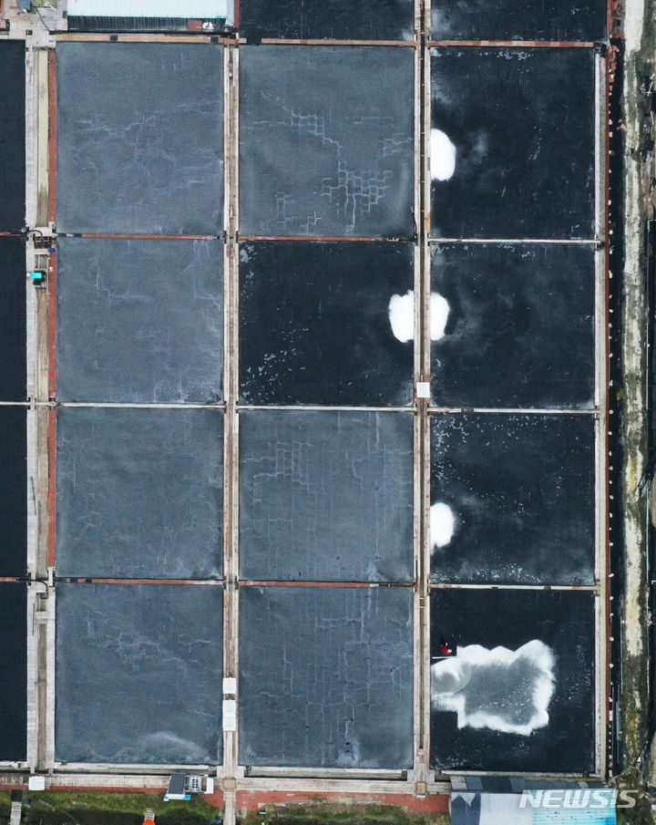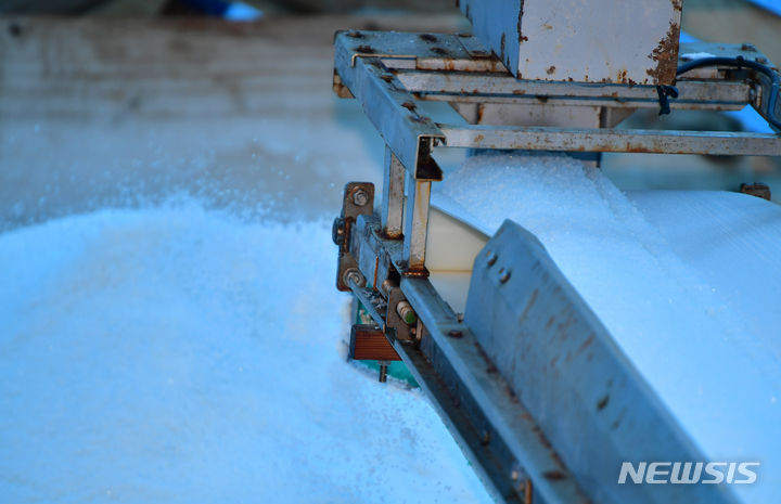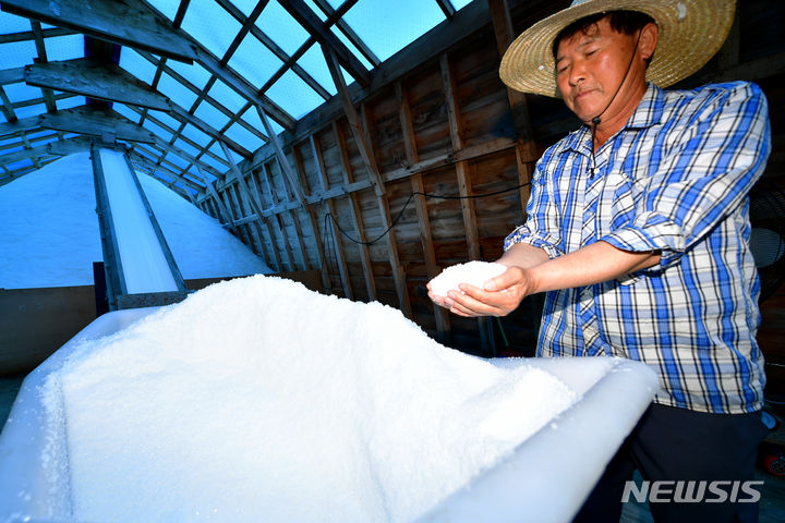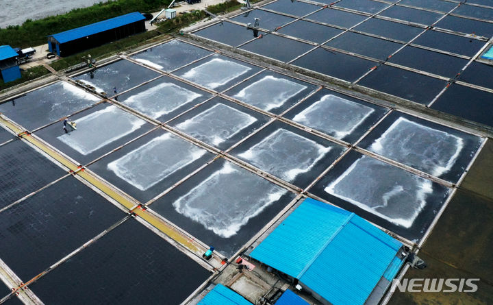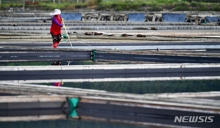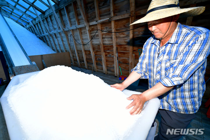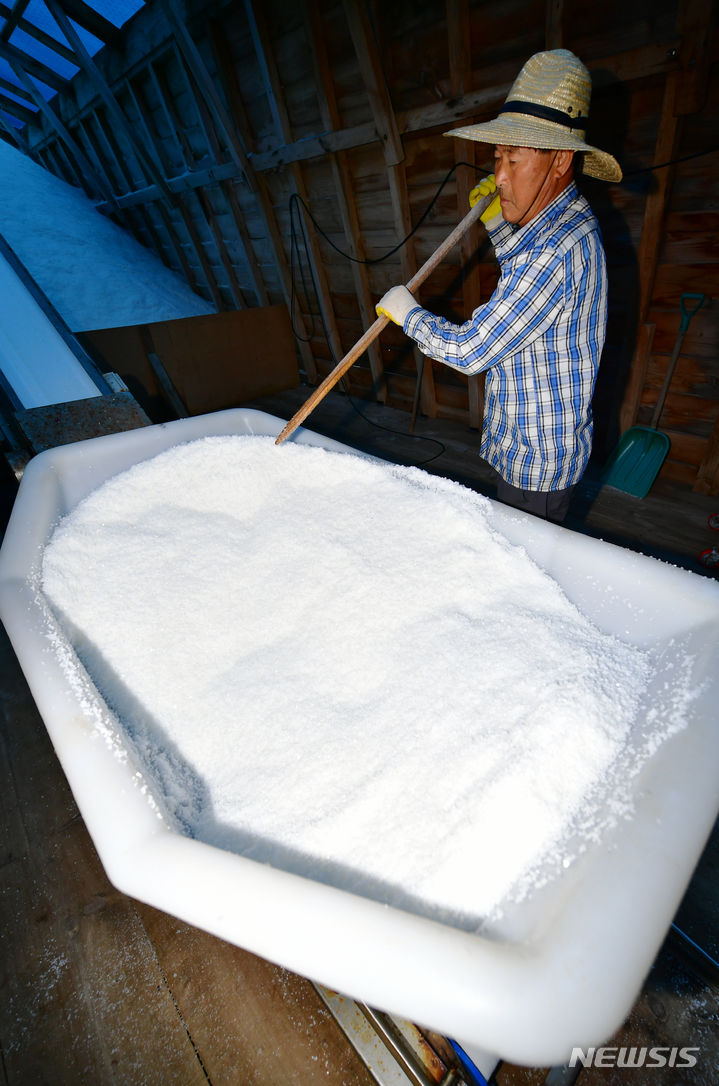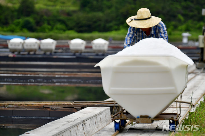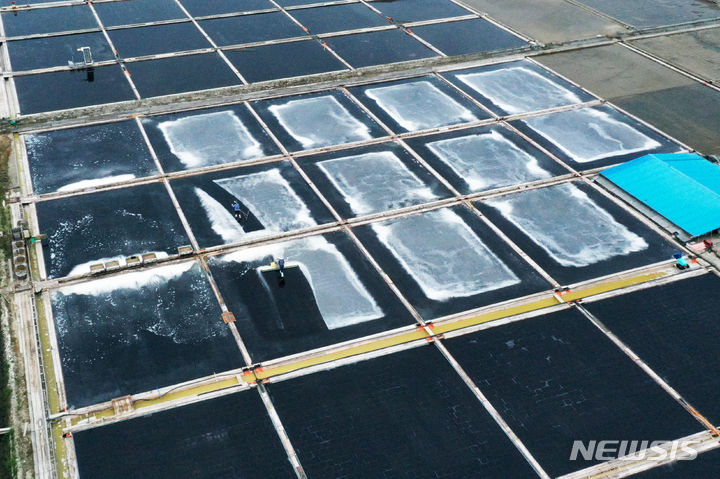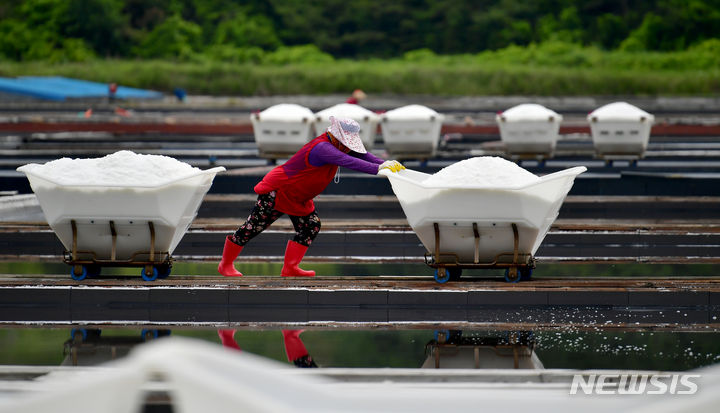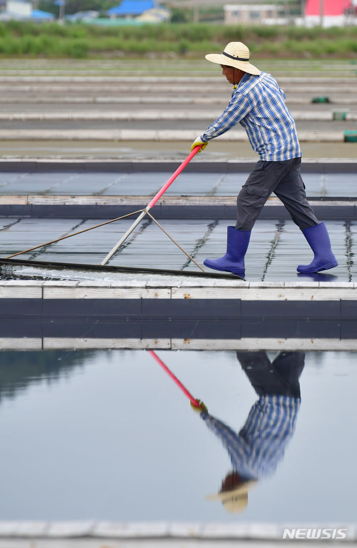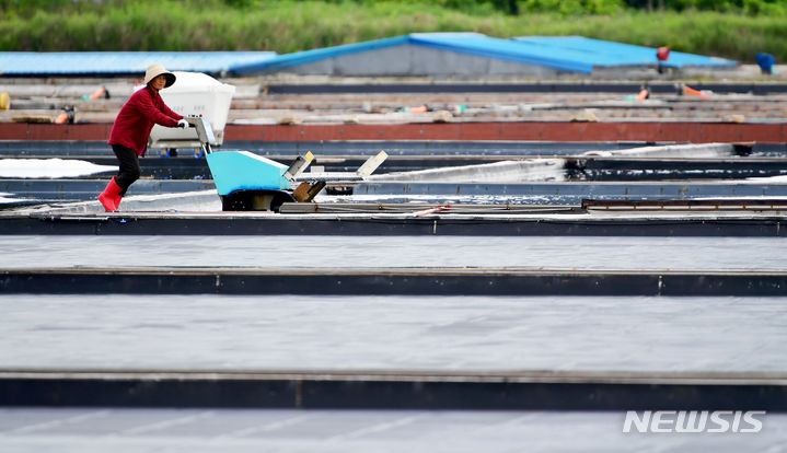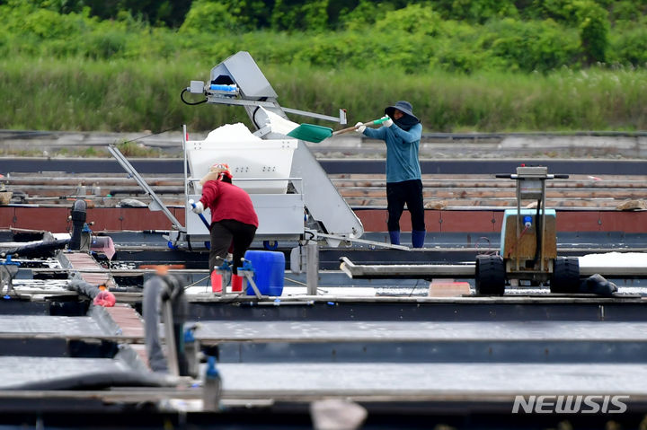 全羅南道の多くの地域で雨が予想される中、全羅南道新安郡の塩田では20日午前、塩の収穫の真っ最中だった。