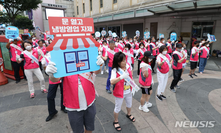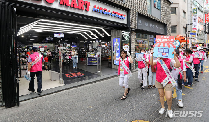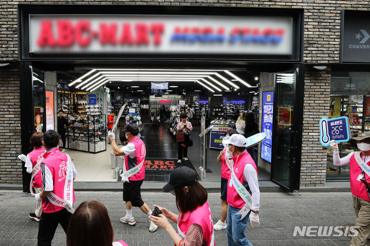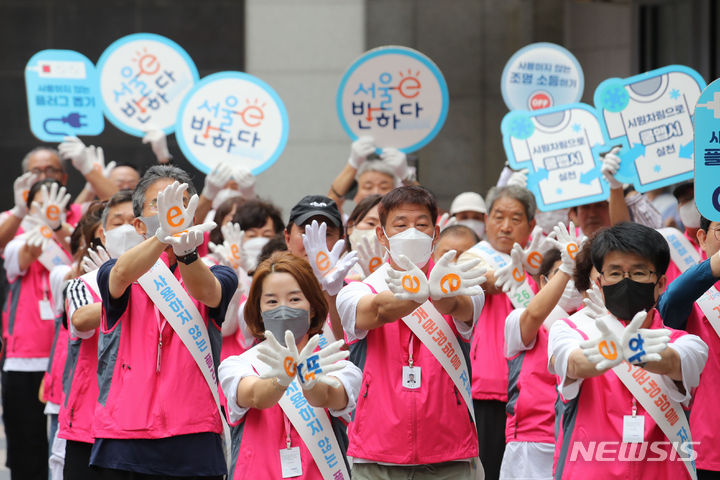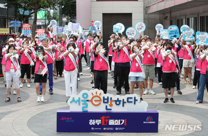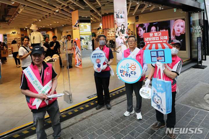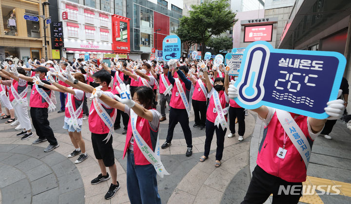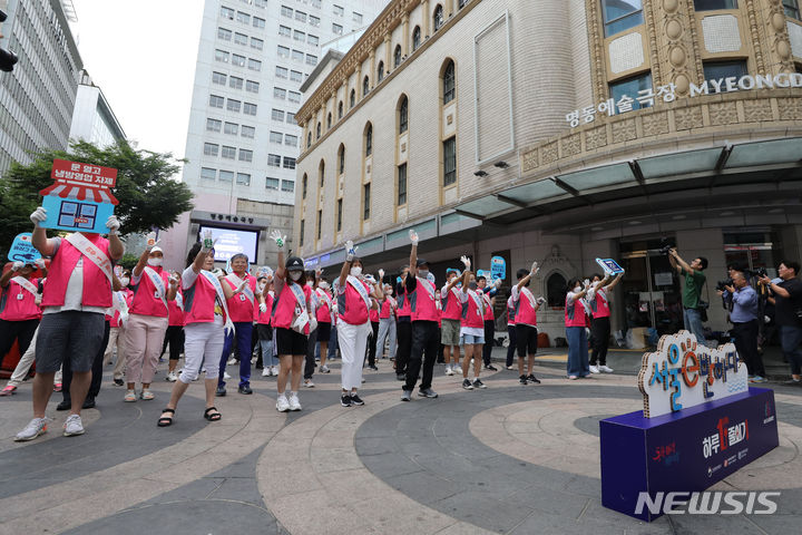 ソウル市中区明洞の一帯で20日午後、夏季エネルギー節約合同キャンペーン「ソウルe惚れる」のメンバーがフラッシュモブを行っている様子。