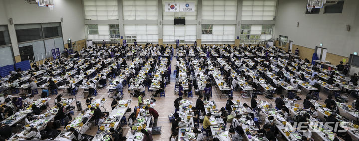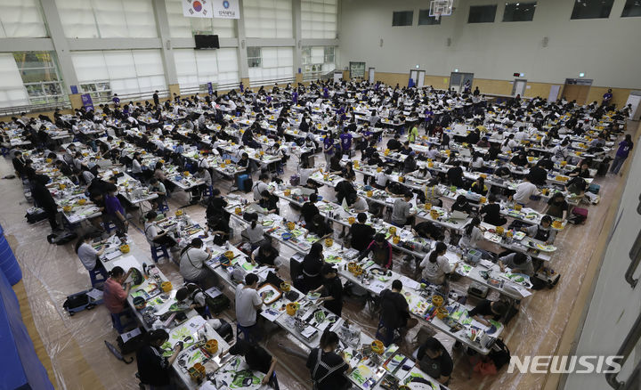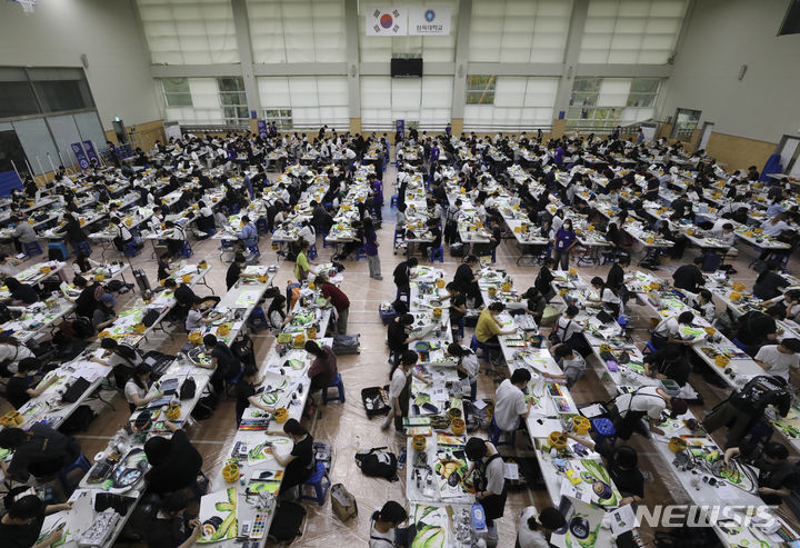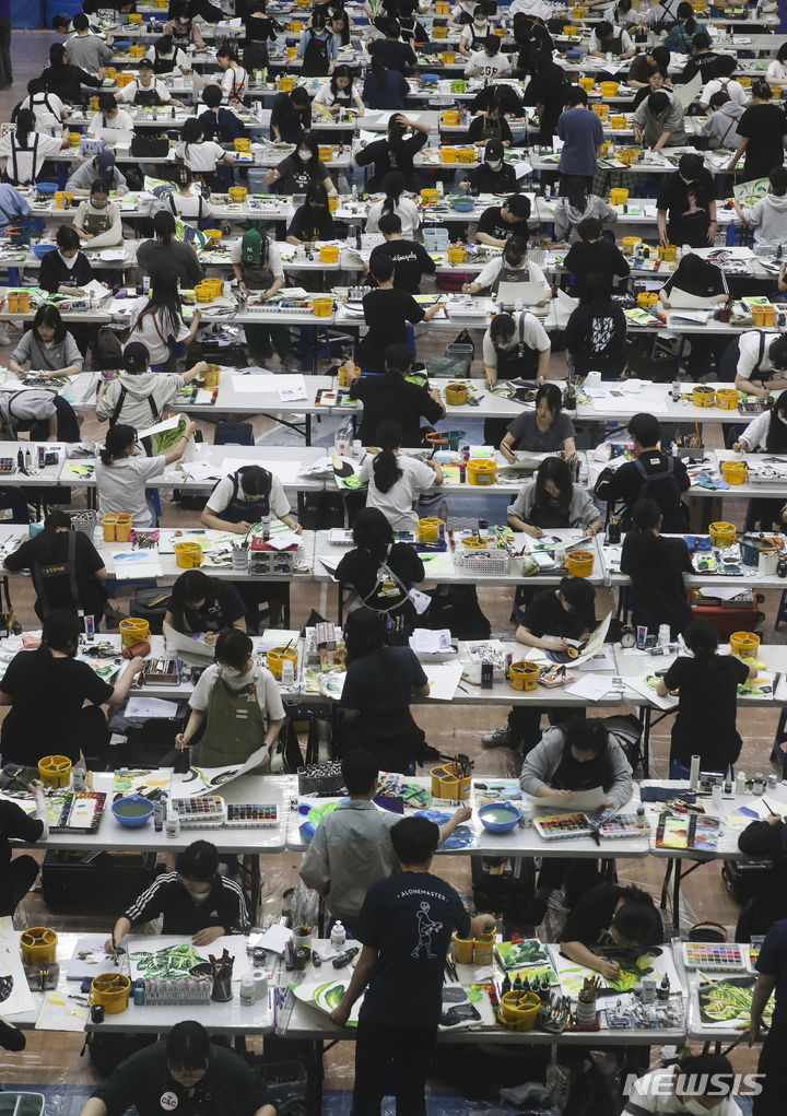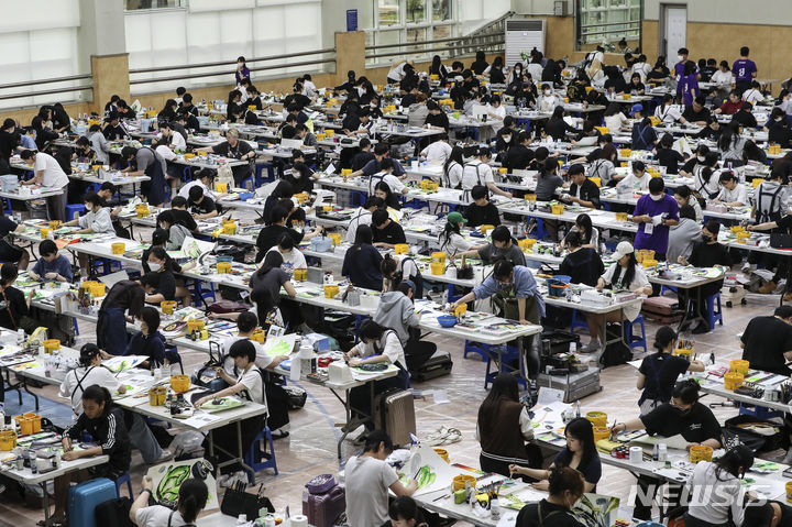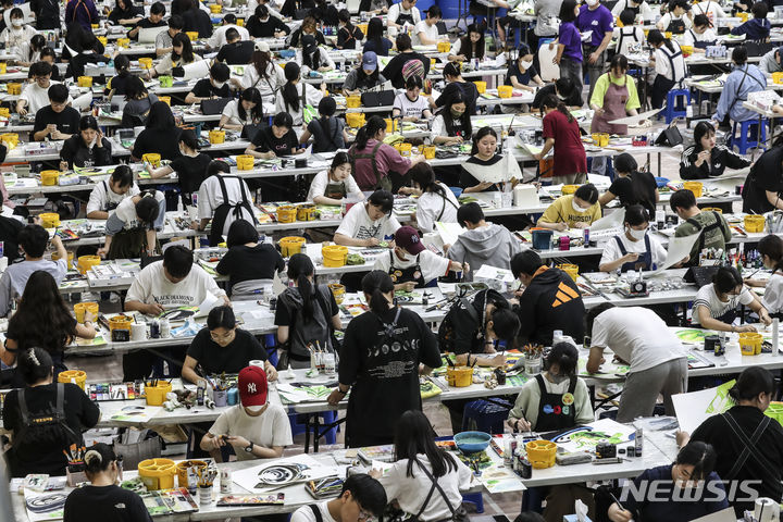 2023全国高校生アート&デザイン実技大会が開かれた21日午後、ソウル市芦原区の三育大学体育館で、生徒たちが絵を描いているところ。