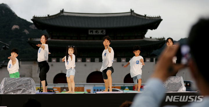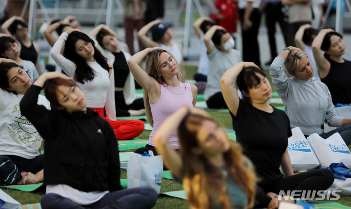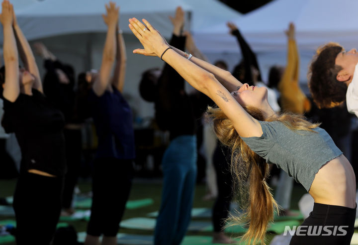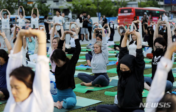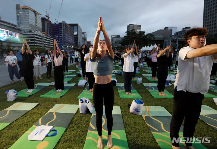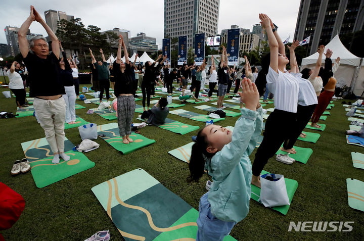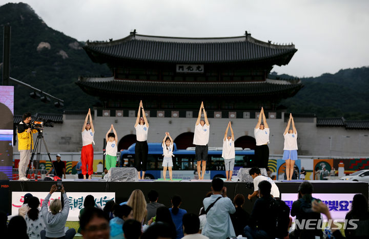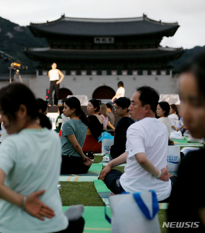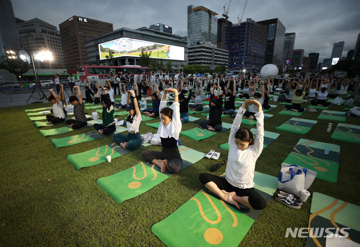 【NEWSIS】「国際ヨガの日」の21日、ソウル・光化門広場の「六曹マダン」で、「光化門月光ヨガ」開幕式が行われた。写真はヨガを習う参加者たち。