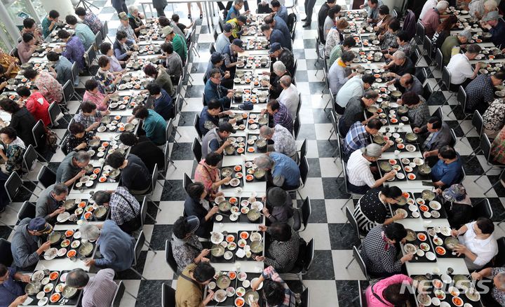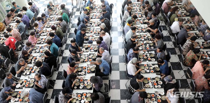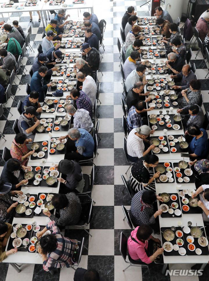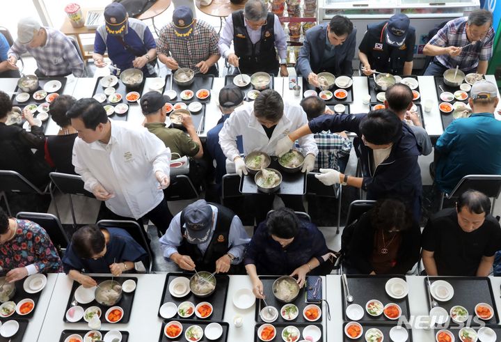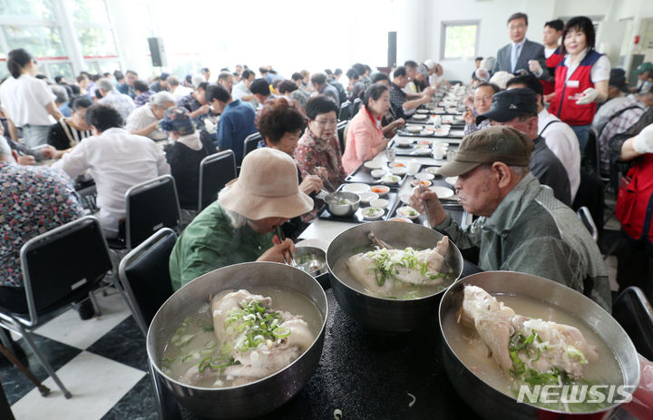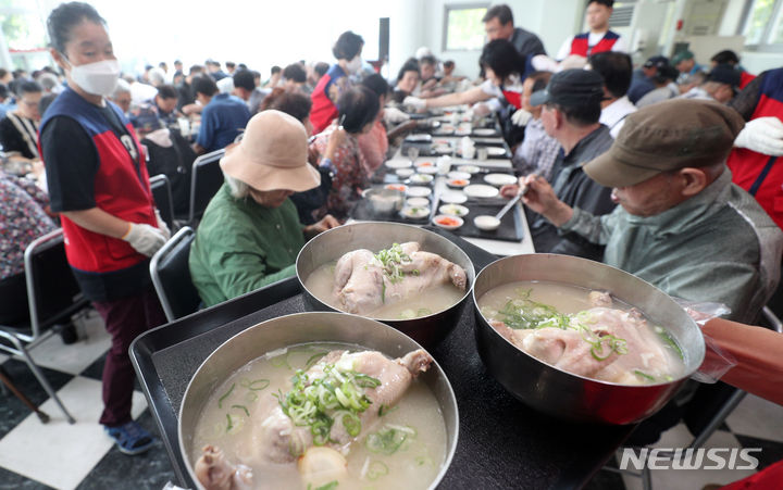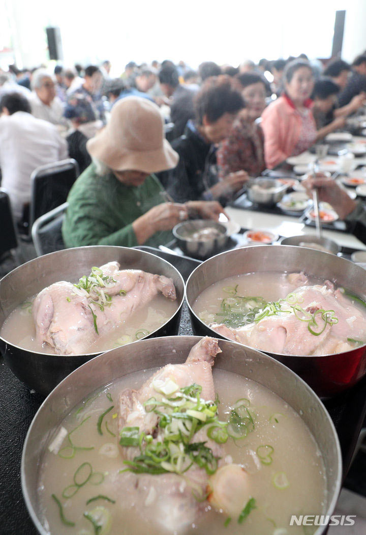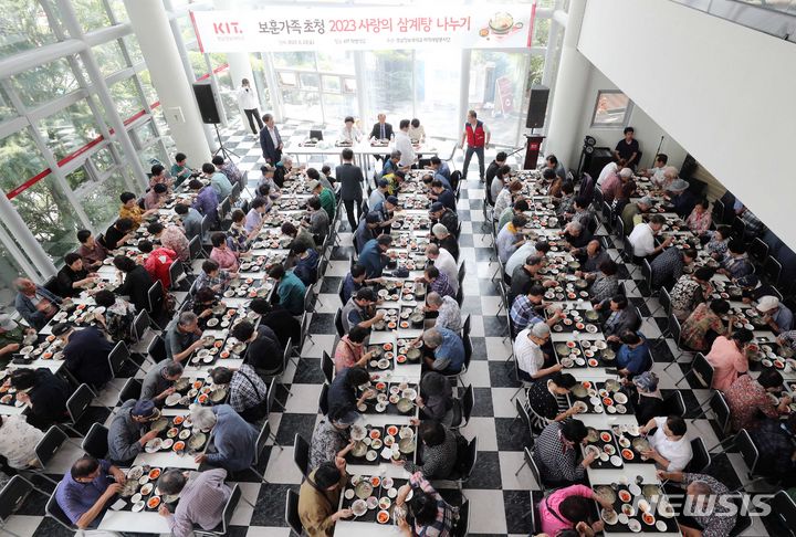 慶南情報大学総学生会と教職員などが23日、釜山市沙上区の大学構内の学生食堂で、護国報勲の日に合わせて報勲家族の高齢者250人を招き、韓国を代表する夏場の栄養食サムゲタンをふるまった。