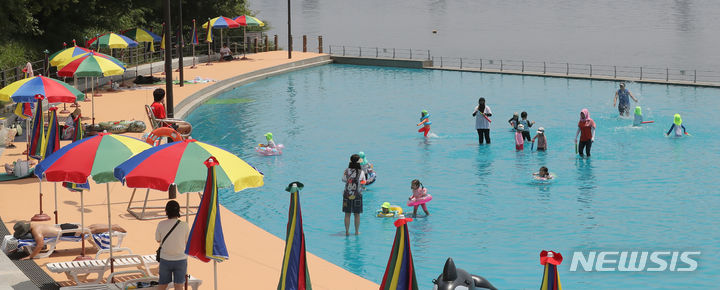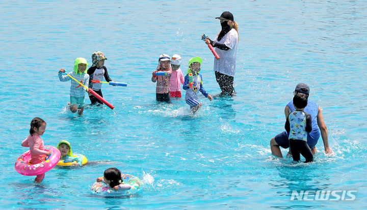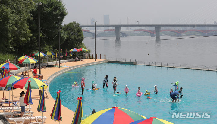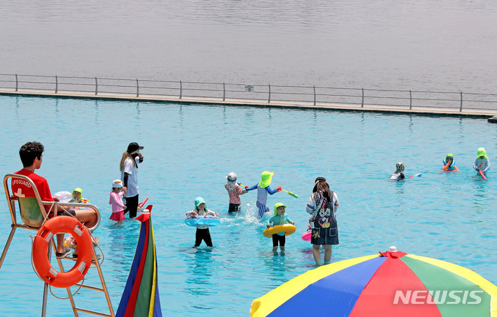 漢江プールおよび水遊び場オープン初日の23日午後、蘭芝漢江公園(ソウル市麻浦区)の水遊び場では、訪れた市民が水遊びをしていた。