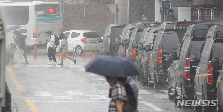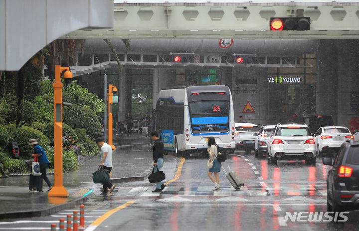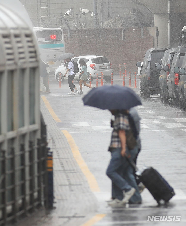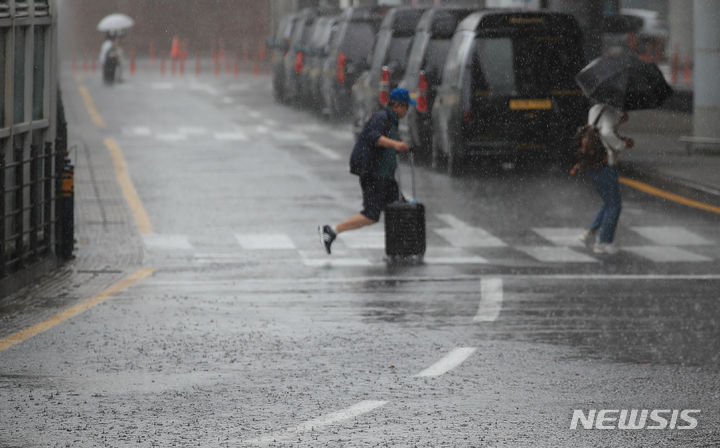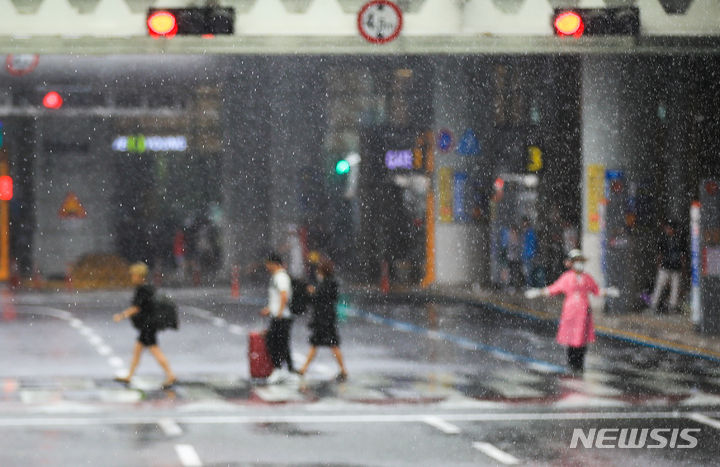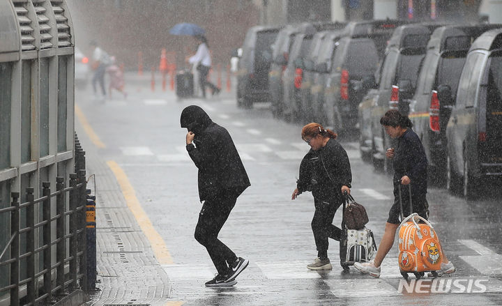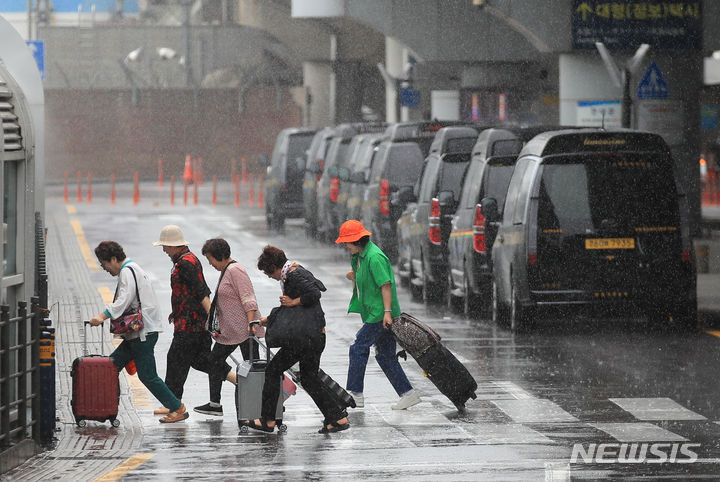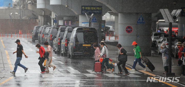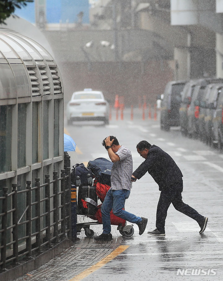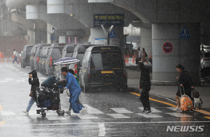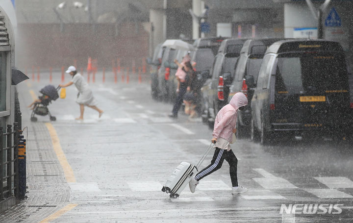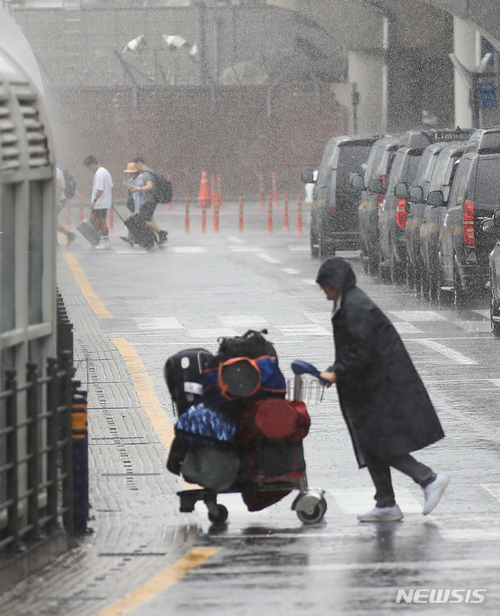 【NEWSIS】梅雨入りした25日午前、済州国際空港で激しい雨の中をカートを押して移動する観光客たち。