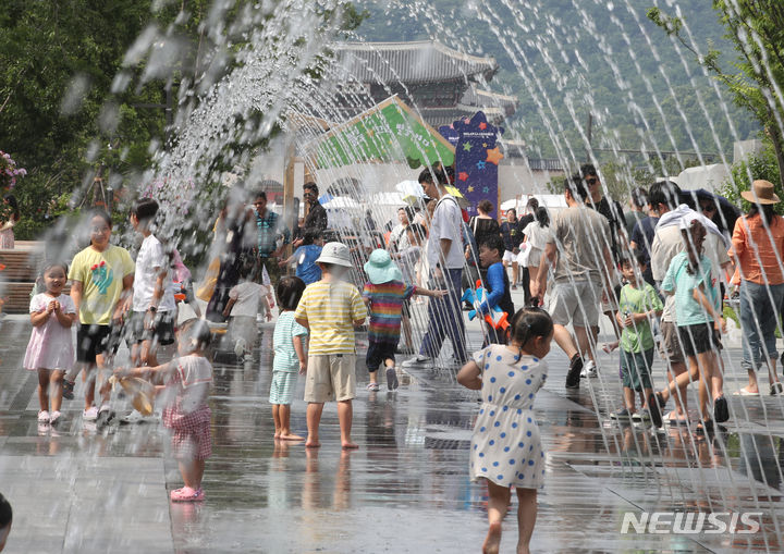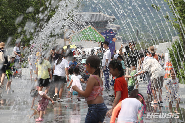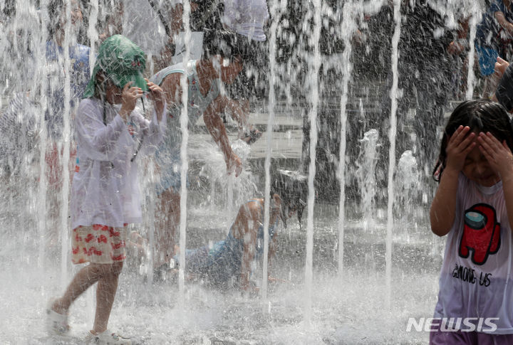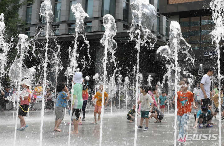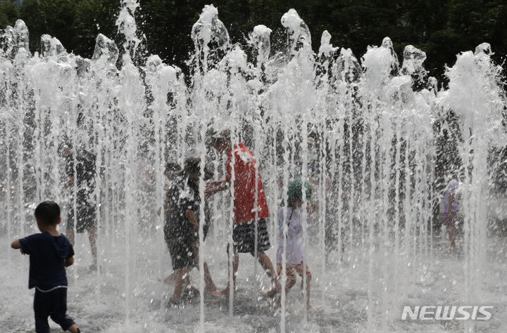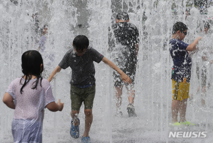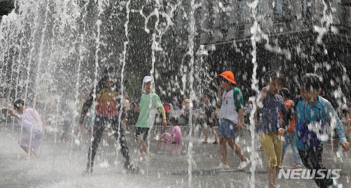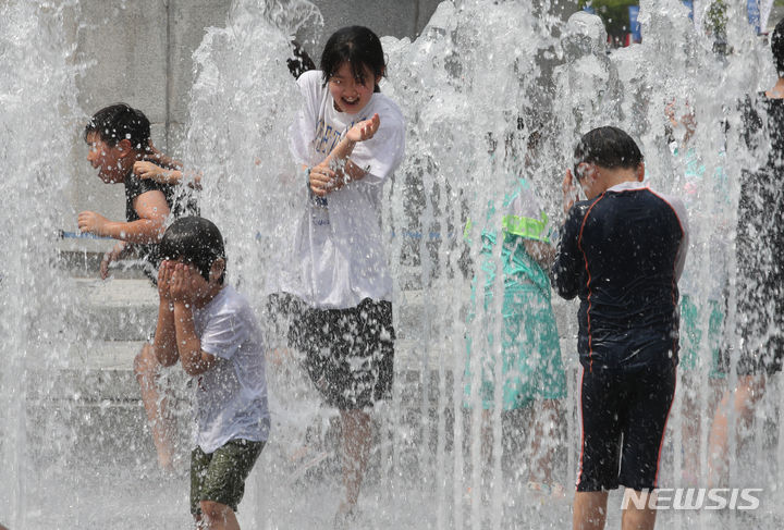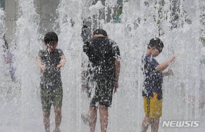 【NEWSIS】25日、ソウル市鍾路区の光化門広場の噴水で、水遊びをして暑さをしのぐ子どもたち。
