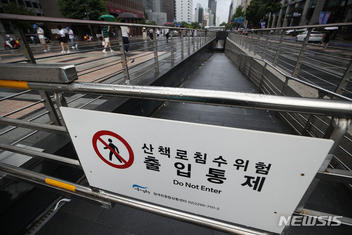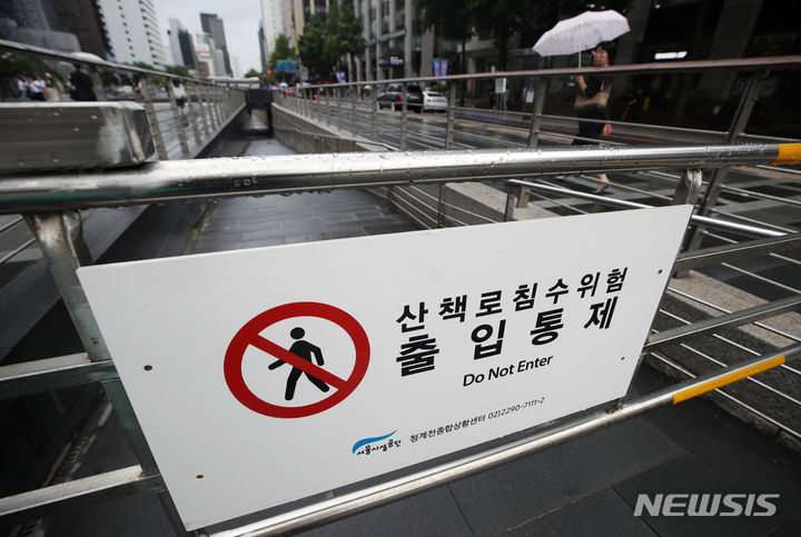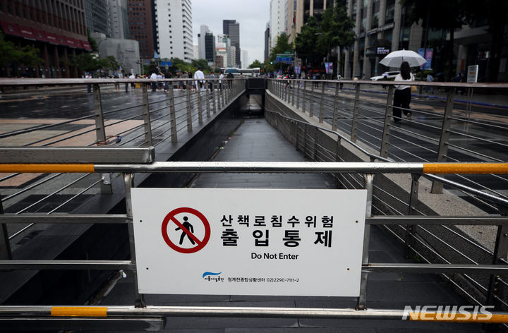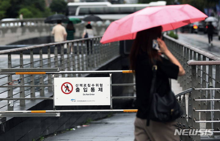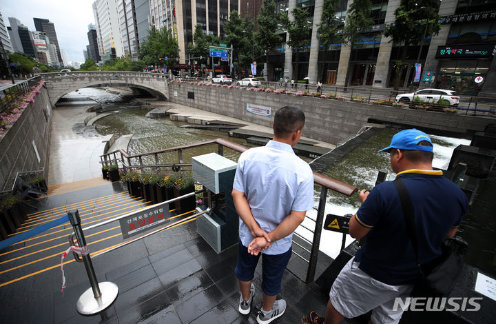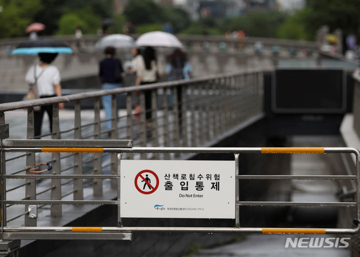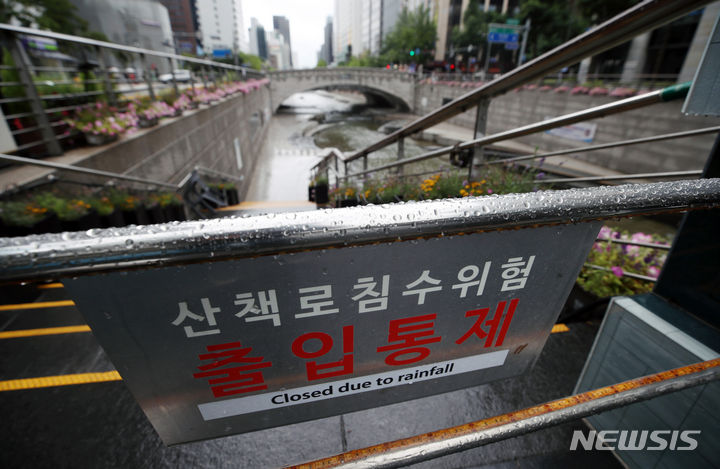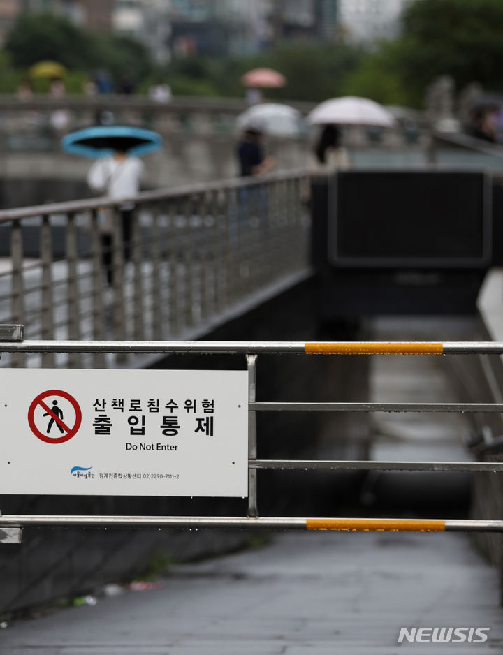 【NEWSIS】梅雨の雨が降った26日、ソウル市鍾路区の清渓川では散策路が立ち入り禁止になった。