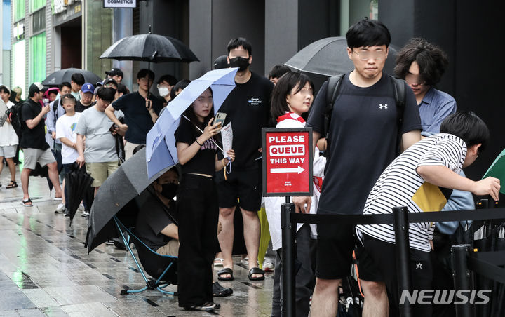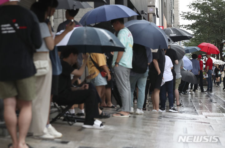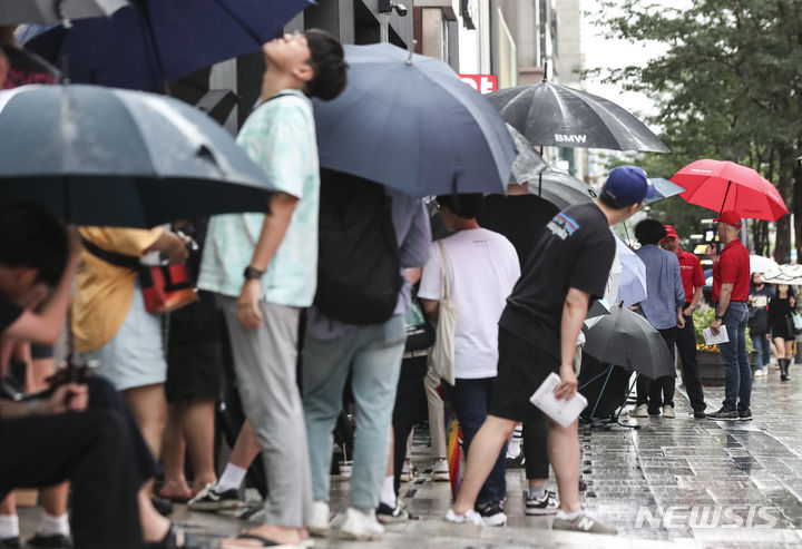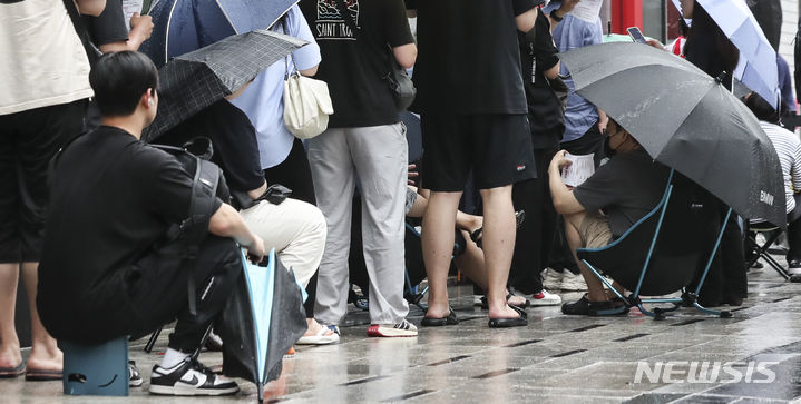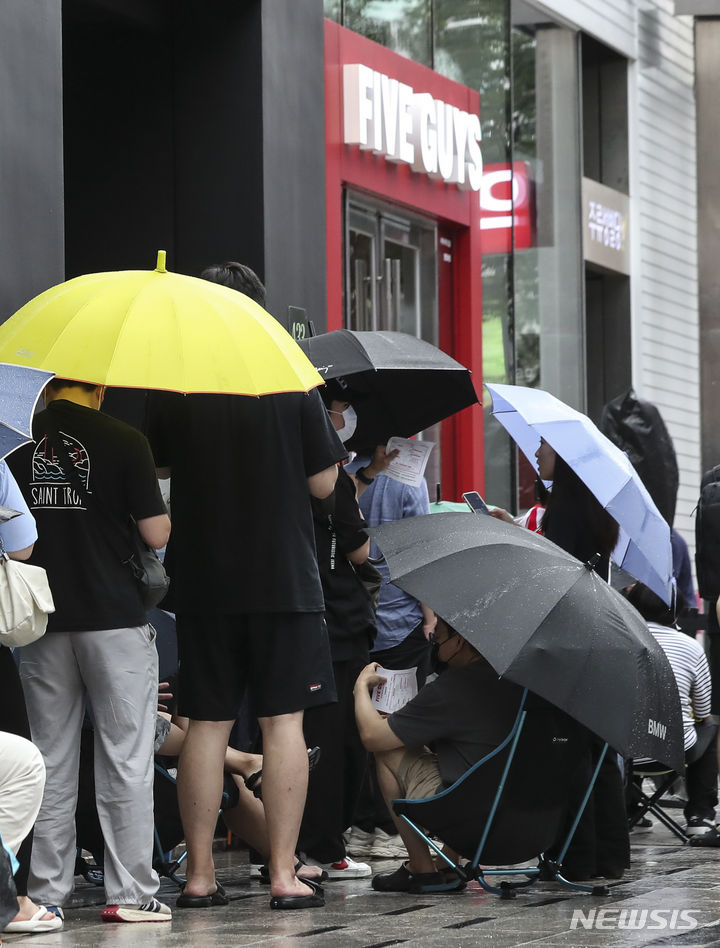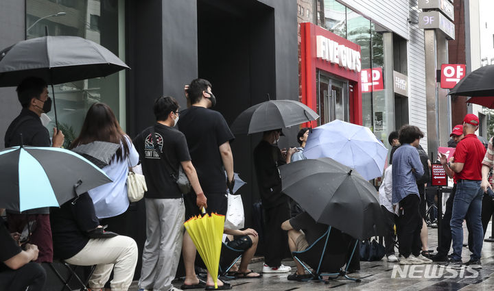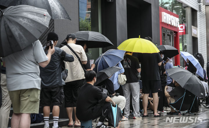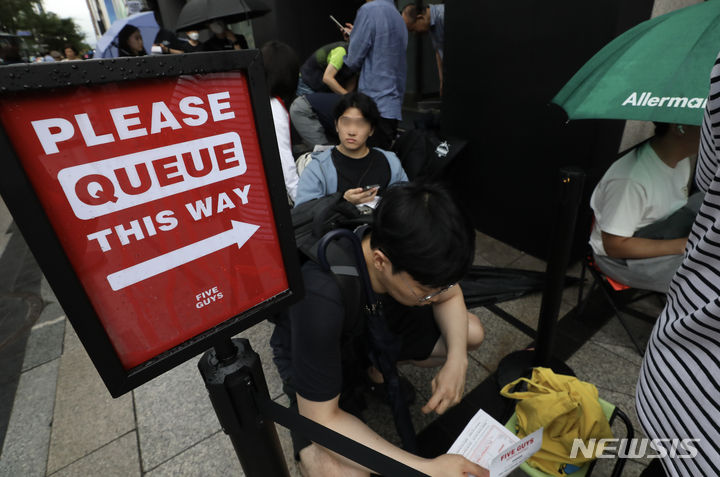 ソウル市瑞草区で26日にオープンした米国発のハンバーガーチェーン「ファイブ・ガイズ」の店舗前で、市民たちがハンバーガーを購入するため列をなしている。