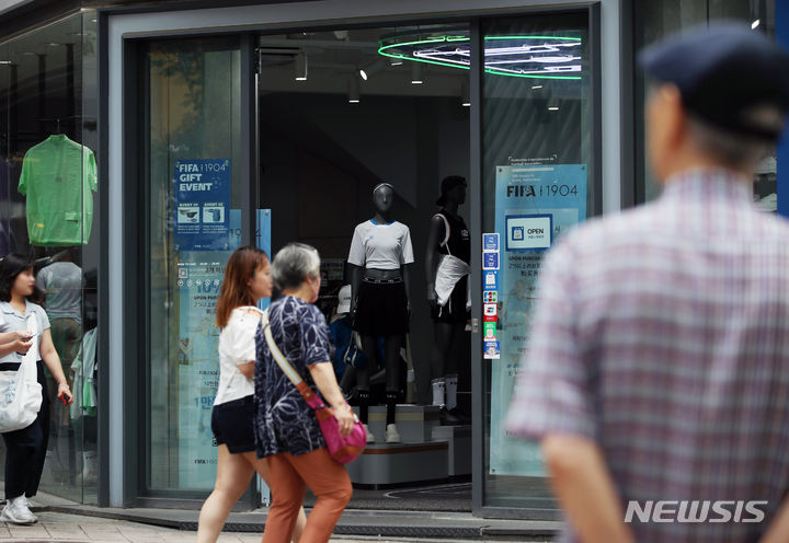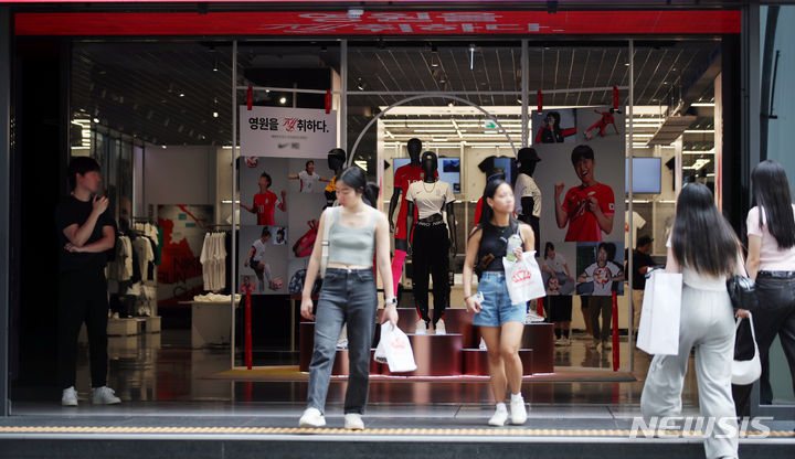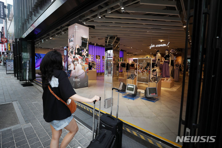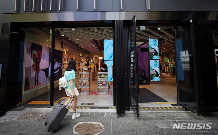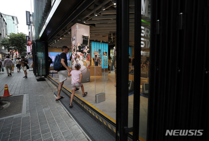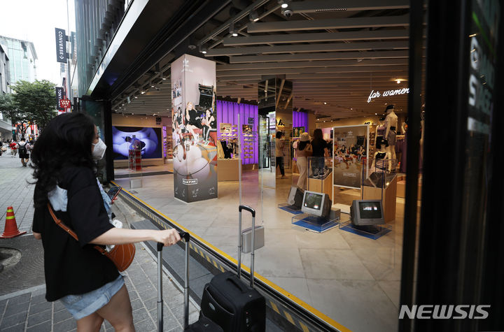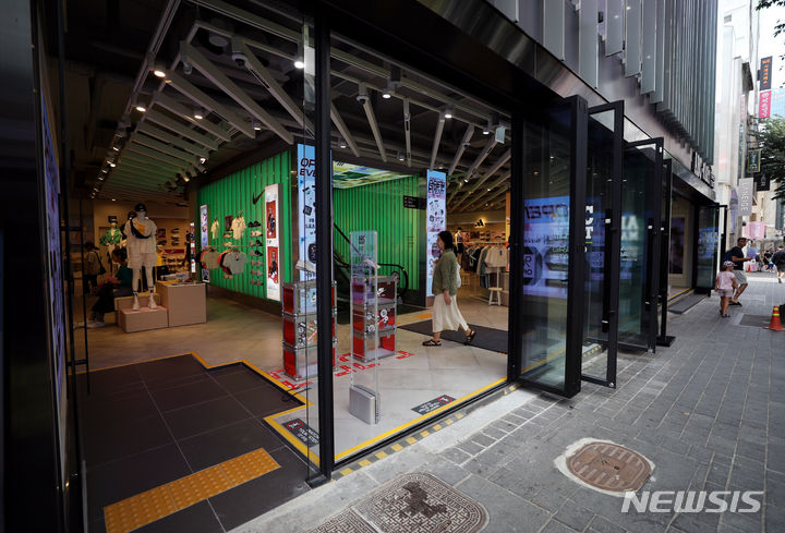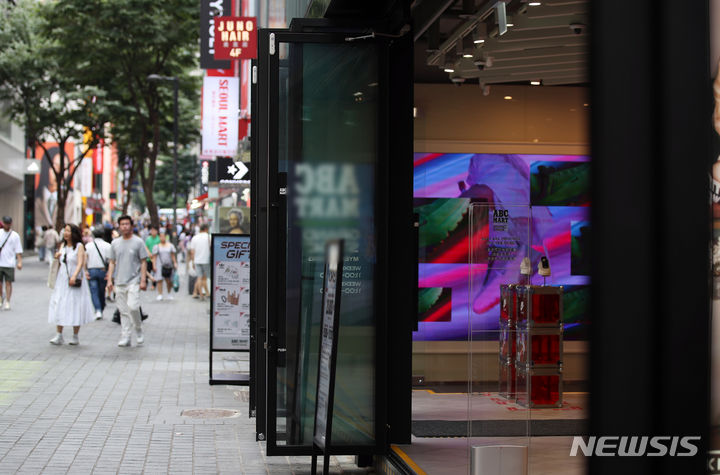 とりわけ、ソウルの明洞と弘大一帯の店舗は、開門冷房の割合が69%と最も高かった。業種別では靴(47%)、化粧品(36%)、衣類(28%)の順で、ドアを開けたまま冷房をかける割合が高かった。写真は27日午後、ソウル市中区明洞で、エアコンをかけたままドアを開けて営業している店舗の様子。
