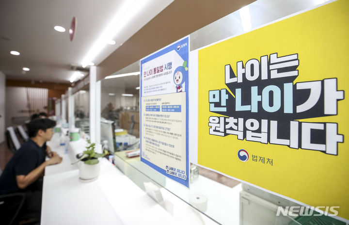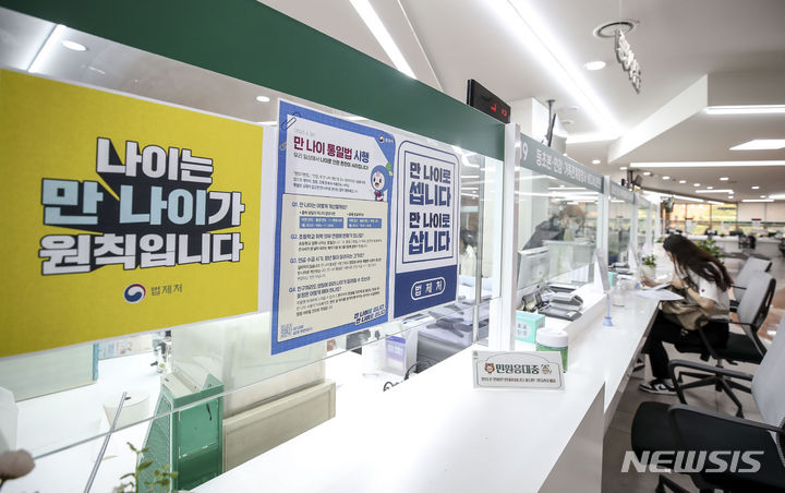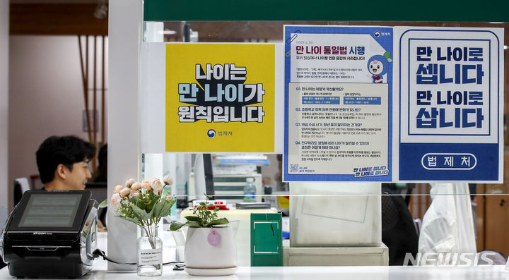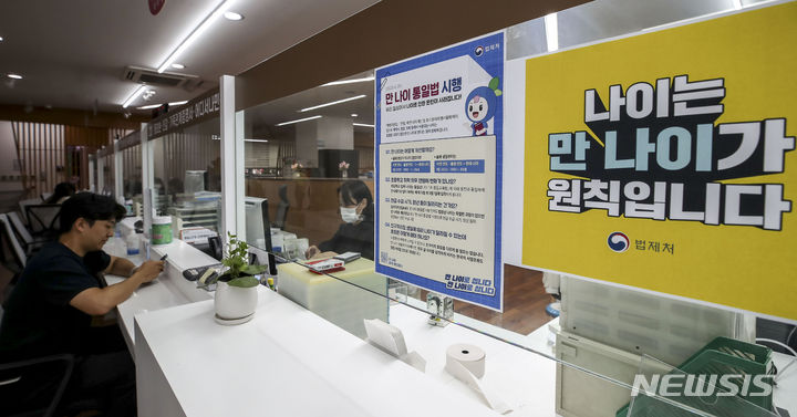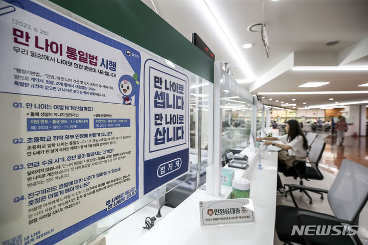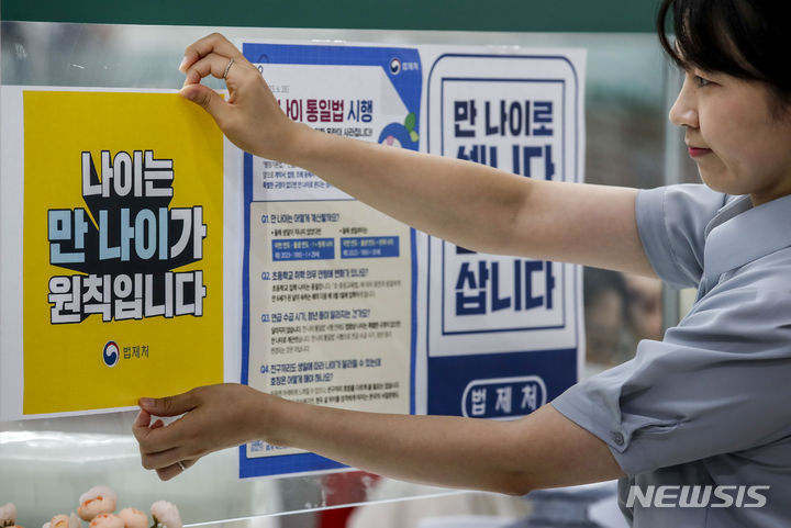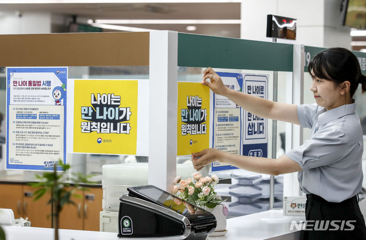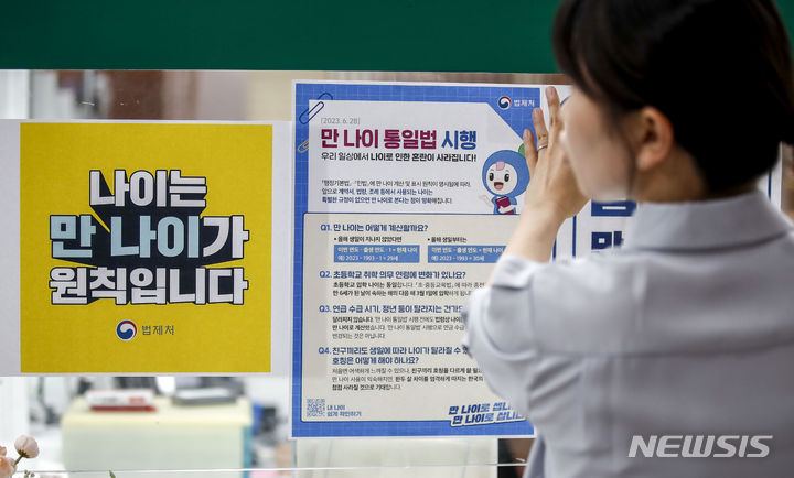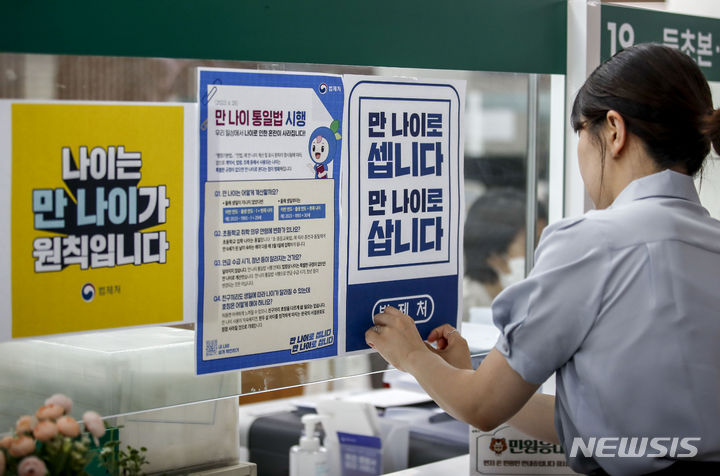 【NEWSIS】これまで韓国で一般的だった数え年をやめ、満年齢で統一する「満年齢統一法」が施行された28日午前、ソウル市松坡区庁の市民相談室で、法施行に関する案内文を掲示する区職員。