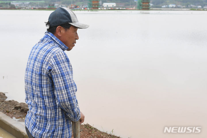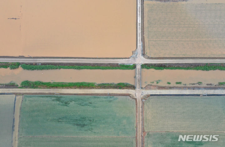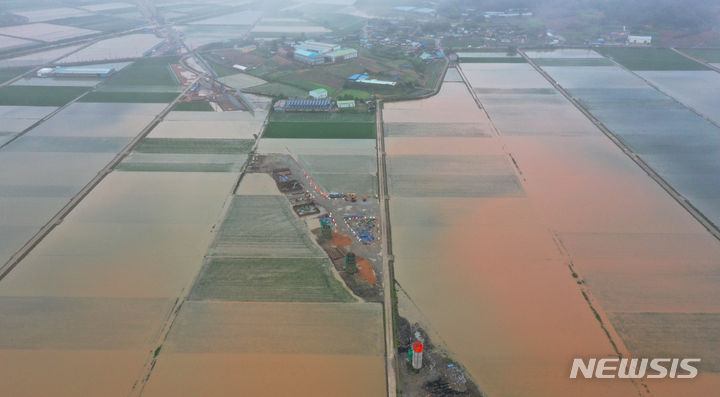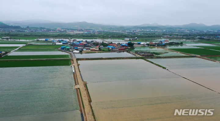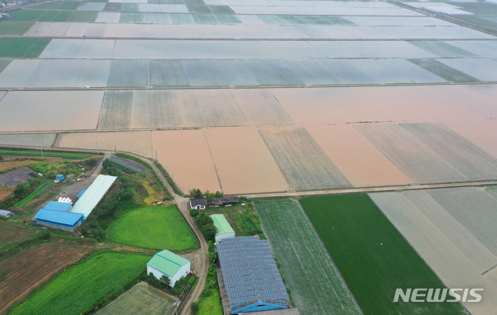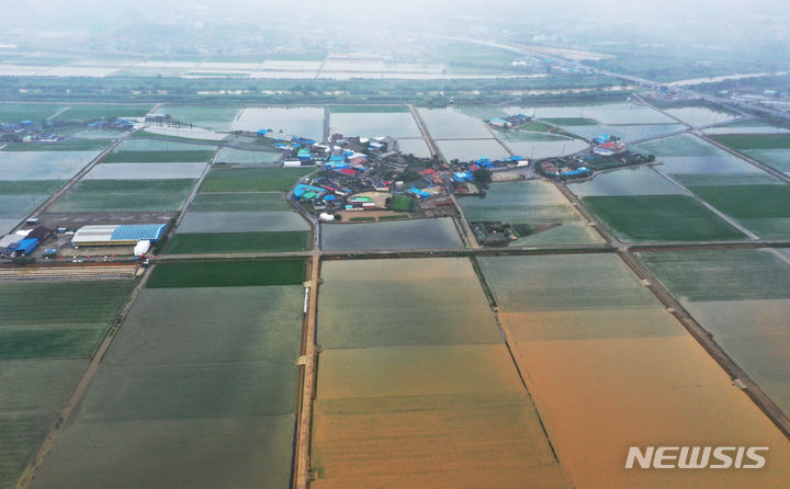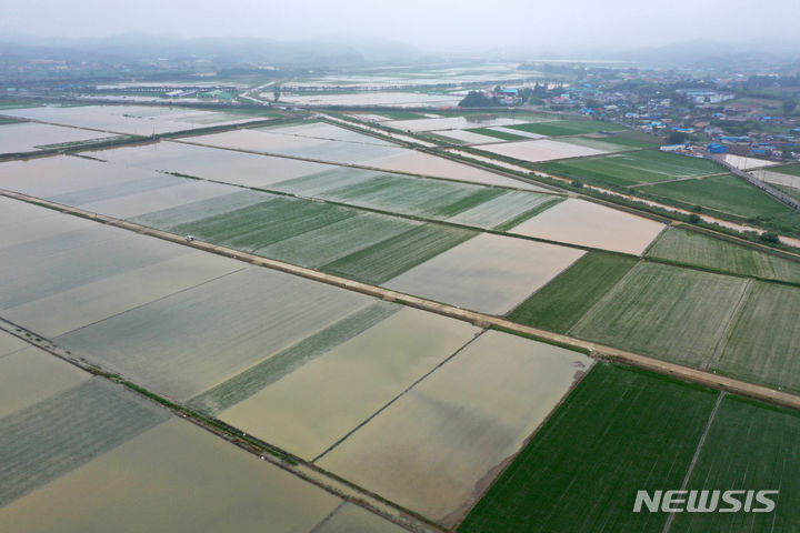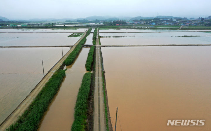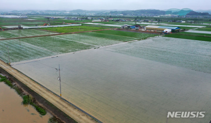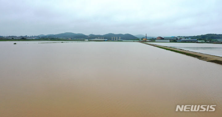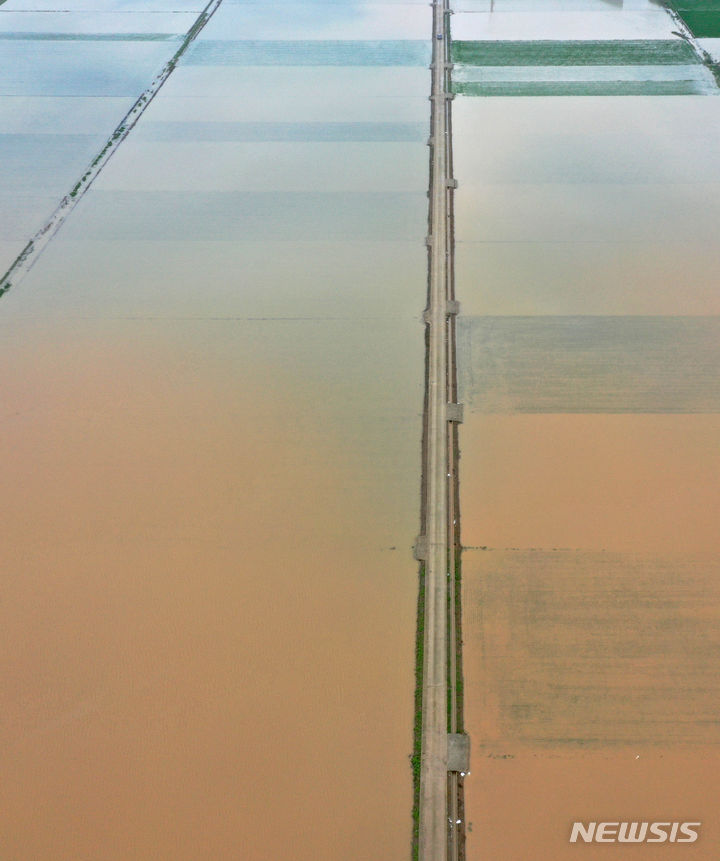 夜間に光州・全羅南道地域に強い雨が降った28日、全羅南道咸平郡厳多面星泉里一帯の農耕地が泥水に浸かっている様子。