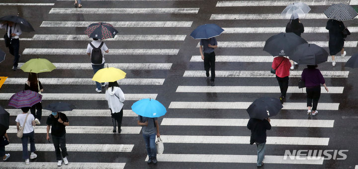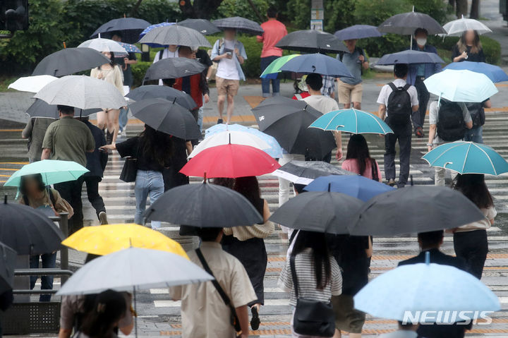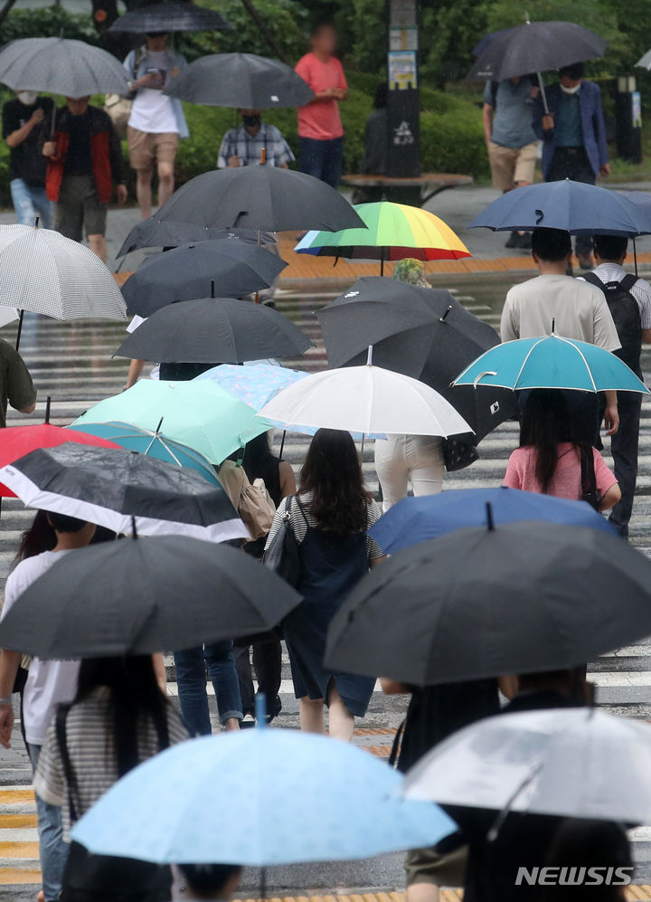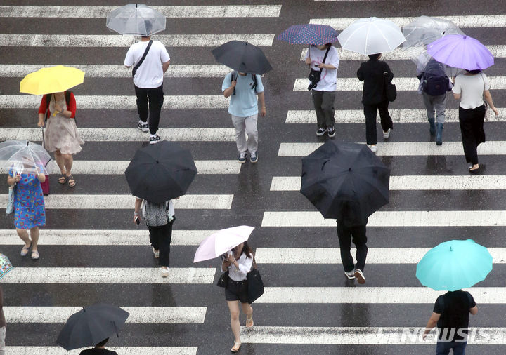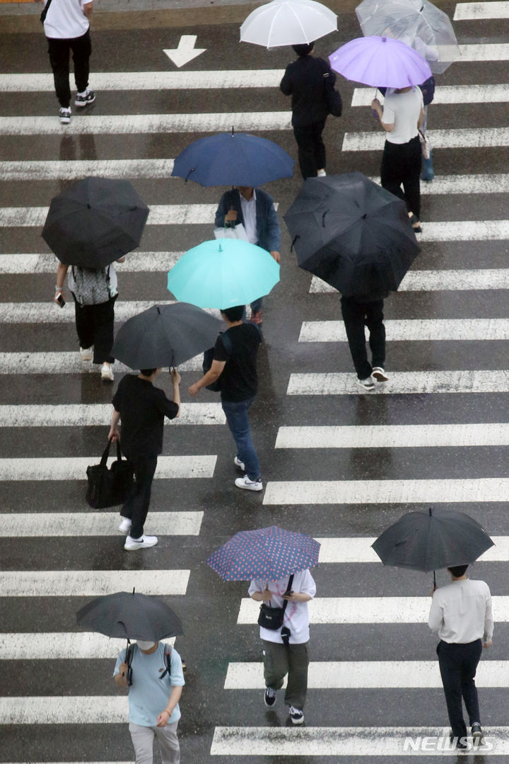 【NEWSIS】ソウルと首都圏に豪雨注意報が発令された29日午前、ソウル市竜山区の竜山駅近くで、傘をさし横断歩道を渡る人々。