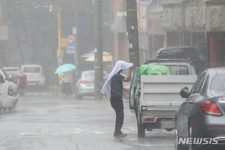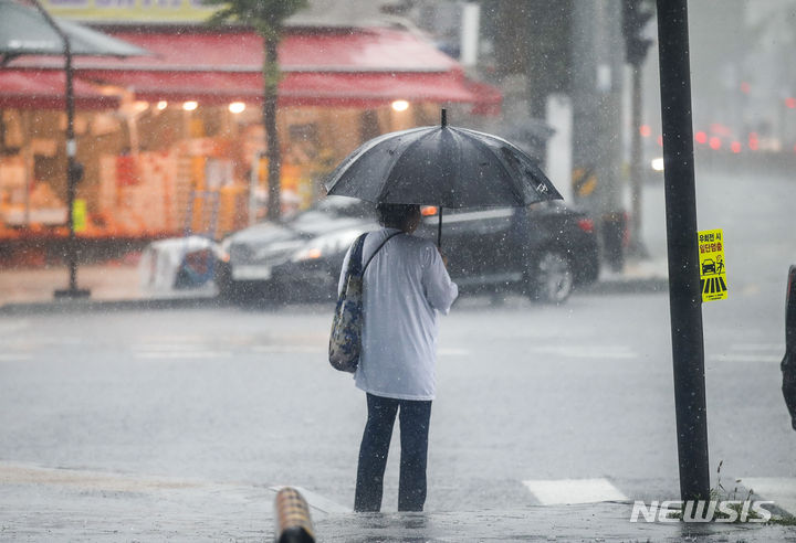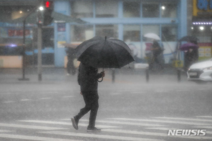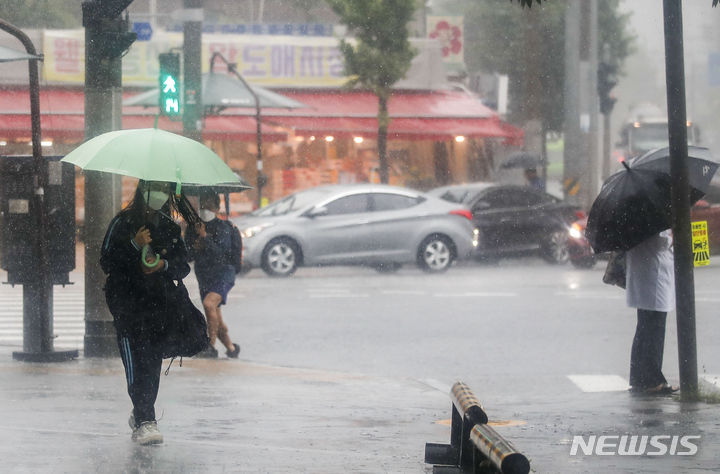 ソウルをはじめ首都圏に豪雨注意報が発令された29日午前、ソウル市銅雀区で、傘をさして横断歩道を渡る市民たち。