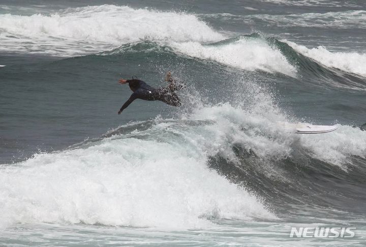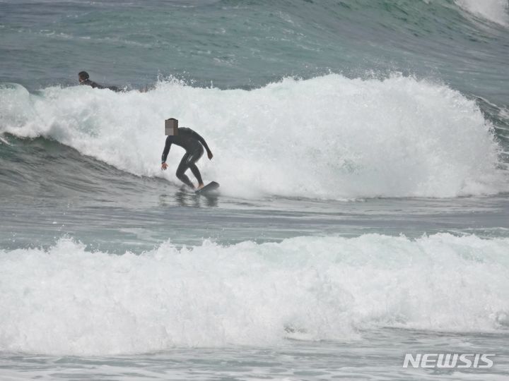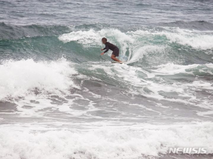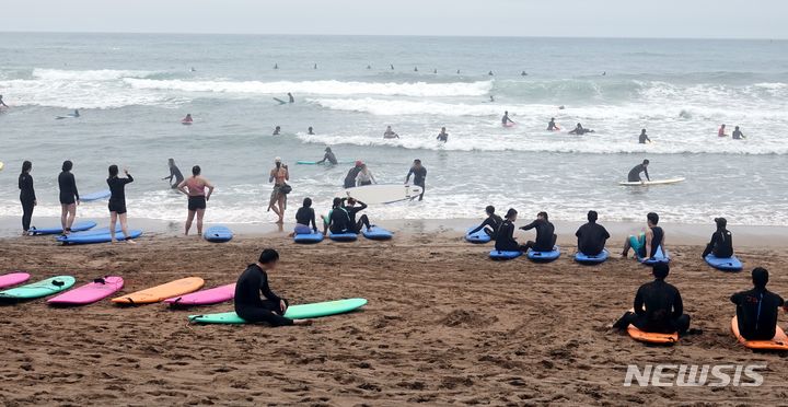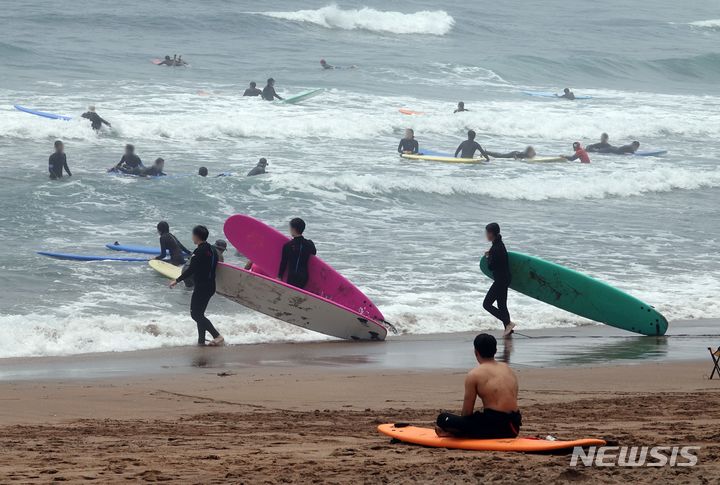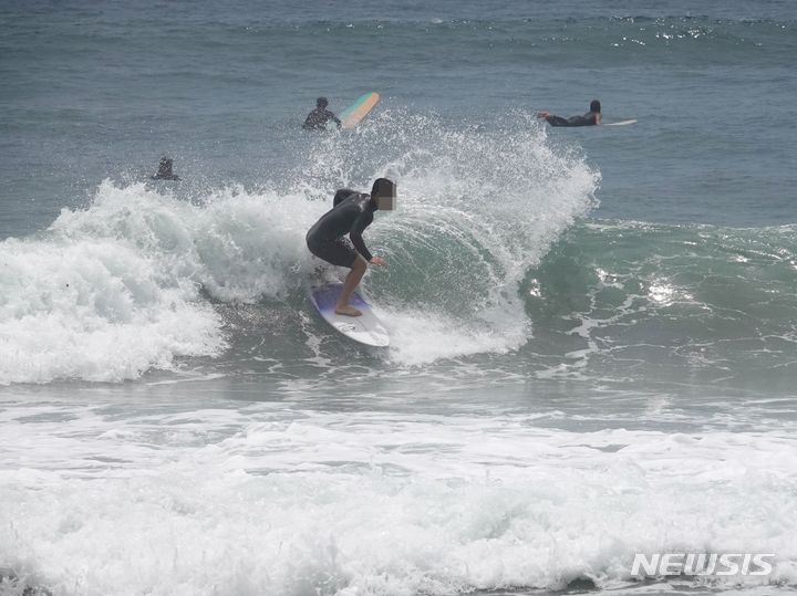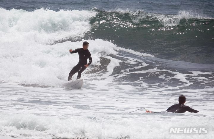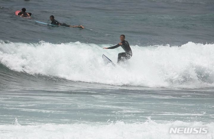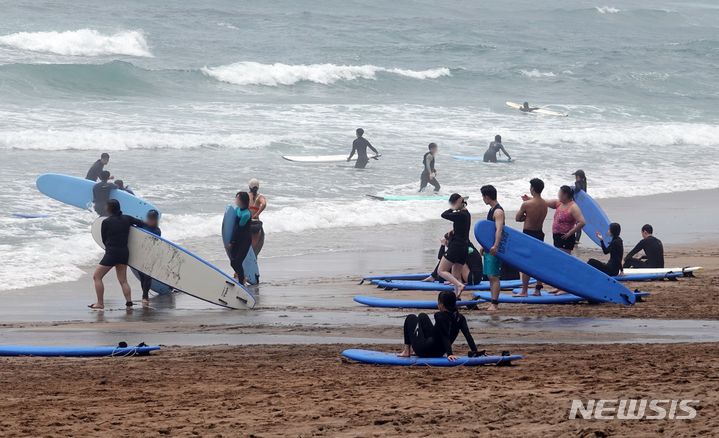 済州島内の指定海水浴場が本格オープンした1日午前、西帰浦市の中文穡達海水浴場でサーフィンを楽しむサーファーらの様子。