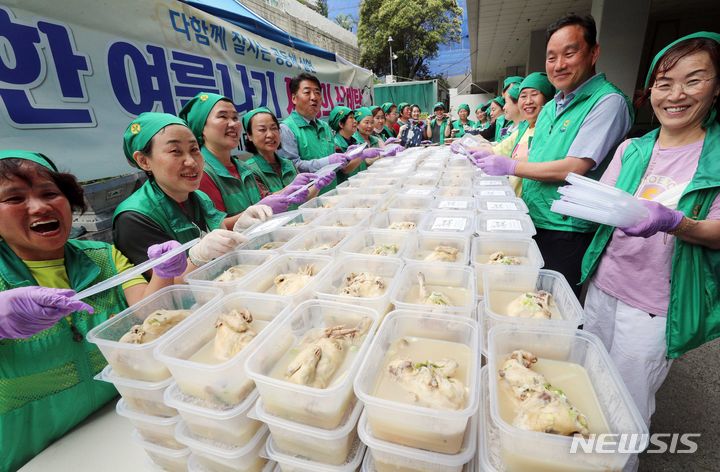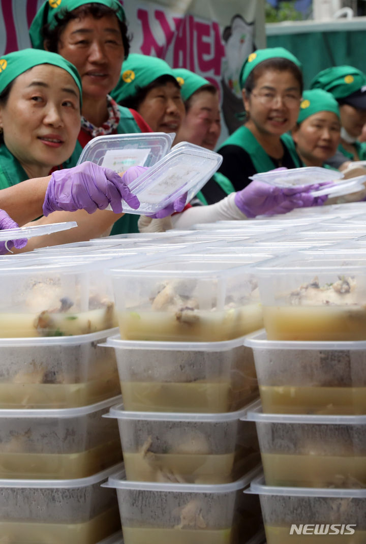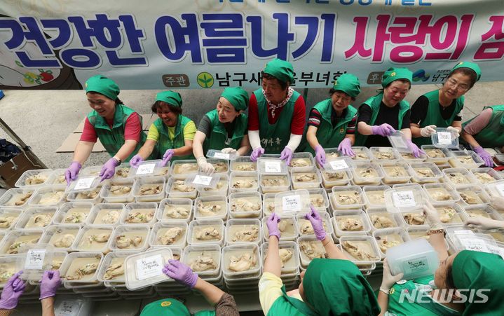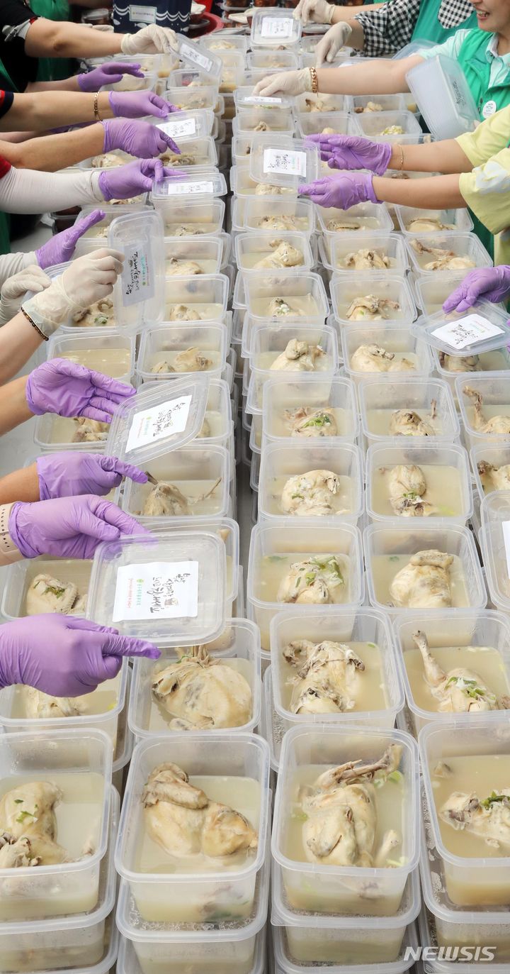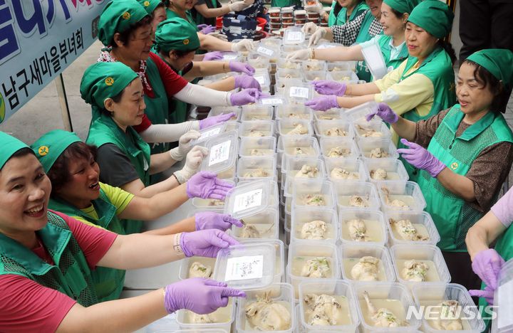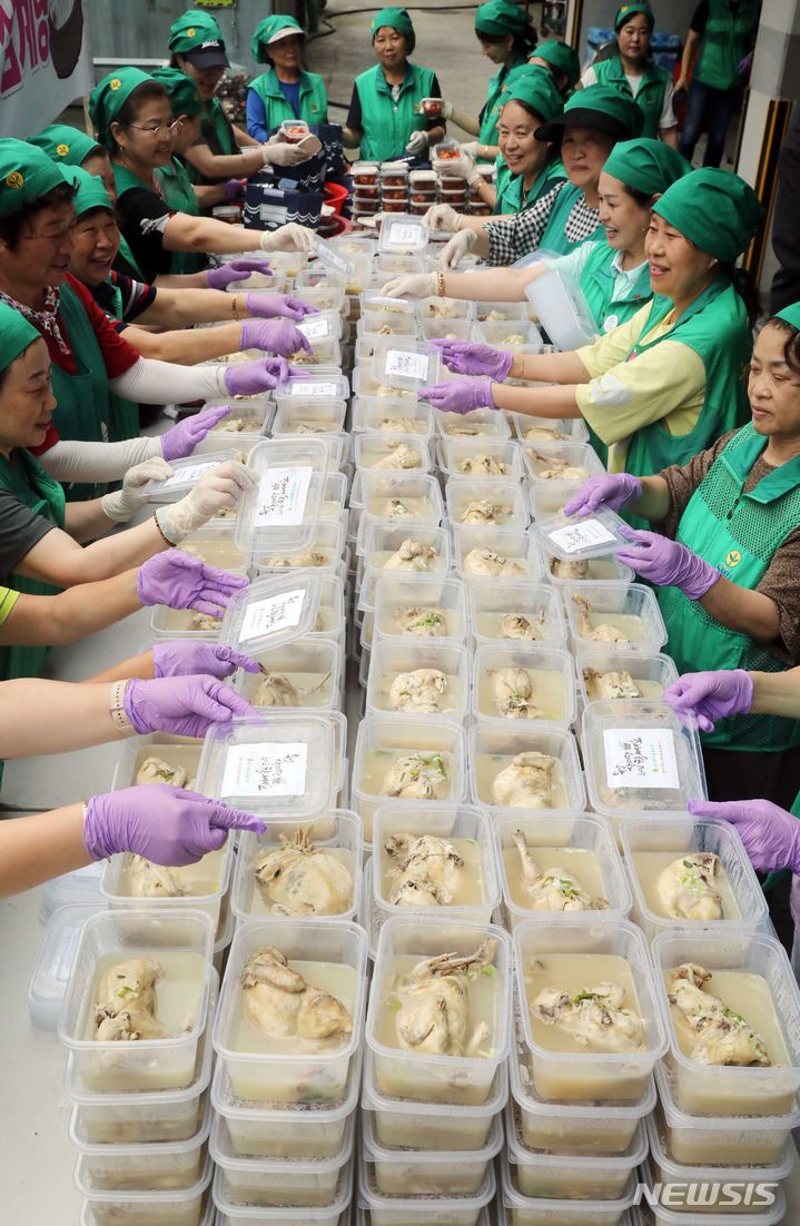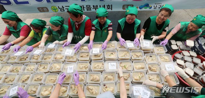 韓国の暦で最も暑い時期とされる「三伏」が始まる「初伏」を間近に控えた4日、釜山市南区庁の駐車場で、セマウル婦女会メンバーが独居高齢者、福祉館などに届ける400人分のサムゲタンの用意をしている様子。