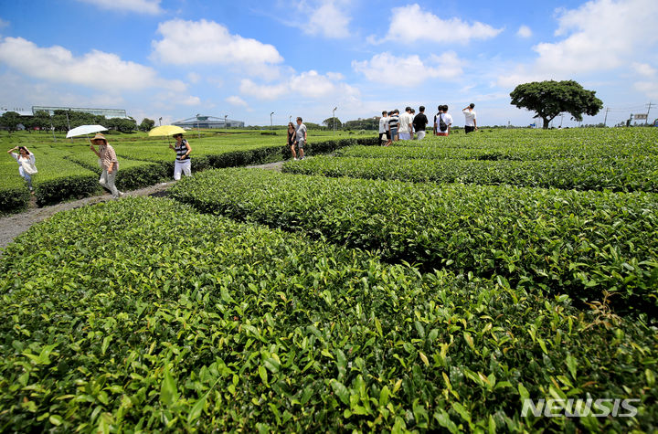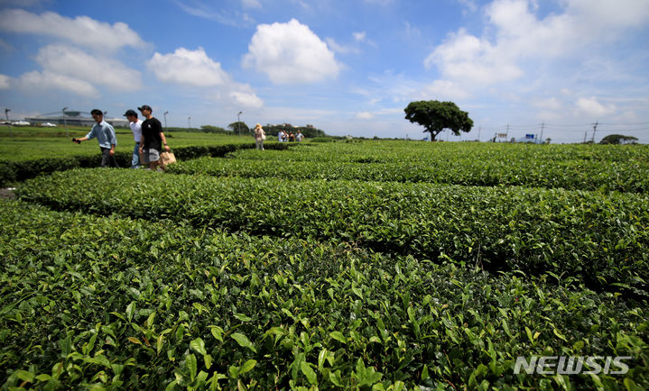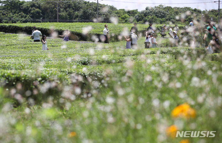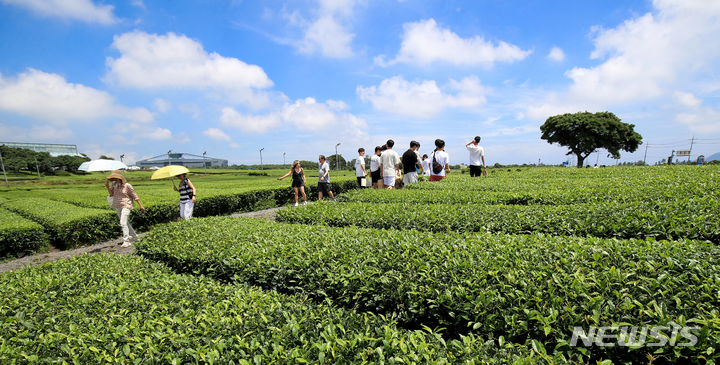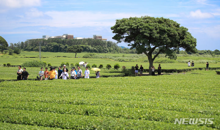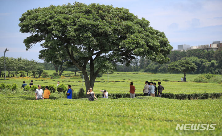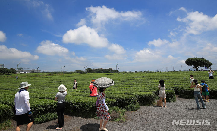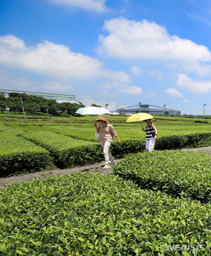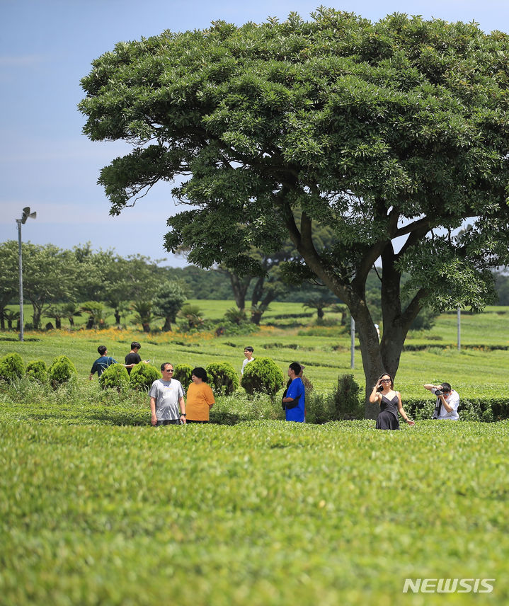 停滞前線が一時小康状態に入って暑い天気となった5日午後、済州島西帰浦市安徳面のオソルロクでは、茶畑を訪れた観光客が散策をしながら楽しいひとときを過ごしていた。