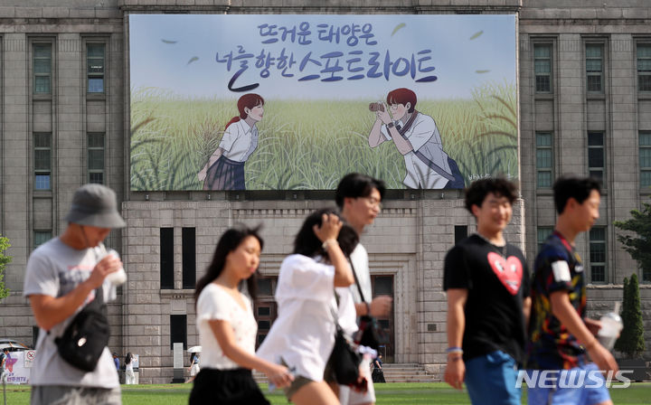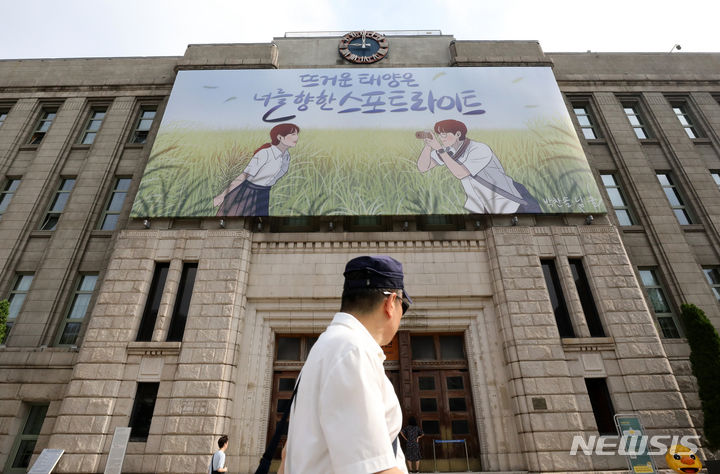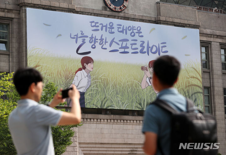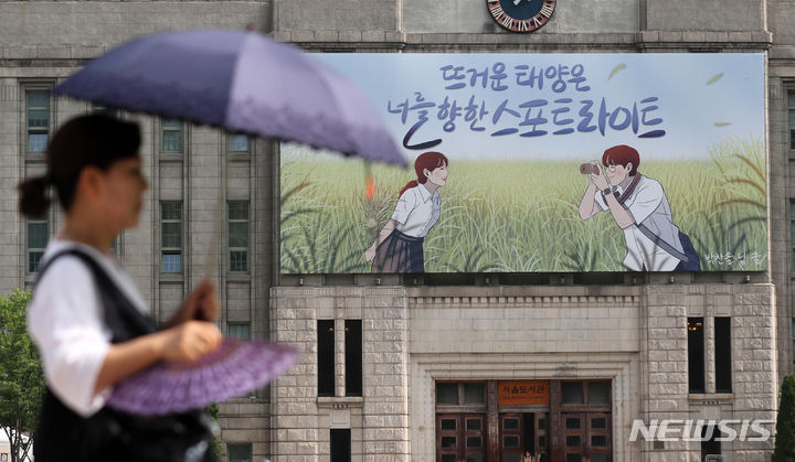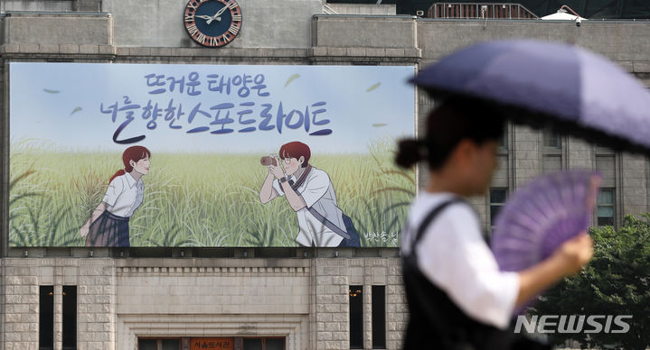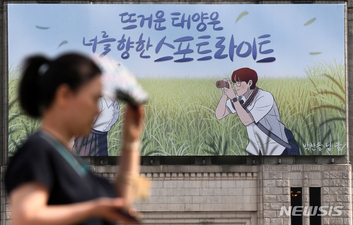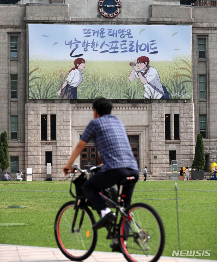 ソウル市中区のソウル図書館の外壁「ソウル・夢を刻むパネル」に6日午前、「熱い太陽はあなたへのスポットライト」というメッセージが掲げられていた。