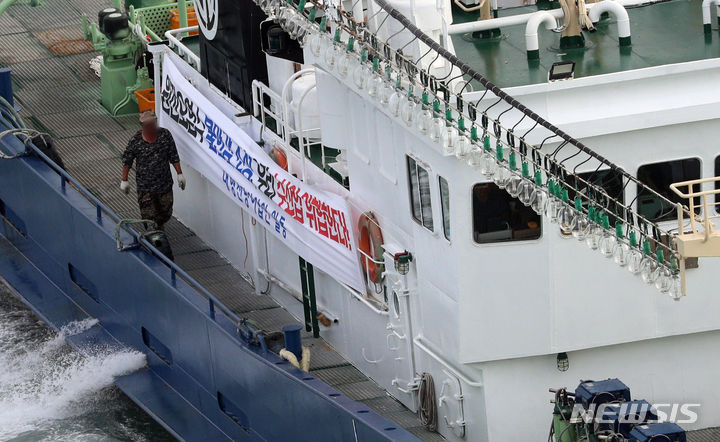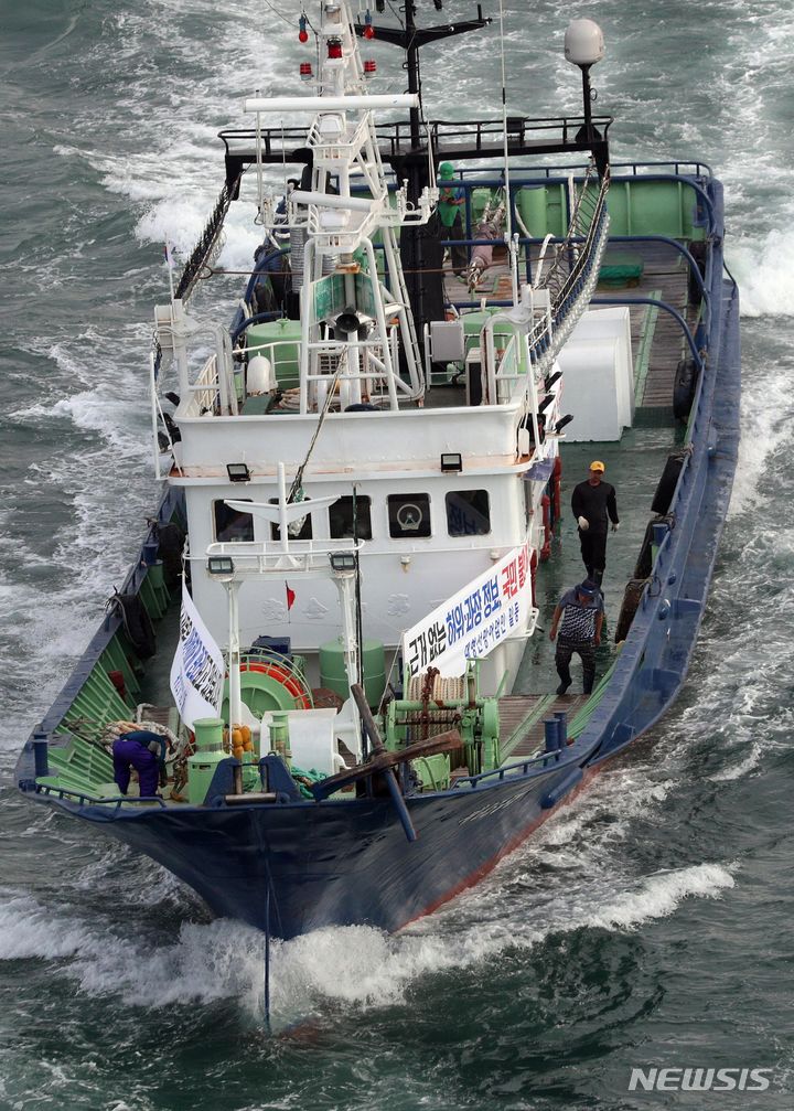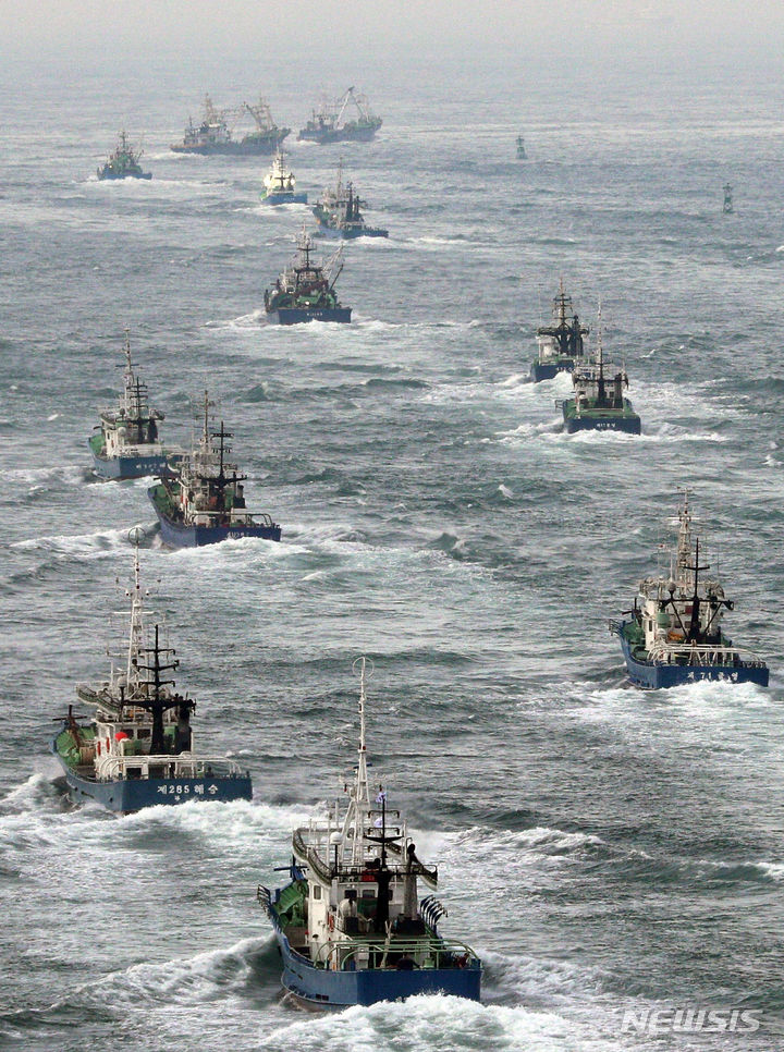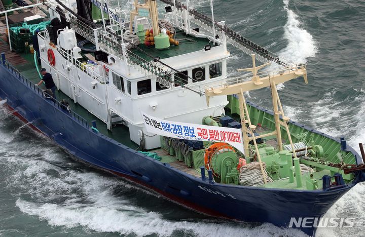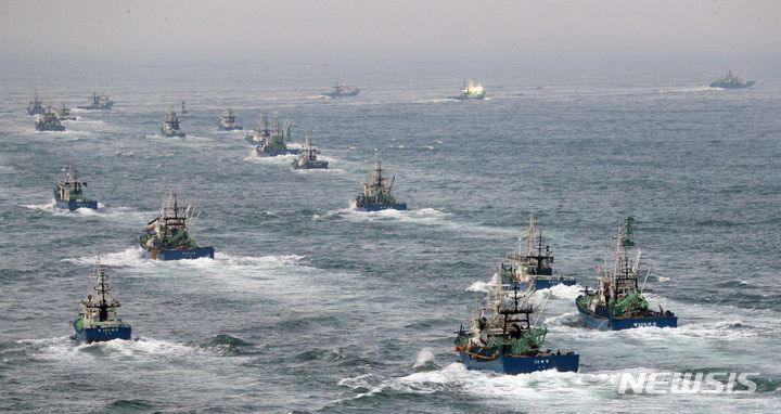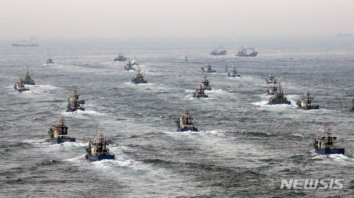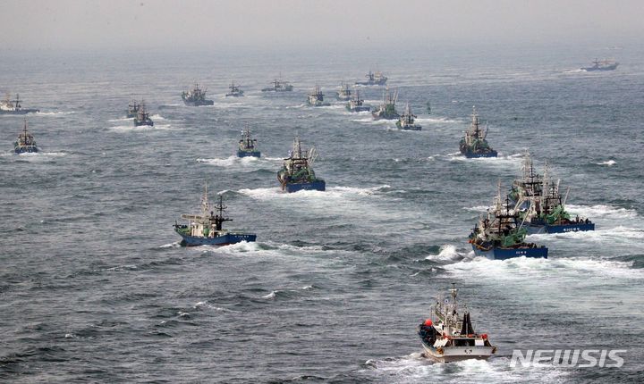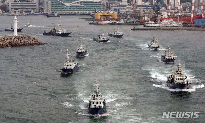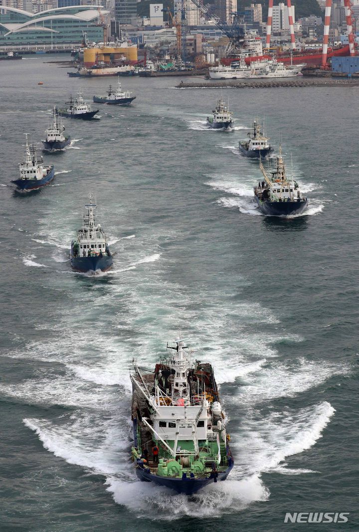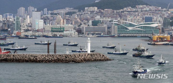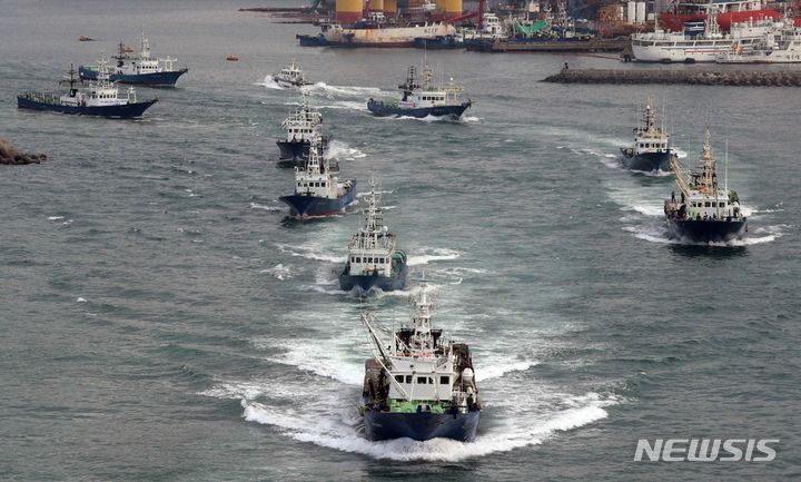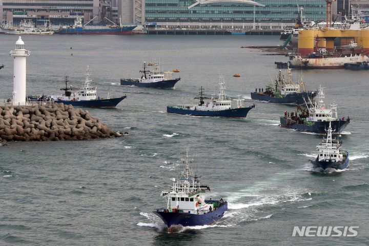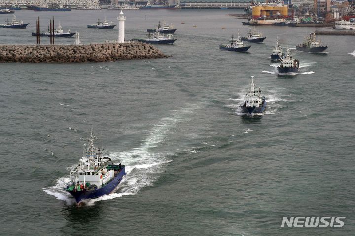 【NEWSIS】韓国のサバ漁獲量の80%以上を占める大型巻き網漁船60隻余りが2カ月間の休漁期を終え、6日午前、釜山市西区の釜山共同魚市場をいっぱいにするほどの大漁を目指し、一斉に出港した。日本が福島原発汚染水の海洋放出を決定したことから、各漁船は韓国産水産物の安全性をPRする横断幕などを掲げて出港した。