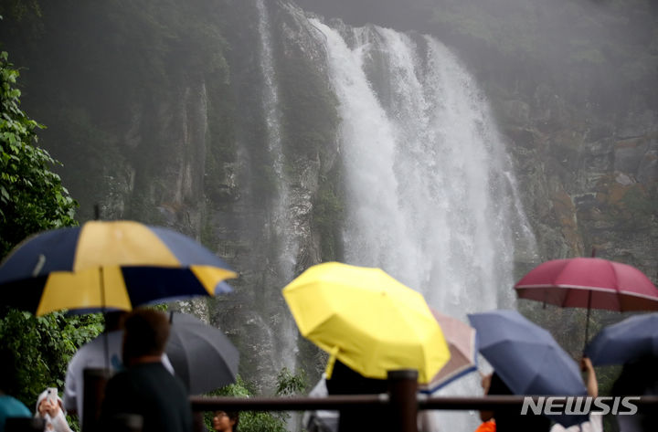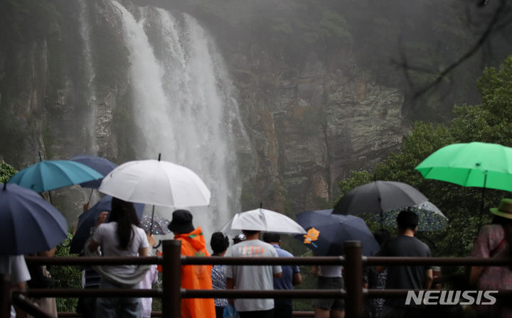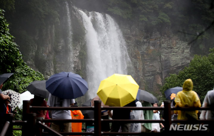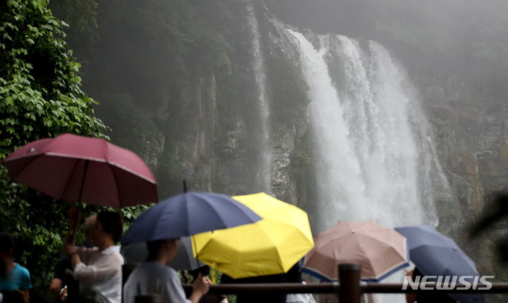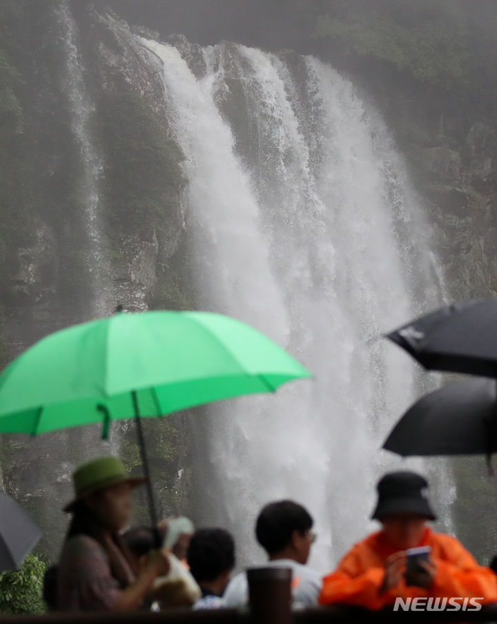 梅雨シーズンの強い雨が降った8日午後、済州島西帰浦市江汀洞のオント滝では、訪れた人々が豪快な水の流れが作り出す滝の壮観に見入っていた。