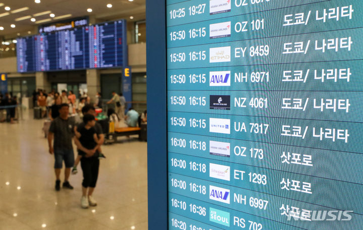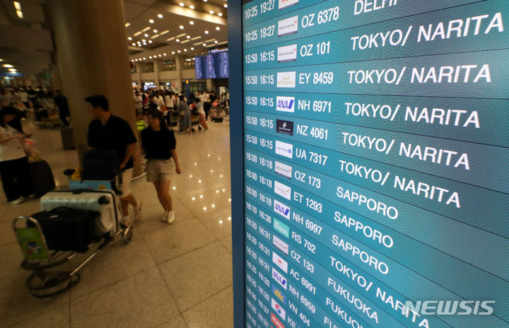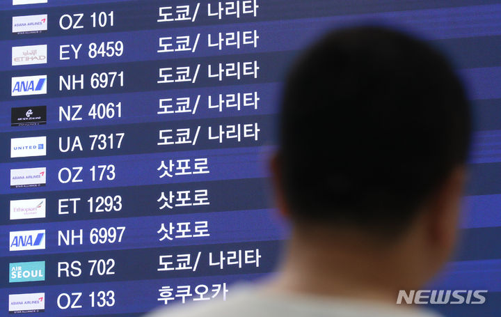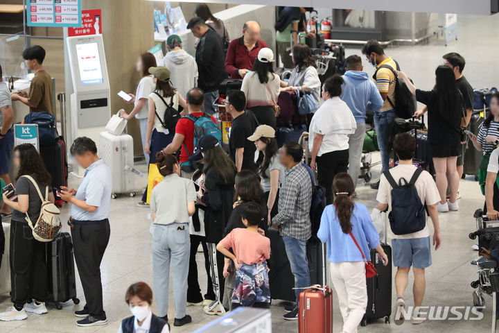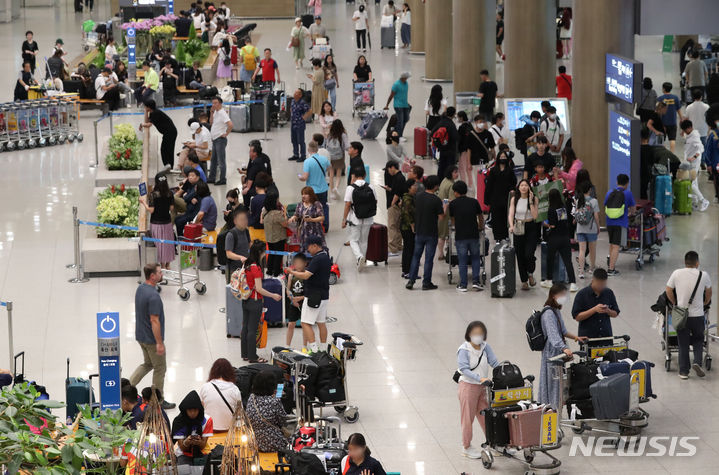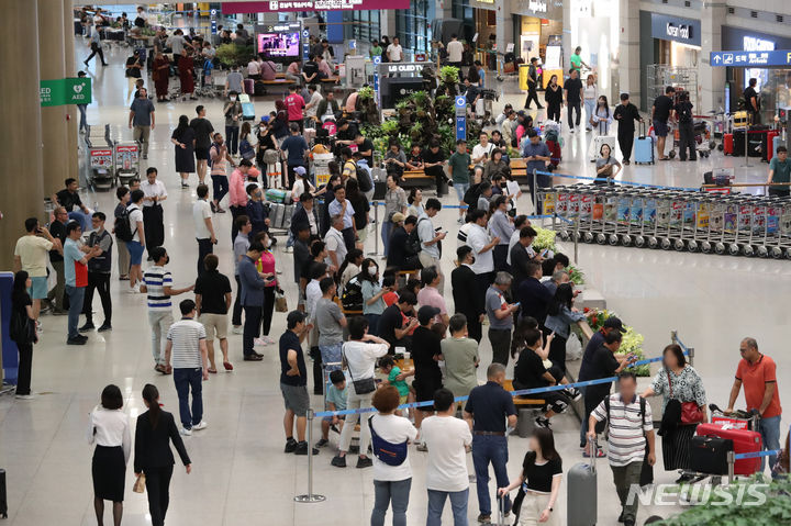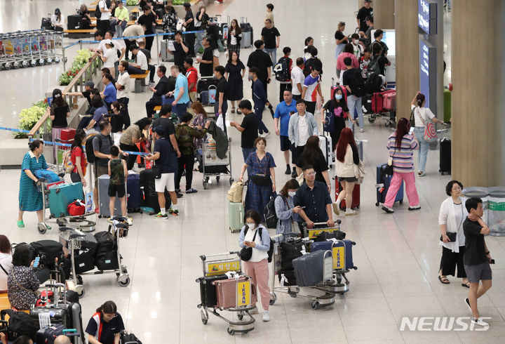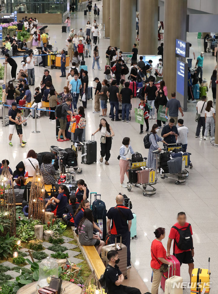 【NEWSIS】韓国観光公社によると、今年1月から5月までで韓国を訪れた外国人観光客の中で、日本人観光客が約66万6000人に達し、全外国人観光客の19.2%を占めて最も多かったことが分かった。写真は9日午後、仁川国際空港第1旅客ターミナル到着ロビーの様子。