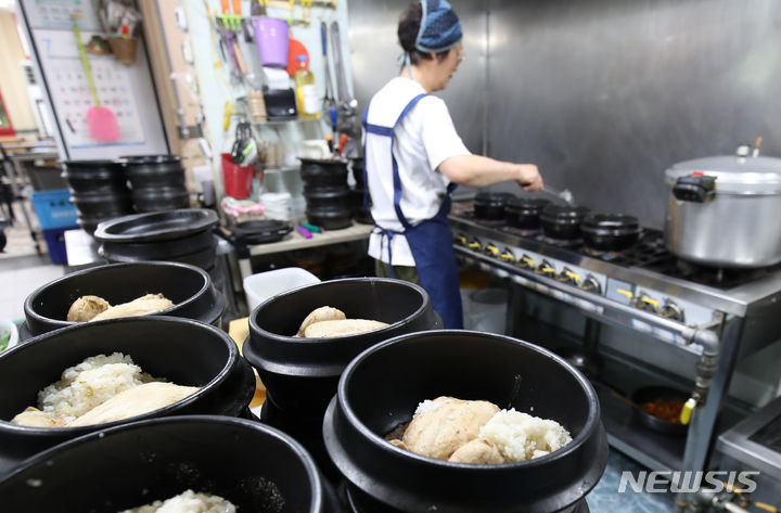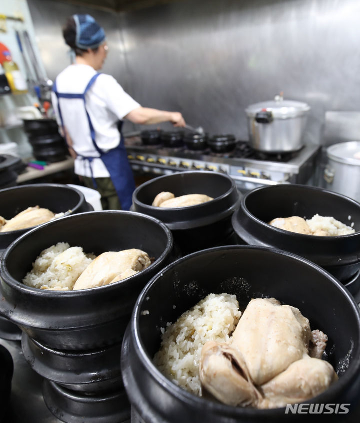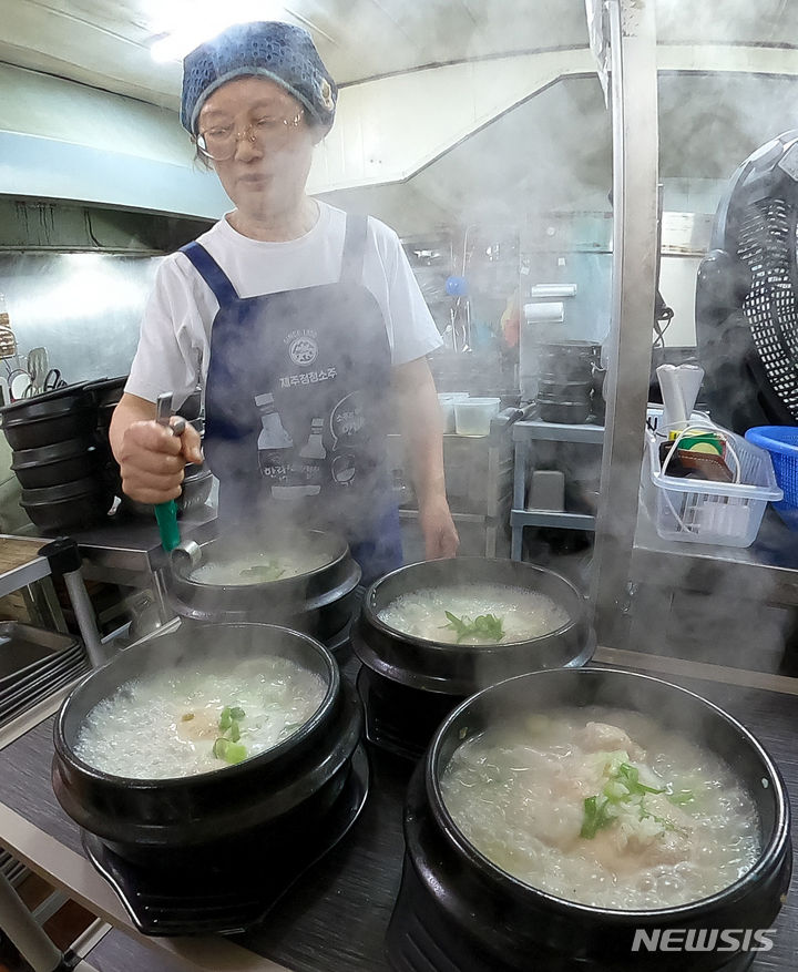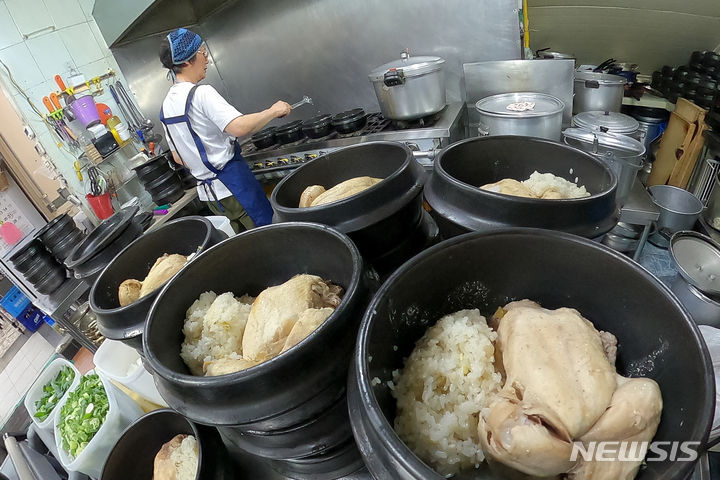 初伏(三伏の一つ、夏至後の3回目の庚〈かのえ〉の日)を翌日に控えた10日午前、済州市蓮洞の食堂で、店主の女性が客に提供する参鶏湯(サムゲタン=丸鶏の中に韓方薬の材料やもち米を詰めたスープ)の準備をしている様子。