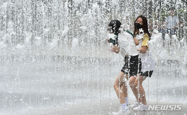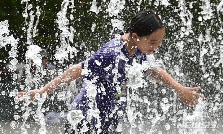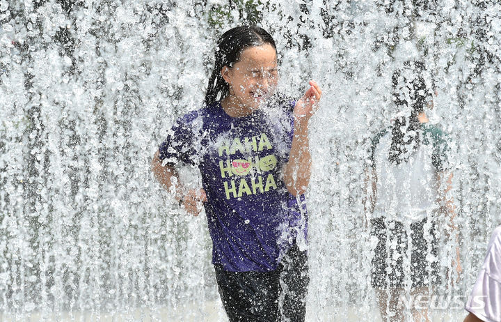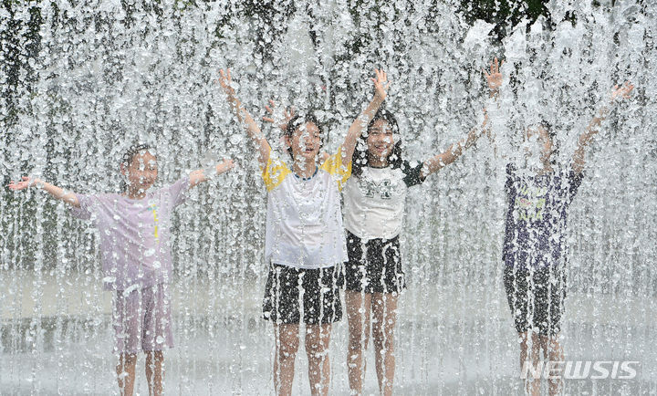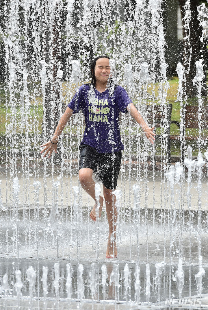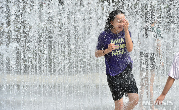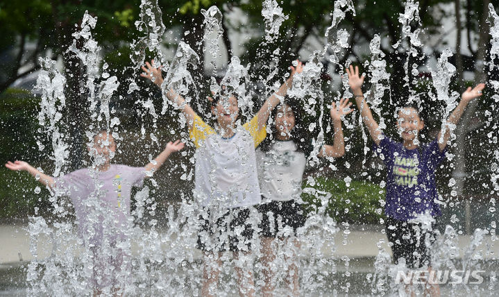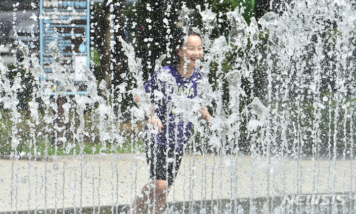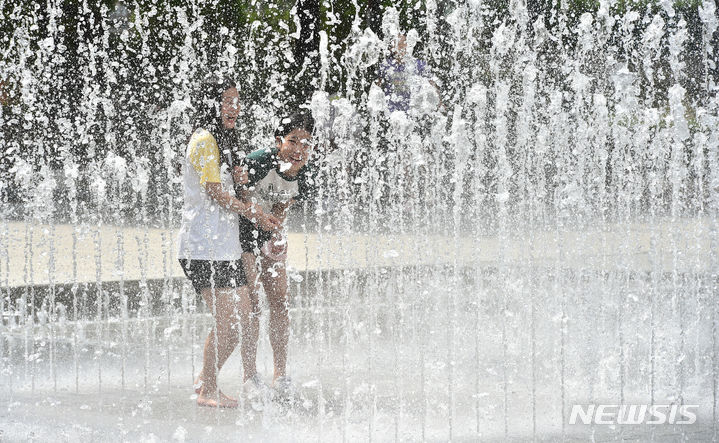 梅雨が一休みを迎え、暑さが戻って来た12日午後、大邱市西区の坪里公園の噴水では、子どもたちが水遊びをしていた。