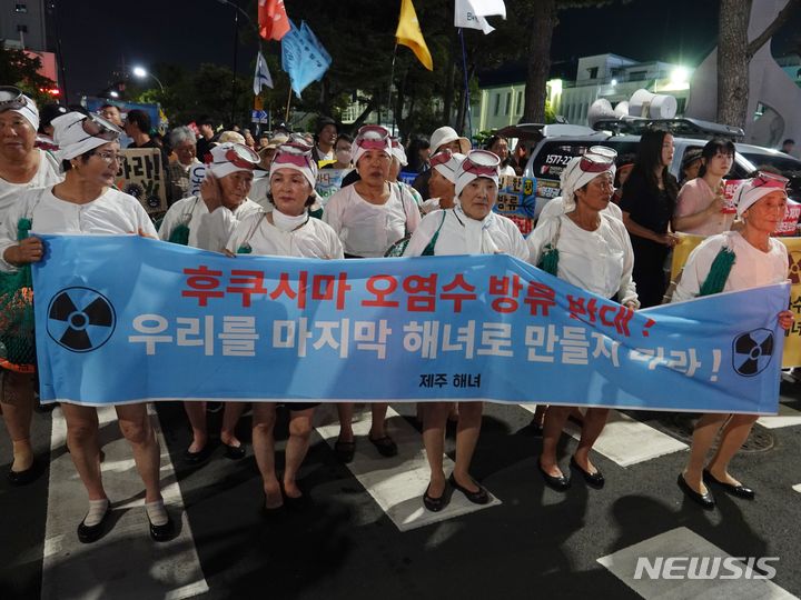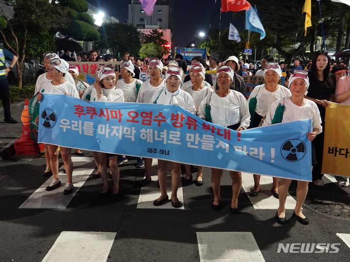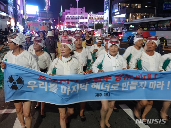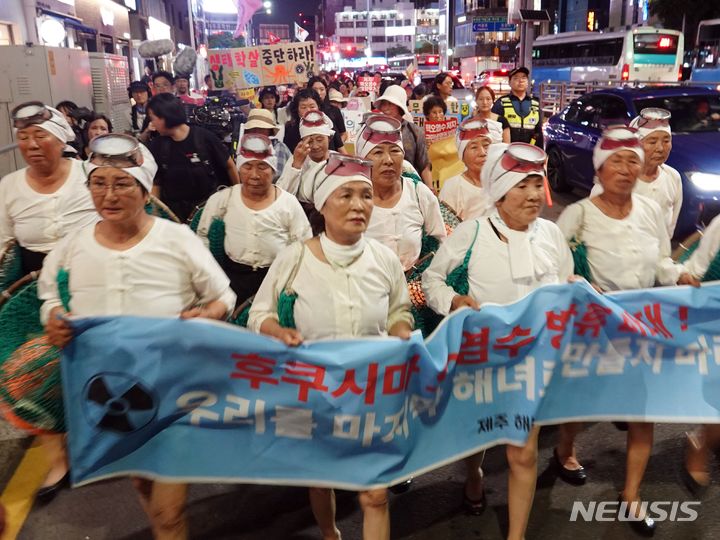 済州の海女たちが12日午後、済州市庁前で行われた第2回福島汚染水海洋放出及びCPTPP(環太平洋パートナーシップに関する包括的及び先進的な協定)阻止済州汎道民大会を終え、行進した。