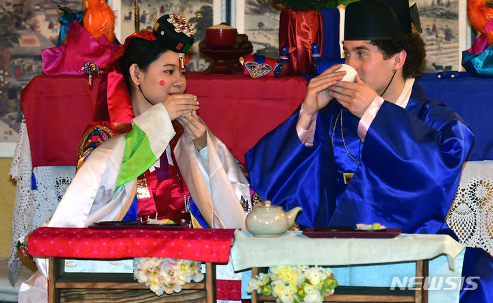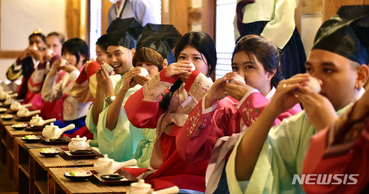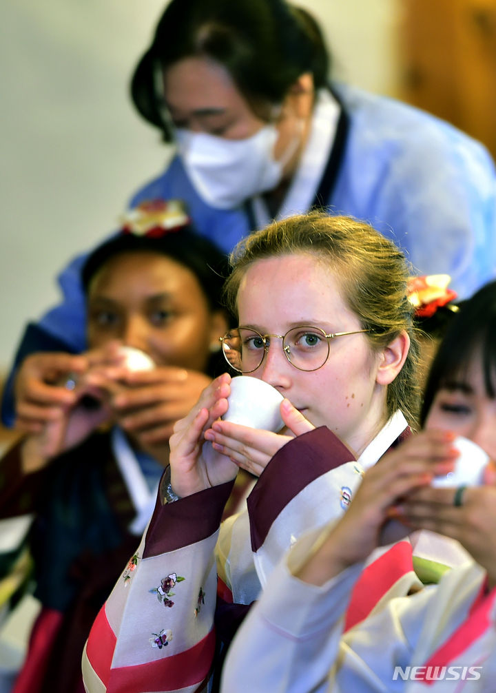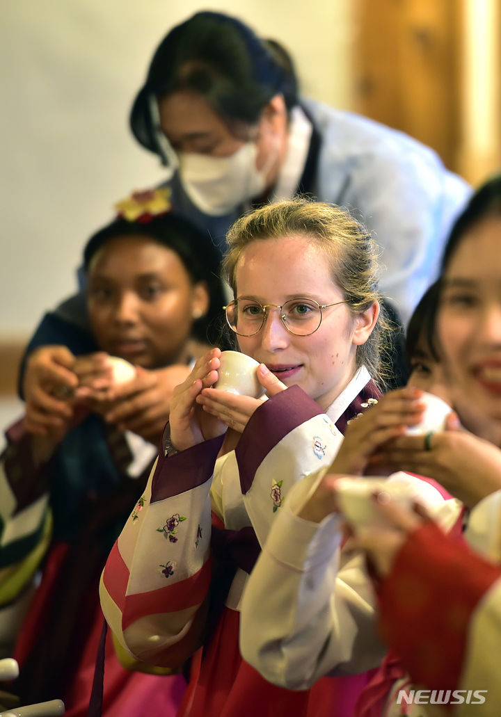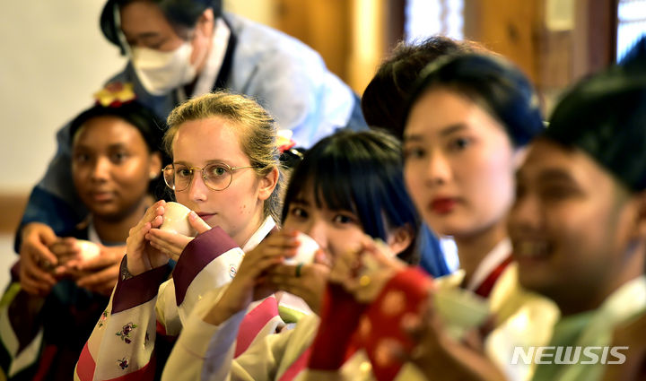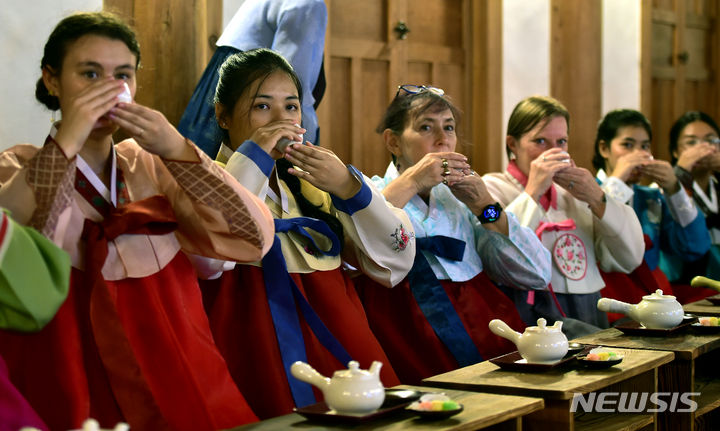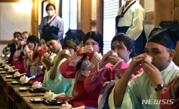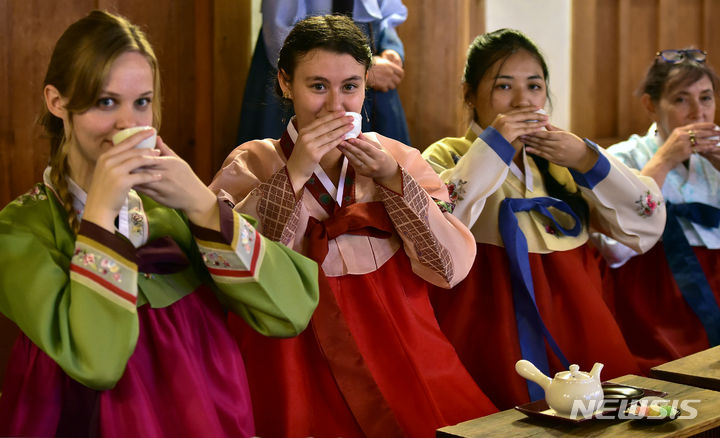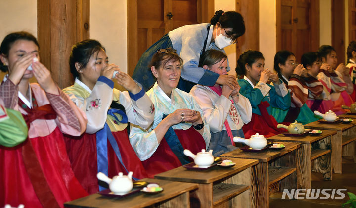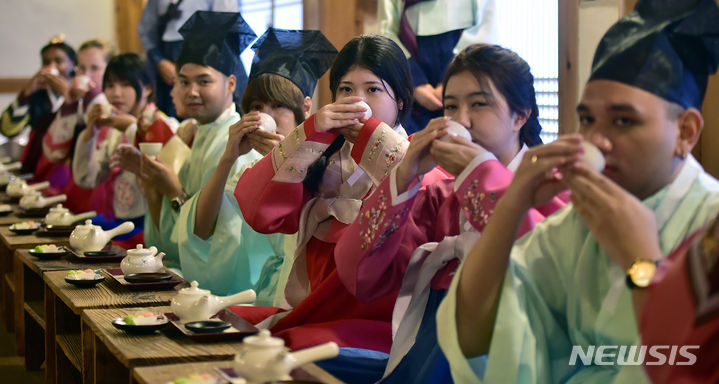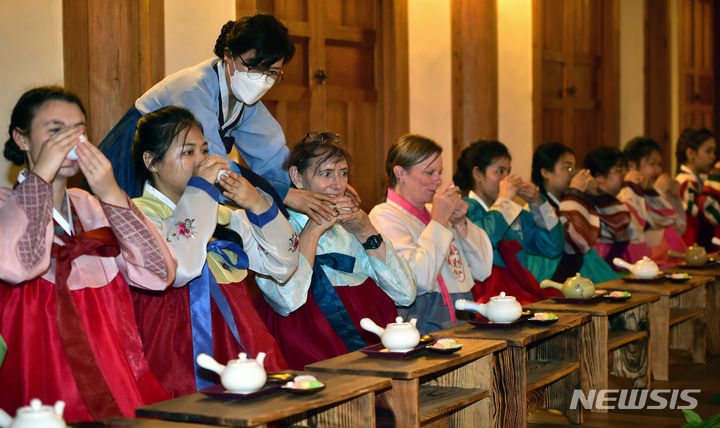 13日午後、啓明大学の韓学村(大邱市達西区)で開かれた「2023年度韓国語および韓国文化キャンプ」にて、外国人学生らが韓服を着て茶道体験をしている様子。