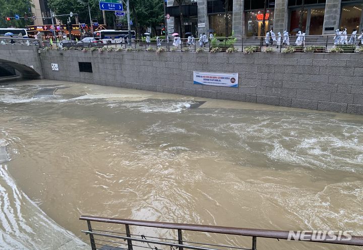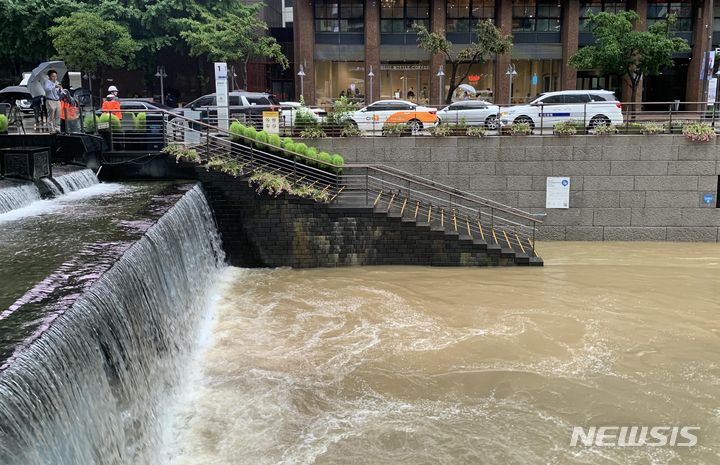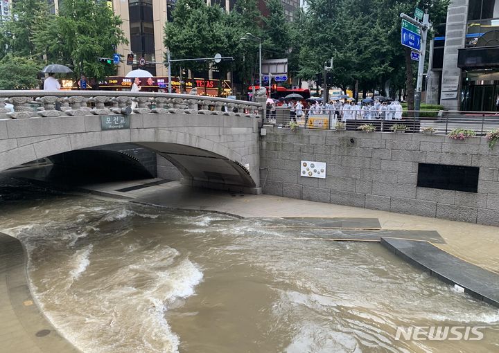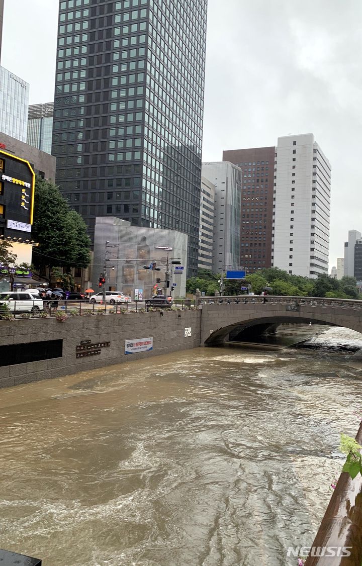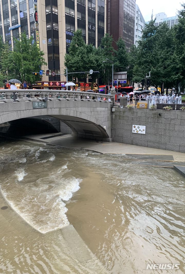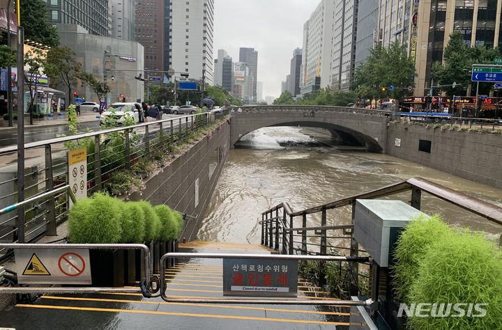 13日午後、大雨によって交通が規制された清渓川(ソウル市鍾路区)の様子。
