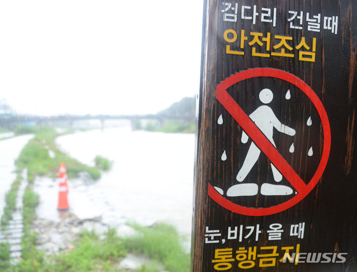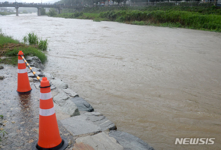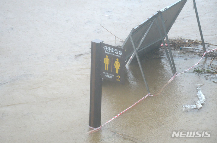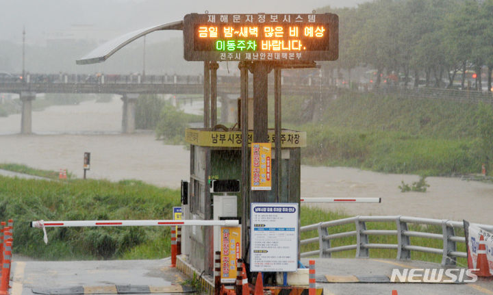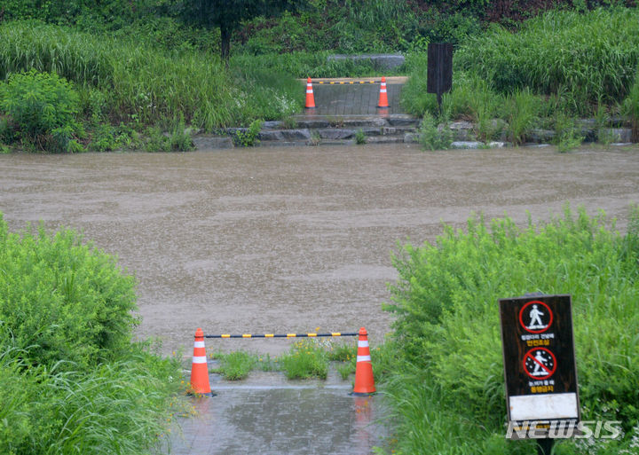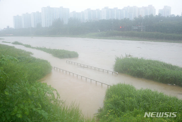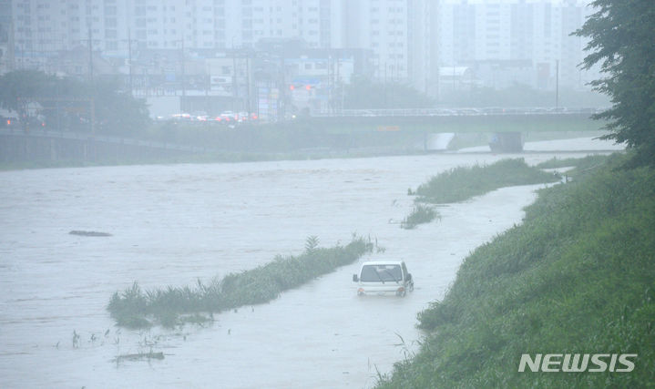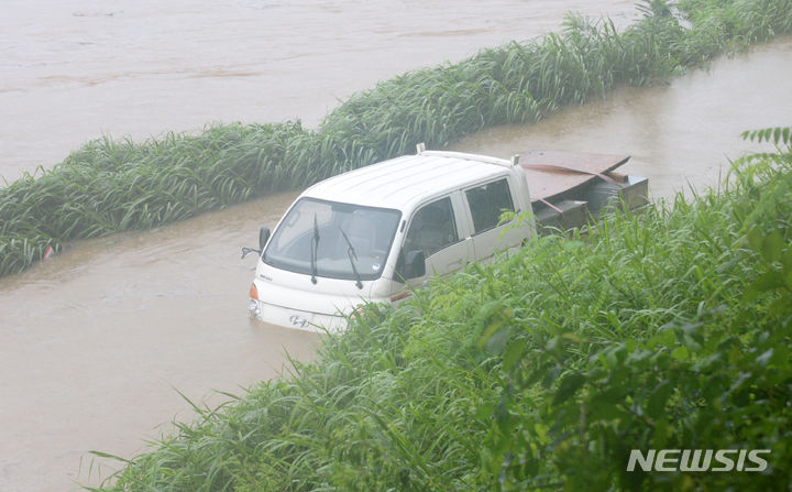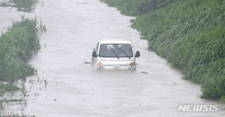 【NEWSIS】全羅北道のほとんどの地域で大雨警報が発令された14日、全羅北道全州市完山区の三川近くで、浸水した車。